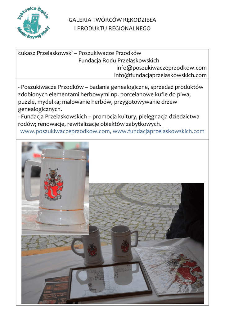GALERIA TWÓRCÓW RĘKODZIEŁA I PRODUKTU REGIONALNEGO Łukasz Przelaskowski – Poszukiwacze Przodków Fundacja Rodu Przelaskowskich [email protected] [email protected] - Poszukiwacze Przodków – badania genealogiczne, sprzedaż produktów zdobionych elementami herbowymi np. porcelanowe kufle do piwa, puzzle, mydełka; malowanie herbów, przygotowywanie drzew genealogicznych. - Fundacja Przelaskowskich – promocja kultury, pielęgnacja dziedzictwa rodów; renowacje, rewitalizacje obiektów zabytkowych. www.poszukiwaczeprzodkow.com, www.fundacjaprzelaskowskich.com