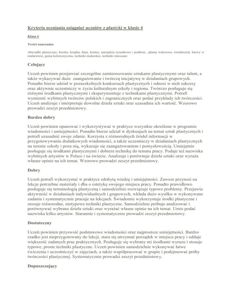 Kryteria oceniania osiągnięć uczniów z plastyki w klasie 4 Klasa 4 Treści nauczania: Abecadło plastyczne, kreska, kropka, linia, kontur, narzędzia rysunkowe i podłoża , plama walorowa, światłocień, barwy w malarstwie, gama kolorystyczna, techniki malarskie, techniki mieszane Celujący Uczeń powinien przejawiać szczególne zainteresowanie sztukami plastycznymi oraz talent, a także wykazywać duże zaangażowanie i twórczą inicjatywę w działaniach grupowych. Ponadto bierze udział w pozaszkolnych konkursach plastycznych i odnosi w nich sukcesy oraz aktywnie uczestniczy w życiu kulturalnym szkoły i regionu. Twórczo posługuje się różnymi środkami plastycznymi i eksperymentuje z technikami plastycznymi. Potrafi wymienić wybitnych twórców polskich i zagranicznych oraz podać przykłady ich twórczości. Uczeń analizuje i interpretuje dowolne dzieła sztuki oraz uzasadnia ich wartość. Wzorowo prowadzi zeszyt przedmiotowy. Bardzo dobry Uczeń powinien opanować i wykorzystywać w praktyce wszystkie określone w programie wiadomości i umiejętności. Ponadto bierze udział w dyskusjach na temat sztuk plastycznych i potrafi uzasadnić swoje zdanie. Korzysta z różnorodnych źródeł informacji w przygotowywaniu dodatkowych wiadomości, a także uczestniczy w działaniach plastycznych na terenie szkoły i poza nią, wykazuje się zaangażowaniem i pomysłowością. Umiejętnie posługuje się środkami plastycznymi i dobiera technikę do tematu pracy. Podaje też nazwiska wybitnych artystów w Polsce i na świecie. Analizuje i porównuje dzieła sztuki oraz wyraża własne opinie na ich temat. Wzorowo prowadzi zeszyt przedmiotowy. Dobry Uczeń potrafi wykorzystać w praktyce zdobytą wiedzę i umiejętności. Zawsze przynosi na lekcje potrzebne materiały i dba o estetykę swojego miejsca pracy. Ponadto prawidłowo posługuje się terminologią plastyczną i samodzielnie rozwiązuje typowe problemy. Przejawia aktywność w działaniach indywidualnych i grupowych, wkłada dużo wysiłku w wykonywane zadania i systematycznie pracuje na lekcjach. Świadomie wykorzystuje środki plastyczne i stosuje różnorodne, nietypowe techniki plastyczne. Samodzielnie próbuje analizować i porównywać wybrane dzieła sztuki oraz wyrażać własne opinie na ich temat. Umie podać nazwiska kilku artystów. Starannie i systematycznie prowadzi zeszyt przedmiotowy. Dostateczny Uczeń powinien przyswoić podstawowe wiadomości oraz najprostsze umiejętności. Bardzo rzadko jest nieprzygotowany do lekcji, stara się utrzymać porządek w miejscu pracy i oddaje większość zadanych prac praktycznych. Posługuje się wybrany mi środkami wyrazu i stosuje typowe, proste techniki plastyczne. Uczeń powinien samodzielnie wykonywać łatwe ćwiczenia i uczestniczyć w zajęciach, a także współpracować w grupie i podejmować próby twórczości plastycznej. Systematycznie prowadzi zeszyt przedmiotowy. Dopuszczający Uczeń powinien być przygotowany do większości lekcji (przynosić niezbędne materiały) oraz pomocą nauczyciela wykonywać proste ćwiczenia, uczestniczyć w zajęciach, wyjaśniać najważniejsze terminy. Prowadzi zeszyt przedmiotowy. Niedostateczny Uczeń nie opanował podstawowych wiadomości i umiejętności z zakresu przedmiotu. Nie uczestniczy w lekcji i nie jest przygotowywany do zajęć. Nie odrabia zadanych prac domowych. Świadomie lekceważy podstawowe obowiązki szkolne. Kryteria oceniania osiągnięć uczniów z plastyki w klasie 5 Klasa 5 Treści nauczania: faktura, kształt, kompozycja centralna, symetryczna, asymetryczna, zamknięta, otwarta, statyczna, dynamiczna, rytmiczna, perspektywa rzędowa, kulisowa, zbieżna, , powietrzna, malarska, Czym są dzieła sztuki? Rysunek, malarstwo Celujący Uczeń powinien przejawiać szczególne zainteresowanie sztukami plastycznymi oraz talent, a także wykazywać duże zaangażowanie i twórczą inicjatywę w działaniach grupowych. Ponadto bierze udział w pozaszkolnych konkursach plastycznych i odnosi w nich sukcesy oraz aktywnie uczestniczy w życiu kulturalnym szkoły i regionu. Twórczo posługuje się różnymi środkami plastycznymi i eksperymentuje z technikami plastycznymi. Potrafi wymienić wybitnych twórców polskich i zagranicznych oraz podać przykłady ich twórczości. Uczeń analizuje i interpretuje dowolne dzieła sztuki oraz uzasadnia ich wartość. Wzorowo prowadzi zeszyt przedmiotowy. Bardzo dobry Uczeń powinien opanować i wykorzystywać w praktyce wszystkie określone w programie wiadomości i umiejętności. Ponadto bierze udział w dyskusjach na temat sztuk plastycznych i potrafi uzasadnić swoje zdanie. Korzysta z różnorodnych źródeł informacji w przygotowywaniu dodatkowych wiadomości, a także uczestniczy w działaniach plastycznych na terenie szkoły i poza nią, wykazuje się zaangażowaniem i pomysłowością. Umiejętnie posługuje się środkami plastycznymi i dobiera technikę do tematu pracy. Podaje też nazwiska wybitnych artystów w Polsce i na świecie. Analizuje i porównuje dzieła sztuki oraz wyraża własne opinie na ich temat. Wzorowo prowadzi zeszyt przedmiotowy. Dobry Uczeń potrafi wykorzystać w praktyce zdobytą wiedzę i umiejętności. Zawsze przynosi na lekcje potrzebne materiały i dba o estetykę swojego miejsca pracy. Ponadto prawidłowo posługuje się terminologią plastyczną i samodzielnie rozwiązuje typowe problemy. Przejawia aktywność w działaniach indywidualnych i grupowych, wkłada dużo wysiłku w wykonywane zadania i systematycznie pracuje na lekcjach. Świadomie wykorzystuje środki plastyczne i stosuje różnorodne, nietypowe techniki plastyczne. Samodzielnie próbuje analizować i porównywać wybrane dzieła sztuki oraz wyrażać własne opinie na ich temat. Umie podać nazwiska kilku artystów. Starannie i systematycznie prowadzi zeszyt przedmiotowy. Dostateczny Uczeń powinien przyswoić podstawowe wiadomości oraz najprostsze umiejętn