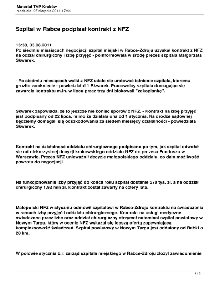 Materiał TVP Kraków niedziela, 07 sierpnia 2011 17:44 - Szpital w Rabce podpisał kontrakt z NFZ 13:38, 03.08.2011 Po siedmiu miesiącach negocjacji szpital miejski w Rabce-Zdroju uzyskał kontrakt z NFZ na odział chirurgiczny i izbę przyjęć - poinformowała w środę prezes szpitala Małgorzata Skwarek. - Po siedmiu miesiącach walki z NFZ udało się uratować istnienie szpitala, któremu groziło zamknięcie - powiedziała Skwarek. Pracownicy szpitala domagając się zawarcia kontraktu m.in. w lipcu przez trzy dni blokowali "zakopiankę". Skwarek zapowiada, że to jeszcze nie koniec sporów z NFZ. - Kontrakt na izbę przyjęć jest podpisany od 22 lipca, mimo że działała ona od 1 stycznia. Na drodze sądownej będziemy domagali się odszkodowania za siedem miesięcy działalności - powiedziała Skwarek. Kontrakt na działalność oddziału chirurgicznego podpisano po tym, jak szpital odwołał się od niekorzystnej decyzji krakowskiego oddziału NFZ do prezesa Funduszu w Warszawie. Prezes NFZ unieważnił decyzję małopolskiego oddziału, co dało możliwość powrotu do negocjacji. Na funkcjonowanie izby przyjęć do końca roku szpital dostanie 570 tys. zł, a na oddział chirurgiczny 1,92 mln zł. Kontrakt został zawarty na cztery lata. Małopolski NFZ w styczniu odmówił szpitalowi w Rabce-Zdroju kontraktu na świadczenia w ramach izby przyjęć i oddziału chirurgicznego. Kontrakt na usługi medyczne świadczone przez izbę oraz oddział chirurgiczny otrzymał natomiast szpital powiatowy w Nowym Targu, który w ocenie NFZ wykazał się lepszą ofertą zapewniającą kompleksowość świadczeń. Szpital powiatowy w Nowym Targu jest oddalony od Rabki o 20 km. W połowie stycznia b.r. zarząd szpitala miejskiego w Rabce-Zdroju złożył zawiadomienie 1/2 Materiał TVP Kraków niedziela, 07 sierpnia 2011 17:44 - do prokuratury dotyczące kontraktowania świadczeń medycznych przez krakowski NFZ. Zarząd szpitala wskazywał na nieprawidłowości w trakcie konkursów dla oddziałów wewnętrznego oraz izby przyjęć, a także przy rozpatrywaniu protestu. Krakowska prokuratura po postępowaniu sprawdzającym, odmówiła wszczęcia śledztwa w tej sprawie. Zdaniem prokuratury, procedura przeprowadzenia i rozstrzygnięcia konkursów była zgodna z przepisami. Zarząd szpitala w Rabce-Zdroju złożył odwołanie od tej decyzji. 12 sierpnia ma rozpocząć się proces sądowy w tej sprawie.(PAP) mmas link do artykułu i materiału wideo: http://www.tvp.pl/krakow/aktualnosci/spoleczne/szpital-w-rabce-podpisal-kontrakt-z-nf z/5017965 2/2