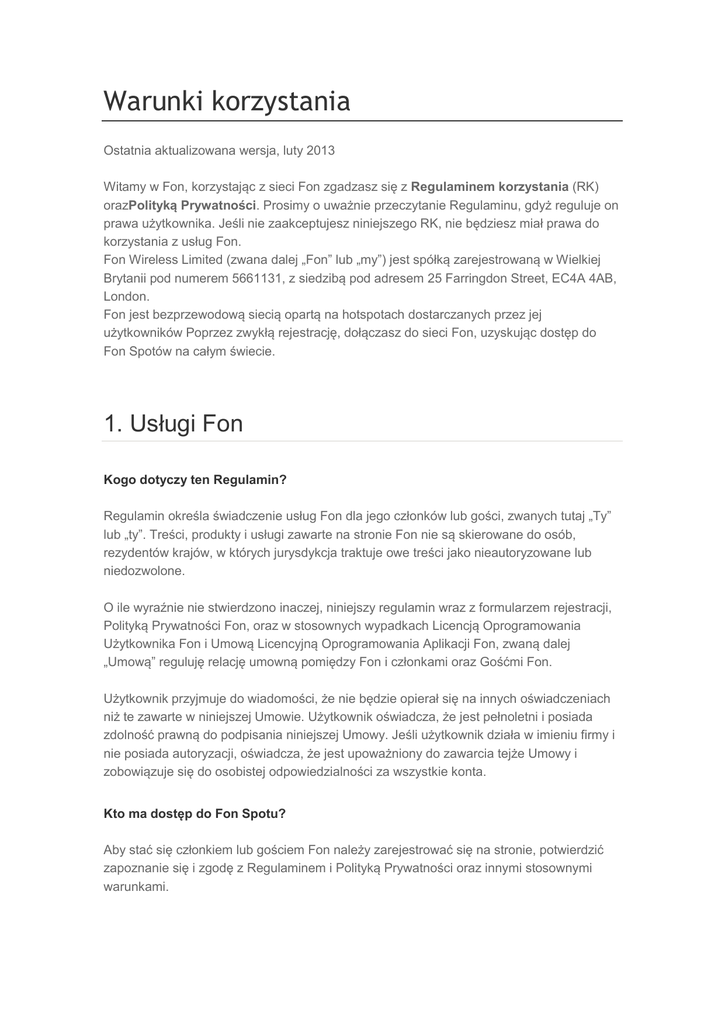 Warunki korzystania Ostatnia aktualizowana wersja, luty 2013 Witamy w Fon, korzystając z sieci Fon zgadzasz się z Regulaminem korzystania (RK) orazPolityką Prywatności. Prosimy o uważnie przeczytanie Regulaminu, gdyż reguluje on prawa użytkownika. Jeśli nie zaakceptujesz niniejszego RK, nie będziesz miał prawa do korzystania z usług Fon. Fon Wireless Limited (zwana dalej „Fon” lub „my”) jest spółką zarejestrowaną w Wielkiej Brytanii pod numerem 5661131, z siedzibą pod adresem 25 Farringdon Street, EC4A 4AB, London. Fon jest bezprzewodową siecią opartą na hotspotach dostarczanych przez jej użytkowników Poprzez zwykłą rejestrację, dołączasz do sieci Fon, uzyskując dostęp do Fon Spotów na całym świecie. 1. Usługi Fon Kogo dotyczy ten Regulamin? Regulamin określa świadczenie usług Fon dla jego członków lub gości, zwanych tutaj „Ty” lub „ty”. Treści, produkty i usługi zawarte na stronie Fon nie są skierowane do osób, rezydentów krajów, w których jurysdykcja traktuje owe treści jako nieautoryzowane lub niedozwolone. O ile wyraźnie nie stwierdzono inaczej, niniejszy regulamin wraz z formularzem rejestracji, Polityką Prywatności Fon, oraz w stosownych wypadkach Licencją Oprogramowania Użytkownika Fon i Umową Licencyjną Oprogramowania Aplikacji Fon, zwaną dalej „Umową” reguluję relację umowną pomiędzy Fon i członkami oraz Gośćmi Fon. Użytkownik przyjmuje do wiadomości, że nie będzie opierał się na innych oświadczeniach niż te zawarte w niniejszej Umowie. Użytkownik oświadcza, że jest pełnoletni i posiada zdolność prawną do podpisania niniejszej Umowy. Jeśli użytkownik działa w imieniu firmy i nie posiada autoryzacji, oświadcza, że jest upoważniony do zawarcia tejże Umowy i zobowiązuje się do osobistej odpowiedzialności za wszystkie konta. Kto ma dostęp do Fon Spotu? Aby stać się członkiem lub gościem Fon należy zarejestrować się na stronie, potwierdzić zapoznanie się i zgodę z Regulaminem i Polityką Prywatności oraz innymi stosownymi warunkami. Członkowie Fon posiadają wolny dostęp do jakiegokolwiek Fon Spotu. Goście Fon muszą zakupić przepustkę Fon lub na podstawie promocji bądź innej umowy między Fon a podmiotami zewnętrznymi otrzymać ograniczony, lub nieograniczony dostęp do Fon. Aby uzyskać dostęp do Fon Spotów, członkowie lub goście Fon powinni zarejestrować się na stronie Fon albo partnera Fon. Członkowie Fon powinni upewnić się, że umowa z ich dostawcą internetowym pozwala na podział sieci. Członkowie Fon są w pełni odpowiedzialni za przestrzeganie zobowiązań wobec dostawcy internetowego. Rejestracja Konta Fon W trakcie procesu rejestracyjnego Użytkownik poproszony będzie o podanie imienia i nazwiska oraz innych danych osobowych. W odpowiedzi należy podać dokładne i pełne informacje. Dane powinny być aktualne. W celu rejestracji do sieci Fon należy użyć formularza strony bądź portalu, podając pełne i poprawne dane. Użytkownik będzie miał możliwość wyboru nazwy użytkownika, którą powinien zapamiętać i przechowywać w bezpiecznym miejscu. Użytkownik powinien zapamiętać tajne hasło i nie dzielić się nim z innymi. Użytkownik ma obowiązek niezwłocznego informowania Fon o możliwości niewłaściwego wykorzystania nazwy użytkownika lub hasła, włączając kradzież, zgubę, nieupoważnione użycie, w celu natychmiastowej anulacji hasła i nazwy użytkownika. Fon będzie zwolniony z odpowiedzialności wynikającej z niewłaściwego wykorzystania nazwy użytkownika lub hasła przez nieupoważnione osoby trzecie, dopóki nie zostanie powiadomiony. Należy poinformować Fon o jakichkolwiek zmianach w danych formularza rejestracyjnego, jak również o jakichkolwiek późniejszych modyfikacjach tychże informacji. Wszelkie dane i informacje gromadzone i przechowywane przez Fon podlegają Polityce Prywatności Fon. Opis Usług Fon Usługi oferowane przez Fon polegają na: 1.Ułatwieniu Dostępu Do Fon Spotów 2.Dostarczeniu Informacji O Lokalizacji Fon Spotów 2.Potwierdzeniu Autentyczności I Rejestracji Dostępu 4.Oferowaniu Gościom Fon Dostępu Do Fon Spotów Poprzez Sprzedaż Przepustek Członkowie i Goście Fon mogą podłączyć się do sieci Fon przez jakiekolwiek dostępne Fon Spoty. Aby dołączyć do sieci Fon, Użytkownik musi wybrać Fon Spot, zalogować się na stronie albo na portalu Fon, używając nazwy użytkownika oraz hasła. Fon sprawdzi poprawność danych, zgodnie z niniejszą Umową i pozwoli na połączenie z Fon Spotem. Fon poinformuje Użytkownika o dostępnych aktualizacjach nowych wersji Oprogramowania Fon. 2. Członkowie Fon Jak stać się Członkiem Fon? Można stać się Członkiem Fon, akceptując niniejszą Umowę oraz zakupując router Fon lub router partnera Fon z zainstalowaną opcją Fon. W przypadku routera niekompatybilnego z Oprogramowaniem Fon Użytkownik będzie musiał nabyć go na stronie Fon. Instalacja i aktywacja Oprogramowania Fon oraz Fon Spotu. Po rejestracji w sieci Fon i akceptacji Umowy Użytkownik będzie mógł pobrać, zainstalować i używać Oprogramowania Fon. Instalacja Oprogramowania Fon powinna odbyć się zgodnie z instrukcjami opublikowanymi na stronie internetowej Fon. Należy zaakceptować i zgodzić się na klauzulę o nieodpowiedzialności Fon za wszystkie szkody wynikające z nieodpowiedniej instalacji oprogramowania Fon. W przypadku informacji o jakiejkolwiek właściwości sprzętu, oprogramowania czy usługi Fon mogącej wywołać szkodę, prosimy o natychmiastowy kontakt mejlowy na [email protected]. Fon Spot będzie aktywny i operacyjny po rejestracji i poprawnej instalacji Oprogramowania oraz Routera Fon. Po wejściu w życie niniejszej Umowy, Fon może publikować informacje o lokalizacji Fon Spotów każdego zarejestrowanego członka Fon. Jest to niezbędne, aby inni członkowie mieli dostęp do usługi. Goście portalu Fon będą mogli podł
