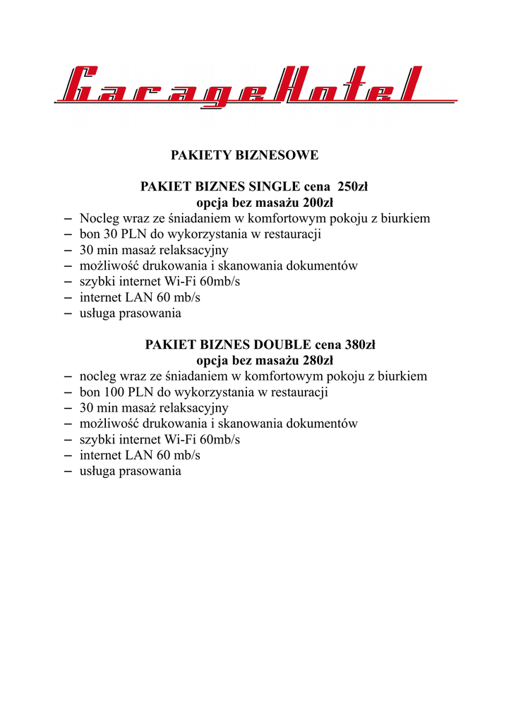 PAKIETY BIZNESOWE – – – – – – – PAKIET BIZNES SINGLE cena 250zł opcja bez masażu 200zł Nocleg wraz ze śniadaniem w komfortowym pokoju z biurkiem bon 30 PLN do wykorzystania w restauracji 30 min masaż relaksacyjny możliwość drukowania i skanowania dokumentów szybki internet Wi-Fi 60mb/s internet LAN 60 mb/s usługa prasowania – – – – – – – PAKIET BIZNES DOUBLE cena 380zł opcja bez masażu 280zł nocleg wraz ze śniadaniem w komfortowym pokoju z biurkiem bon 100 PLN do wykorzystania w restauracji 30 min masaż relaksacyjny możliwość drukowania i skanowania dokumentów szybki internet Wi-Fi 60mb/s internet LAN 60 mb/s usługa prasowania