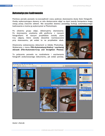 CHERUB Materiały dla użytkowników Photoshopa www.photoshop.sklep.pl Automatyczne kadrowanie Poniższa porada pozwala na oszczędność czasu podczas skanowania dużej ilości fotografii. Osoby wykorzystujące skanery w celu dostarczania zdjęć na dysk twardy komputera mogą swoją pracę znacznie ułatwić. Nie wszystkie skanery posiadają funkcję automatycznego kadrowania a można ją wykorzystać w Photoshopie. Po ułożeniu grupy zdjęć, dokonujemy skanowania. Po skanowaniu uzyskamy plik graficzny z naszymi fotografiami. W naszym przykładzie zostały użyte trzy zdjęcia, które zostały dowolnie rozmieszczone przy skanowaniu, jak widać to na przykładzie obok. Otwieramy zeskanowany dokument w Adobe Photoshop. Wybieramy z menu Plik>Automatyzuj>Kadruj i wyrównaj obrazek (File>Automate>Crop and Straighten Photos). To polecenie pozwala na rozdzielenie i wyrównanie fotografii zeskanowanego dokumentu, jak widać poniżej. Autor: cherub CHERUB GALLERY PHOTOSHOP
