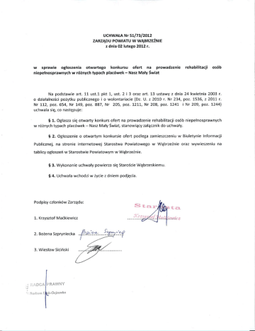 UCHWAŁA Nr 51/73/2012 ZARZĄDU POWIATU W WĄBRZEŹNIE z dnia 02 lutego 2012 r. w sprawie ogłoszenia otwartego konkursu ofert na prowadzenie rehabilitacji niepełnosprawnych w różnych typach placówek - Nasz Mały Świat osób Na podstawie art. 11 ust.l pkt 1, ust. 2 i 3 oraz art. 13 ustawy z dnia 24 kwietnia 2003 r. o działalności pożytku publicznego i o wolontariacie (Dz. U. z 2010 r. Nr 234, poz. 1536, z 2011 r. Nr 112, poz. 654, Nr 149, poz. 887, Nr 205, poz. 1211, Nr 208, poz. 1241 i Nr 209, poz. 1244) uchwala się, co następuje: § 1. Ogłasza się otwarty konkurs ofert na prowadzenie rehabilitacji osób niepełnosprawnych w różnych typach placówek - Nasz Mały Świat, stanowiący załącznik do uchwały. § 2. Ogłoszenie o otwartym konkursie ofert podlega zamieszczeniu w Biuletynie Informacji Publicznej, na stronie internetowej Starostwa Powiatowego w Wąbrzeźnie oraz wywieszeniu na tablicy ogłoszeń w Starostwie Powiatowym w Wąbrzeźnie. § 3. Wykonanie uchwały powierza się Staroście Wąbrzeskiemu. § 4. Uchwała wchodzi w życie z dniem podjęcia. Podpisy członków Zarządu: 1. Krzysztof Mackiewicz 2. Bożena Szpryniecka 3. Wiesław Siciński I RADCA PRAWNY Barbara L Ch-Gajewska UZASADNIENIE Zgodnie z art. 11 ustawy z dnia 24 kwietnia 2003 r. o działalności pożytku publicznego i o wolontariacie organy administracji publicznej wspierają lub powierzają realizację zadań ze sfery zadań publicznych, określonych w art. 4 wyżej cytowanej ustawy, przez organizacje pozarządowe oraz podmioty wymienione w art. 3 ust. 3, prowadzącym działalność statutową w danej dziedzinie. Wspieranie oraz powierzanie zadań odbywa się po przeprowadzeniu otwartego konkursu ofert. W myśl ustawy (art. 13 ust. 2) ogłoszenie wymaga ujęcia następujących informacji: 1) rodzaju zadania; 2) wysokości środków publicznych przeznaczonych na realizację zadania; 3) zasad przyznawania dotacji; 4) terminu i warunków realizacji zadania; 5) terminu składania ofert; 6) trybu i kryteriów stosowanych przy dokonywaniu wyboru ofert oraz terminu dokonania wyboru ofert; 7) zrealizowanych przez organ administracji publicznej w roku ogłoszenia otwartego konkursu ofert i w roku poprzednim zadań publicznych tego samego rodzaju i związanych z nimi kosztów, ze szczególnym uwzględnieniem wysokości dotacji przekazanych organizacjom pozarządowym i podmiotom, o których mowa w art. 3 ust. 3. Wobec powyższego podjęcie powyższej uchwały jest uzasadnione. Załącznik do UCHWAŁY Nr 51/73/2012 ZARZĄDU POWIATU W WĄBRZEŹNIE z dnia 02 lutego 2012 r. Zarząd Powiatu w Wąbrzeźnie ogłasza otwarty konkurs ofert na prowadzenie rehabilitacji osób niepełnosprawnych w różnych typach placówek - Nasz Mały Świat 1. Rodzaj zadania. Celem zadania jest prowadzenie rehabilitacji osób niepełnosprawnych w różnych typach placówek - Nasz Mały Świat. 2. Wysokość środków publicznych przeznaczonych na realizację zadania. Maksymalna kwota dotacji środków publicznych wynosi 17.000,00 zł. z przeznaczeniem na bieżącą działalność związaną z prowadzeniem rehabilitacji osób niepełnosprawnych w różnych typach placówek - Nasz Mały Świat. Kwota przeznaczona na bieżącą działalność może ulec zmianie w związku z podejmowaniem stosownych uchwał przez samorządy gminne, które partycypują w kosztach prowadzenia wypożyczalni. 3. Zasady przyznawania dotacji: 1) ze środków budżetu Powiatu Wąbrzeskiego może być przyznana dotacja na cele publiczne związana z realizacją zadania powiatu wykonywanego przez podmioty nie zaliczone do sektora finansów publicznych i nie działające w celu osiągnięcia zysku; 2) Zarząd Powiatu podejmuje decyzję o przyznaniu dotacji w ramach przewidzianych na ten cel środków w budżecie Powiatu oraz uzyskaniu informacji z samorządów gminnych o partycypacji w kosztach; 3) oferta organizacji pozarządowej, podmiotu wymienionego w art. 3 ust. 3 ustawy z dnia 24 kwietnia 2003r. o działalności pożytku publicznego i o wolontariacie, jednostki organizacyjnej wymienionej w art. 11 ust. 3 w/w ustawy na realizację zadania publicznego, winna być zgodna z rozporządzeniem Ministra Pracy i Polityki Społecznej z dnia 15 grudnia 2010r. w sprawie wzoru oferty i ramowego wzoru umowy dotyczących realizacji zadania publicznego oraz wzoru sprawozdania z wykonania tego zadania (Dz.U. z 2011r., Nr 6, poz. 25); 4) do oferty wnioskodawca winien dołączyć kopię aktualnego odpisu z KRS, innego rejestru lub ewidencji, zgodną z aktualnym stanem faktycznym i prawnym; 5) dofinansowanie będzie udzielone imiennie podmiotom uprawnionym tylko na zadania związane z realizacją zadań powiatu na podstawie składanych ofert; 6) oferta powinna zawierać podpisy i pieczątki imienne osób upoważnionych do składania oświadczeń woli w imieniu Wnioskodawcy; 7) w uzasadnionych wypadkach Zarząd Powiatu może zażądać dodatkowych informacji lub dokumentów; 8) nie mogą ubiegać się o przyznanie dotacji podmioty, które nie rozliczyły się w poprzednim okresie terminowo lub zadanie zostało wykonane niewłaściwie; 9) po wykonaniu zadania władze statutowe podmiotów zobowiązane są do przedstawienia, w określonym w umowie terminie, sprawozdania końcowego z wykonania zadania publicznego, zgodnie z rozporządzeniem Ministra Pracy i Polityki Społecznej z dnia 15 grudnia 2010r. w sprawie wzoru oferty i ramowego wzoru umowy dotyczących realizacji zadania publicznego oraz wzoru sprawozdania z wykonania tego zadania (Dz.U. z 2011r., Nr 6, poz. 25); 10) w przypadku niewykorzystania w pełni środków finansowych, rezygnacji lub niepełnej realizacji zleconego zadania, podmiot, który otrzymał dotację powinien niezwłocznie zwrócić pozostałą kwotę na rachunek bankowy Starostwa Powiatowego w Wąbrzeźnie; 11) Zarząd Powiatu podejmując decyzję o przyznaniu dotacji kieruje się: a) oceną formalną i merytoryczną zadania, b) kosztem realizacji zadania, c