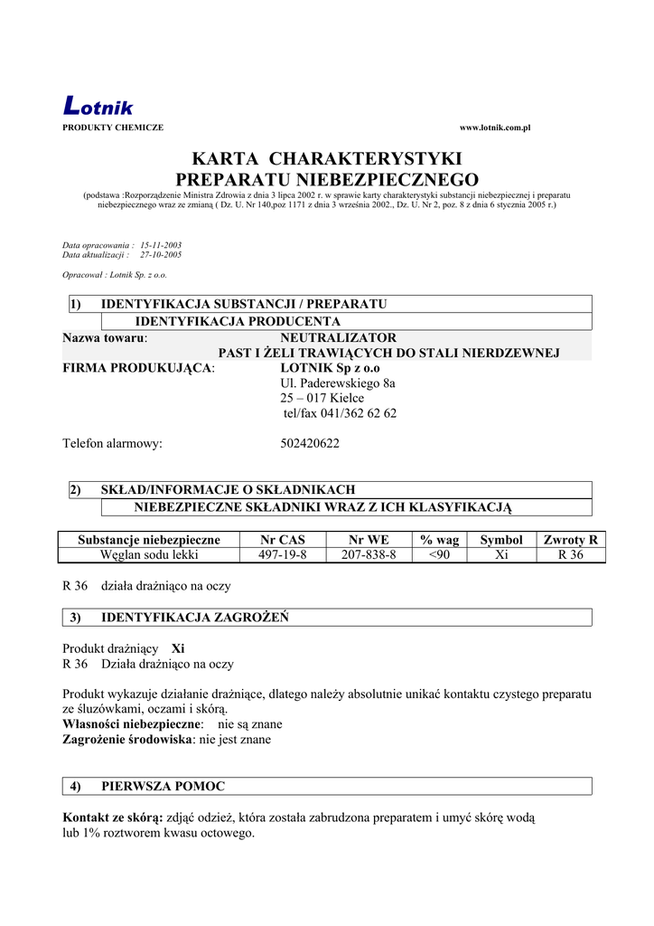 Lotnik PRODUKTY CHEMICZE www.lotnik.com.pl KARTA CHARAKTERYSTYKI PREPARATU NIEBEZPIECZNEGO (podstawa :Rozporządzenie Ministra Zdrowia z dnia 3 lipca 2002 r. w sprawie karty charakterystyki substancji niebezpiecznej i preparatu niebezpiecznego wraz ze zmianą ( Dz. U. Nr 140,poz 1171 z dnia 3 września 2002., Dz. U. Nr 2, poz. 8 z dnia 6 stycznia 2005 r.) Data opracowania : 15-11-2003 Data aktualizacji : 27-10-2005 Opracował : Lotnik Sp. z o.o. 1) IDENTYFIKACJA SUBSTANCJI / PREPARATU IDENTYFIKACJA PRODUCENTA Nazwa towaru: NEUTRALIZATOR PAST I ŻELI TRAWIĄCYCH DO STALI NIERDZEWNEJ FIRMA PRODUKUJĄCA: LOTNIK Sp z o.o Ul. Paderewskiego 8a 25 – 017 Kielce tel/fax 041/362 62 62 Telefon alarmowy: 2) SKŁAD/INFORMACJE O SKŁADNIKACH NIEBEZPIECZNE SKŁADNIKI WRAZ Z ICH KLASYFIKACJĄ Substancje niebezpieczne Węglan sodu lekki R 36 3) 502420622 Nr CAS 497-19-8 Nr WE 207-838-8 % wag <90 Symbol Xi Zwroty R R 36 działa drażniąco na oczy IDENTYFIKACJA ZAGROŻEŃ Produkt drażniący Xi R 36 Działa drażniąco na oczy Produkt wykazuje działanie drażniące, dlatego należy absolutnie unikać kontaktu czystego preparatu ze śluzówkami, oczami i skórą. Własności niebezpieczne: nie są znane Zagrożenie środowiska: nie jest znane 4) PIERWSZA POMOC Kontakt ze skórą: zdjąć odzież, która została zabrudzona preparatem i umyć skórę wodą lub 1% roztworem kwasu octowego. Kontakt z oczami: jeżeli poszkodowany posiada szkła kontaktowe należy niezwłocznie je usunąć oraz natychmiast przemyć dokładnie oczy dużą ilością czystej wody. W przypadku podrażnienia zgłosić się do lekarza okulisty. Spożycie: nie prowokować wymiotów, ponieważ istnieje ryzyko zachłyśnięcia się i przedostania się preparatu do płuc. Przepłukać jamę ustną dużą ilością wody. Podać do wypicia dużą ilość wody lub mleka. Nigdy nie podawać niczego doustnie osobie nieprzytomnej. Należy skontaktować się z lekarzem i przedstawić etykietę preparatu. Wdychanie: w przypadku narażenia inhalacyjnego wynieść poszkodowanego z miejsca narażenia na świeże powietrze, okryć kocem i zapewnić spokój. Jeżeli wystąpią jakiekolwiek niepokojące objawy ( np. kaszel, wymioty, zawroty głowy, senność, świszczący oddech) należy wezwać lekarza i przedstawić mu etykietę preparatu. Jeżeli poszkodowany jest nieprzytomny, należy ułożyć go w pozycji bezpiecznej bocznej. 5) POSTĘPOWANIE W PRZYPADKU POŻARU Produkt niepalny. Preparaty gaśnicze: proszek gaśniczy, piana, dwutlenek węgla, rozproszone strumienie wody. Zbiorniki z preparatem narażone na działanie wysokiej temperatury lub ognia należy chłodzić wodą z bezpiecznej odległości, po czym usunąć je z miejsca zagrożenia. Pozostałości po pożarze oraz skażona woda gaśnicza muszą być utylizowane zgodnie z lokalnymi urzędowymi przepisami. Środki bezpieczeństwa: w przypadku pożaru należy ewakuować z terenu zagrożonego osoby nie biorące udziału w gaszeniu pożaru, używać odzieży ochronnej do gaszenia pożaru oraz butli tlenowej. Zastosować środki uniemożliwiające rozprzestrzenianie się pożaru. Postępować zgodnie z miejscowym planem działania w sytuacjach niebezpiecznych. Niebezpieczne substancje rozkładu: brak danych 6) POSTĘPOWANIE W PRZYPADKU NIEZAMIERZONEGO UWOLNIENIA DO ŚRODOWISKA Indywidualne środki ostrożności: unikać bezpośredniego kontaktu z oczami i skórą. Nie wdychać oparów. Zakładać ubranie ochronne i okulary. Osoby nie posiadające odzieży ochronnej ewakuować z miejsca narażenia. Środki ostrożności w zakresie ochrony środowiska: starać się nie dopuszczać do wsiąknięcia preparatu w ziemię, zanieczyszczenia środowiska preparatem, oraz dostania się preparatu do zbiorników wodnych oraz systemu wodno-kanalizacyjnego. W przypadku przedostania się produktu do środowiska zawiadomić odpowiednie władze. Metody usuwania, oczyszczania: podczas usuwania używać rękawic, maski i odzieży ochronnej Odzyskać produkt do ponownego wykorzystania, jeżeli jest to możliwe. W innym wypadku, powstałe zanieczyszczenia usuwać przy użyciu materiałów absorbujących takich jak: piasek ziemia okrzemkowa, uniwersalne środki wiążące, oczyścić zalaną powierzchnię i utylizować jako odpad zgodnie z normami ochrony środowiska. 7) POSTĘPOWANIE Z SUBSTANCJĄ/PREPARATEM I MAGAZYNOWANIE Postępowanie z preparatem: Nakładać odzież ochronną, rękawice i ochronę oczu. Unikać kontaktu ze skórą i oczami. Podczas stosowania preparatu nie jeść i nie pić. Myć ręce podczas przerw i po zakończonej pracy. Zanieczyszczoną odzież zdjąć i uprać przed ponownym założeniem. Zastosować odpowiednią wentylację ogólną pomieszczenia. Nie przenosić preparatu w pobliże żywności, paszy i wody do picia. Magazynowanie: Produkt przechowywać w oryginalnych, szczelnie zamkniętych pojemnikach, w suchym i dobrze wentylowanym miejscu. Przechowywać z daleka od źródeł ciepła i bezpośredniego działania promieni słonecznych. 8) KONTROLA NARAŻENIA I ŚROKI OCHRONY INDYWIDUALNEJ Środki ochrony indywidualnej Ogólne: w miejscu pracy należy zapewnić możliwość umycia ciała oraz płukania oczu. Należy dbać o odpowiednie wietrzenie pomieszczeń. Wybór sprzętu ochronnego zależy od natężenia narażenia na kontakt. Ochrona dróg oddechowych: nie stwierdzono szczególnego zagrożenia podczas prawidłowego wykorzystywania preparatu. W przypadku niedostatecznej wentylacji zaleca się stosowanie osłony dróg oddechowych z filtrem. Ochrona oczu i twarzy: stosować okulary ochronne. Zabezpieczenie skóry: stosować rękawice i odzież ochronną (fartuch, kombinezon). Wskazania higieniczne: używać produktu zgodnie z jego zastosowaniem, zapoznać się z informacją techniczną i kartą bezpieczeństwa. Stosowane środki ochrony osobistej powinny spełniać wymogi Rozporządzenia Ministra Gospodarki, Pracy i Polityki Społecznej z dnia 31 marca 2003 r. w sprawie zasadnic