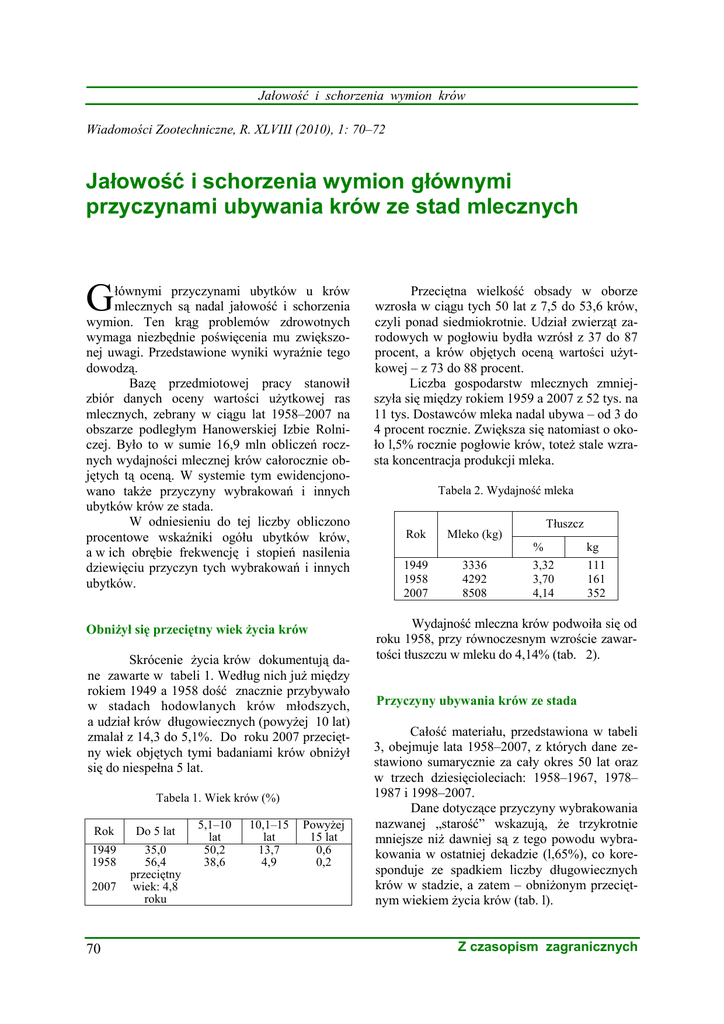 Jałowość i schorzenia wymion krów Wiadomości Zootechniczne, R. XLVIII (2010), 1: 70–72 Jałowość i schorzenia wymion głównymi przyczynami ubywania krów ze stad mlecznych G łównymi przyczynami ubytków u krów mlecznych są nadal jałowość i schorzenia wymion. Ten krąg problemów zdrowotnych wymaga niezbędnie poświęcenia mu zwiększonej uwagi. Przedstawione wyniki wyraźnie tego dowodzą. Bazę przedmiotowej pracy stanowił zbiór danych oceny wartości uŜytkowej ras mlecznych, zebrany w ciągu lat 1958–2007 na obszarze podległym Hanowerskiej Izbie Rolniczej. Było to w sumie 16,9 mln obliczeń rocznych wydajności mlecznej krów całorocznie objętych tą oceną. W systemie tym ewidencjonowano takŜe przyczyny wybrakowań i innych ubytków krów ze stada. W odniesieniu do tej liczby obliczono procentowe wskaźniki ogółu ubytków krów, a w ich obrębie frekwencję i stopień nasilenia dziewięciu przyczyn tych wybrakowań i innych ubytków. Przeciętna wielkość obsady w oborze wzrosła w ciągu tych 50 lat z 7,5 do 53,6 krów, czyli ponad siedmiokrotnie. Udział zwierząt zarodowych w pogłowiu bydła wzrósł z 37 do 87 procent, a krów objętych oceną wartości uŜytkowej – z 73 do 88 procent. Liczba gospodarstw mlecznych zmniejszyła się między rokiem 1959 a 2007 z 52 tys. na 11 tys. Dostawców mleka nadal ubywa – od 3 do 4 procent rocznie. Zwiększa się natomiast o około l,5% rocznie pogłowie krów, toteŜ stale wzrasta koncentracja produkcji mleka. ObniŜył się przeciętny wiek Ŝycia krów Wydajność mleczna krów podwoiła się od roku 1958, przy równoczesnym wzroście zawartości tłuszczu w mleku do 4,14% (tab. 2). Skrócenie Ŝycia krów dokumentują dane zawarte w tabeli 1. Według nich juŜ między rokiem 1949 a 1958 dość znacznie przybywało w stadach hodowlanych krów młodszych, a udział krów długowiecznych (powyŜej 10 lat) zmalał z 14,3 do 5,1%. Do roku 2007 przeciętny wiek objętych tymi badaniami krów obniŜył się do niespełna 5 lat. Tabela 1. Wiek krów (%) Rok Do 5 lat 1949 1958 35,0 56,4 przeciętny wiek: 4,8 roku 2007 70 5,1–10 lat 50,2 38,6 10,1–15 lat 13,7 4,9 PowyŜej 15 lat 0,6 0,2 Tabela 2. Wydajność mleka Rok 1949 1958 2007 Mleko (kg) 3336 4292 8508 Tłuszcz % 3,32 3,70 4,14 kg 111 161 352 Przyczyny ubywania krów ze stada Całość materiału, przedstawiona w tabeli 3, obejmuje lata 1958–2007, z których dane zestawiono sumarycznie za cały okres 50 lat oraz w trzech dziesięcioleciach: 1958–1967, 1978– 1987 i 1998–2007. Dane dotyczące przyczyny wybrakowania nazwanej „starość” wskazują, Ŝe trzykrotnie mniejsze niŜ dawniej są z tego powodu wybrakowania w ostatniej dekadzie (l,65%), co koresponduje ze spadkiem liczby długowiecznych krów w stadzie, a zatem – obniŜonym przeciętnym wiekiem Ŝycia krów (tab. l). Z czasopism zagranicznych Jałowość i schorzenia wymion krów Z czasopism zagranicznych 71 Jałowość i schorzenia wymion krów Nową tendencją jest natomiast zwiększanie sprzedaŜy krów do hodowli, stanowiącej teraz aŜ ponad 17% krów, jakie ze stada ubywają. W rozpatrywanym okresie malał stopniowo odsetek wybrakowań z obory krów niskomlecznych, obniŜając się z 19 do 3% obecnie. Na zbliŜonym do dawniejszego poziomie (± 2%) pozostają wybrakowania z powodu niskiej zdolności udojowej. Choroby infekcyjne nadal eliminują z chowu podobny jak dawniej procent krów, a mianowicie średnio około lub ponad 5%. Dwukrotnie w ostatnich 20 latach zwiększyły się wybrakowania spowodowane chorobami racic i nóg (z 4,4 do 8,8%). W kategorii nazwanej „inne schorzenia” zawarte są ubytki z powodu zaburzeń przemiany materii, a takŜe uboje z konieczności wywołane zranieniami, złamaniami, jak równieŜ zatruciami oraz padnięcia i nieuleczalne choroby, a nawet poraŜenia piorunem i szereg innych jednostkowych przypadków. Wszelkie schorzenia wymion nasiliły się blisko czterokrotnie, stając się drugą z rzędu, najczęstszą przyczyną wybrakowań krów ze stad mlecznych. Główną zaś nadal pozostają – jałowość i liczne ostre zaburzenia rozrodczych funkcji organizmu krowy, aczkolwiek odnotować naleŜy na tym odcinku poprawę, wyraŜającą się zmniejszeniem się w ostatniej dekadzie wybrakowań spowodowanych tymi przyczynami – z 33 na 23%. skutkiem oddziaływania tak licznych czynników, jak właśnie jałowość. Na jej wystąpienie, oprócz zwykłych zaniedbań w kierowaniu rozrodem oraz nieterminowego i niestarannego wykonywania związanych z nim zabiegów, mogą zdecydowanie negatywnie wpłynąć błędy Ŝywieniowe, niewłaściwy sposób utrzymania, pielęgnacji i traktowania zwierząt, odziedziczone wady organiczne, infekcje dróg rodnych, a takŜe nieodpowiedni lub nieskuteczny przebieg leczenia, wreszcie zaburzenia hormonalne i zaburzenia przemiany materii. Z własnej praktyki autora artykułu, profesora Horsta Frerkinga wynika, Ŝe zaburzenia przemiany materii są w osiemdziesięciu procentach przyczyną wybrakowań ujętych w kategorii „inne schorzenia”. Dane liczbowe o schorzeniach wymion, jako przyczynie wybrakowań są statystycznie istotne, analogicznie, jak w przypadku niskiej wydajności oraz jałowości. WaŜną rolę w tej kategorii powodów wybrakowań odgrywać moŜe wadliwie funkcjonujące urządzenie udojowe. Posumowując naleŜy stwierdzić, Ŝe poŜądane w kaŜdych warunkach zmniejszenie stopnia wybrakowań, a więc wydłuŜenie okresu uŜytkowania krów w stadzie i poprawienie tą drogą ekonomiki chowu bydła mlecznego moŜe być w większości przypadków osiągnięte poprzez nieustanną dbałość o poprawę wszystkich warunków chowu, w tym Ŝywienia oraz mlecznego i rozrodowego uŜytkowania krów. _________________ Wyniki i dyskusja Intensywne badania i nauczanie studentów medycyny weterynaryjnej i rolnictwa przyczyniły się bez wątpienia do poprawy wyników uzyskiwanych w rozrodzie bydła ras mlecznych, Jałow