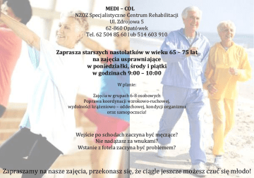 MEDI – COL NZOZ Specj alistyczne Centrum Rehabilitacji Ul. Zdrojowa 5 62-860 Opatówek Tel. 62 504 85 60 l ub 514 603 910 Zaprasza starszych nastolatków w wieku 65 – 75 lat na zajęcia usprawniające w poniedziałki, środy i piątki w godzinach 9:00 – 10:00 W planie: Zajęcia w grupach 6-8 osobowych Poprawa koordynacji wzrokowo-ruchowej, wydolności krążeniowo – oddechowej, kondycji organizmu oraz samopoczucia! Wejście po schodach zaczyna być męczące? Nie nadążasz za wnukami? Wstanie z fotela zaczyna być problemem? Zapraszamy na nasze zajęcia, przekonasz się, że ciągle jeszcze możesz czuć się młodo!