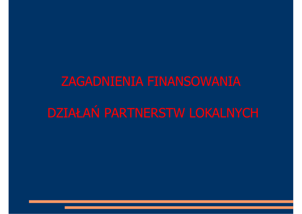 ZAGADNIENIA FINANSOWANIA DZIAŁAŃ PARTNERSTW LOKALNYCH Partnerstwo lokalne a porozumienie na rzecz realizacji projektu ( aspekt finansowy) Powierzchowne podobieństwo- różne cele w ramach porozumienia – ostre, biznesowe, zasady rozliczeń, -chłodna kalkulacja kosztów ( opłaca się nam to wziąć lub nie) - szczegółowa analiza zapisów umownych ( zabezpieczenie własnych interesów) -długi okres negocjacji umowy -umowa przygotowywana w formule negocjacji biznesowych - zasada ograniczonego zaufania w rozliczeniach - niechęć do podejmowania dodatkowego wysiłku i ryzyka finansowego W ramach partnerstwa: - osiągniecie celu za wszelką cenę, niejednokrotnie „po kosztach” - wpierania się partnerów ( w tym finansowe) w tzw. gorszych chwilach - zapisy umowy przygotowane w formule dyskusji i konsensusu, wola do ustępstw - świadomość niedoskonałości i niewiedzy ( założenie ewentualnych, nieprzewidzianych strat finansowych, które trzeba będzie uzupełnić w ramach wkładów własnych np. zwiększonego czasu pracy, dla dobra realizacji projektu Główne zalety partnerstwa- aspekt finansowy -Silniejsze podmioty dają gwarancje płynności finansowej- zawsze zdarzają się okresy opóźnień w przekazywaniu środków finansowych przez Grantodawców -Możliwość, a nawet potrzeba, zapewnienia w ramach przygotowywanego projektu środków na stworzenie w ramach partnerstwa grupy zarządzającej Partnerstwem ( wyłonienie i sfinansowanie pracy osób, które będą zajmowały się tylko zarządzaniem pracami partnerstwa, co stwarza pozostałym większe możliwości skupienia się tylko na pracy związanej z celem głównym realizowanego projektu) Główne zalety partnerstwa- aspekt finansowy c.d -Możliwość zaplanowania i sfinansowania w ramach aplikowanego projektu szkoleń niezbędnych dla realizacji projektu dla poszczególnych partnerów, w tym głównie partnerów mniejszych i słabszych co wzmacnia potencjał ich organizacji i kwalifikacje poszczególnych członków. - Dostęp do grantów ( głównie zakładających wkład własny) których pojedyncza organizacja nie byłaby w stanie pozyskać, ze względu na słabą kondycje finansową lub fizyczny brak środków finansowych na wymagany wkład własny Główne zalety partnerstwa- aspekt finansowy c.d - Dostęp do większego budżetu projektowego ( głównie dotyczy to POKL) poprzez możliwości zabezpieczenia realizacji projektu przez któregokolwiek z partnerów (budżety do 1 miliona i powyżej) - Możliwość aplikowania o granty, dostępne tylko i wyłącznie dla jednego podmiotu partnerstwa ( np. granty dostępne tylko dla NGO lub tylko dla JST) Dlaczego finansowane są działania partnerskie, skoro często projekty partnerskie są droższe, niż projekty indywidualnych projektodawców??? 1) poprawa wydajności działań- duży może więcej i taniej w przeliczeniu na długość okresu działania i liczbę zaangażowanych podmiotów. Koszt jednostkowy spada w takim przypadku dzięki unikaniu powielania działań i propagowanie skoordynowanego i synergicznego wykorzystania metod i środków będących w dyspozycji poszczególnych partnerów 2) poprawa jakości projektu- partnerstwo jest bardziej twórcze i innowacyjne od pojedynczych projektodawców. W współpracujących ludzi pojawia się liczba - nie zawsze zbieżnych - pomysłów, interesów i programów, które w efekcie „obróbki”, także konfliktów, dają większe prawdopodobieństwo wypracowania nowatorskich rozwiązań 3) Poprawy wydajności działań - skoncentrowanie się na rzeczywistych potrzebach wynikających z doświadczenia wielu podmiotów ( uczestników partnerstwa) co zmniejsza prawdopodobieństwo wydatkowania środków finansowych na ewentualne „eksperymenty” pojedynczych projektodawców. 4) Bezkosztowe zwiększenie potencjału poszczególnych partnerów dzięki wymianie doświadczeń i wiedzy fachowej w ramach partnerstwa. 5) Promowania zrozumienia różnych kultur organizacyjnych i celów istotnych z punktu widzenia różnych zainteresowanych stron (np. sektora publicznego i prywatnego) – bez kosztowy rezultat miękki. Pytanie Skąd wziąć pieniądze na nasz projekt partnerski ??? Odpowiedź Z każdego dostępnego źródła, które pozwoli zrealizować nasze wspólne cele !!! Partnerstwa najczęściej korzystają z: Konkursów dotacyjnych prywatnych, ogólnodostępnych fundacji (Fundacji im. Stefana Batorego, Polsko – Amerykańskiej Fundacji Wolności, Akademii Rozwoju Filantropii w Polsce, Fundacji Wspomagania Wsi in.), Konkursów ofert ogłaszane przez władze samorządowe, Konkursów ogłaszane przez krajowe instytucje centralne ( ministerstwa, pełnomocnicy) Fundusze europejskie, w tym: fundusze strukturalne (Europejski Fundusz Społeczny, Europejski Fundusz Rozwoju Regionalnego), programy operacyjny (m.in. Młodzież w Działaniu) Działania premiowane w ramach POKL 7.2.1 aktywizacja zawodowa i społeczna osób zagrożonych wykluczeniem społecznym – granty nie mniejsze niż 50 000 złotych bez wkładu własnego 7.3 inicjatywy lokalne na rzecz reintegracji osób marginalizowanych i zagrożonych wykluczeniem społecznym – granty do 50 000 złotych bez wkładu własnego 9.5 edukacyjne inicjatywy lokalne, inicjatywy promujące edukację – granty do 50 000 złotych bez wkładu własnego 6.3 inicjatywy lokalne na rzecz zwiększenia aktywności zawodowej mieszkańców obszarów wiejskich – granty do 50 000 złotych bez wkładu własnego 5.4.2 – wzmocnienie sektora organizacji pozarządowych- granty nie mniejsze niż 50 000 złotych bez wkładu własnego Dziękuję za cierpliwość :) Arkadiusz Czocher
