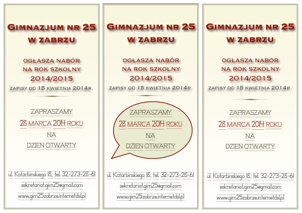 GIMNAZJUM NR 25 GIMNAZJUM NR 25 GIMNAZJUM NR 25 W ZABRZU W ZABRZU W ZABRZU OG!ASZA NABÓR NA ROK SZKOLNY OG!ASZA NABÓR NA ROK SZKOLNY OG!ASZA NABÓR NA ROK SZKOLNY 2014/2015 2014/2015 2014/2015 ZAPISY OD 15 KWIETNIA 2014R. ! ZAPISY OD 15 KWIETNIA 2014R. ZAPISY OD 15 KWIETNIA 2014R. ZAPRASZAMY ZAPRASZAMY ZAPRASZAMY 28 MARCA 2014 ROKU 28 MARCA 2014 ROKU 28 MARCA 2014 ROKU NA NA NA DZIEN OTWARTY DZIEN OTWARTY DZIEN OTWARTY ul. Kotarbinskiego 18, tel. 32-273-28-61 [email protected] www.gim25zabrze.internetdsl.pl ul. Kotarbinskiego 18, tel. 32-273-28-61 [email protected] www.gim25zabrze.internetdsl.pl ul. Kotarbinskiego 18, tel. 32-273-28-61 [email protected] www.gim25zabrze.internetdsl.pl ! ! DLACZEGO WARTO WYBRA! 25-TK" ? DLACZEGO WARTO WYBRA! 25-TK" ? ! uczniowie w naszej szkole nie s# anonimowi i czuj# si$ bezpiecznie; ! uczniowie w naszej szkole nie s# anonimowi i czuj# si$ bezpiecznie; ! m%odzie& uczy si$ w ma%o licznych klasach co sprzyja indywidualizacji w nauczaniu; ! m%odzie& uczy si$ w ma%o licznych klasach co sprzyja indywidualizacji w nauczaniu; ' kadr$ stanowi# wysoko wykwalifikowani, m%odzi i do(wiadczeni nauczyciele; ' kadr$ stanowi# wysoko wykwalifikowani, m%odzi i do(wiadczeni nauczyciele; ' zapewniamy fachow# opiek$ pedagoga, który doskonale zna swoich podopiecznych; ' zapewniamy fachow# opiek$ pedagoga, który doskonale zna swoich podopiecznych; ' oferujemy bogat# ofert$ zaj$) pozalekcyjnych; ' oferujemy bogat# ofert$ zaj$) pozalekcyjnych; ' posiadamy dobrze zaopatrzon# bibliotek$ z Centrum Informacji Multimedialnej; ' posiadamy dobrze zaopatrzon# bibliotek$ z Centrum Informacji Multimedialnej; ' uczniowie maj# mo&liwo() zaanga&owania si$ w Samorz#d Szkolny i aktywnego kreowania szkolnego &ycia; ' uczniowie maj# mo&liwo() zaanga&owania si$ w Samorz#d Szkolny i aktywnego kreowania szkolnego &ycia; ' w ramach programu COMENIUS realizujemy projekt “Save the past, live in present, imagine the future”; ' w ramach programu COMENIUS realizujemy projekt “Save the past, live in present, imagine the future”; ' uczestniczymy w wielu akcjach i projektach tj. Poczytaj mi przyjacielu czy Adopcja na odleg%o(); ' uczestniczymy w wielu akcjach i projektach tj. Poczytaj mi przyjacielu czy Adopcja na odleg%o(); ' uczniowie realizuj# ciekawe projekty tj. Qulturalny gimnazjalista czy Palenie jest s%abe; ' uczniowie realizuj# ciekawe projekty tj. Qulturalny gimnazjalista czy Palenie jest s%abe; ' w rankingu wed%ug wska*nika EWD zajmujemy miejsce w pierwszej 10 zabrza+skich gimnazjów; ' organizujemy wyjazdy na konkursy muzyczne i interesuj#ce warsztaty; ' promujemy zdrowie i sport; ' zaj$cia sportowe odbywaj# si$ na sali gimnastycznej; ' w rankingu wed%ug wska*nika EWD zajmujemy miejsce w pierwszej 10 zabrza+skich gimnazjów; ' organizujemy wyjazdy na konkursy muzyczne i interesuj#ce warsztaty; ' promujemy zdrowie i sport; ' zaj$cia sportowe odbywaj# si$ na sali gimnastycznej; DLACZEGO WARTO WYBRA! 25-TK" ? ! uczniowie w naszej szkole nie s# anonimowi i czuj# si$ bezpiecznie; ! m%odzie& uczy si$ w ma%o licznych klasach co sprzyja indywidualizacji w nauczaniu; ' kadr$ stanowi# wysoko wykwalifikowani, m%odzi i do(wiadczeni nauczyciele; ' zapewniamy fachow# opiek$ pedagoga, który doskonale zna swoich podopiecznych; ' oferujemy bogat# ofert$ zaj$) pozalekcyjnych; ' posiadamy dobrze zaopatrzon# bibliotek$ z Centrum Informacji Multimedialnej; ' uczniowie maj# mo&liwo() zaanga&owania si$ w Samorz#d Szkolny i aktywnego kreowania szkolnego &ycia; ' w ramach programu COMENIUS realizujemy projekt “Save the past, live in present, imagine the future”; ' uczestniczymy w wielu akcjach i projektach tj. Poczytaj mi przyjacielu czy Adopcja na odleg%o(); ' uczniowie realizuj# ciekawe projekty tj. Qulturalny gimnazjalista czy Palenie jest s%abe; ' w rankingu wed%ug wska*nika EWD zajmujemy miejsce w pierwszej 10 zabrza+skich gimnazjów; ' organizujemy wyjazdy na konkursy muzyczne i interesuj#ce warsztaty; ' promujemy zdrowie i sport; ' zaj$cia sportowe odbywaj# si$ na sali gimnastycznej;