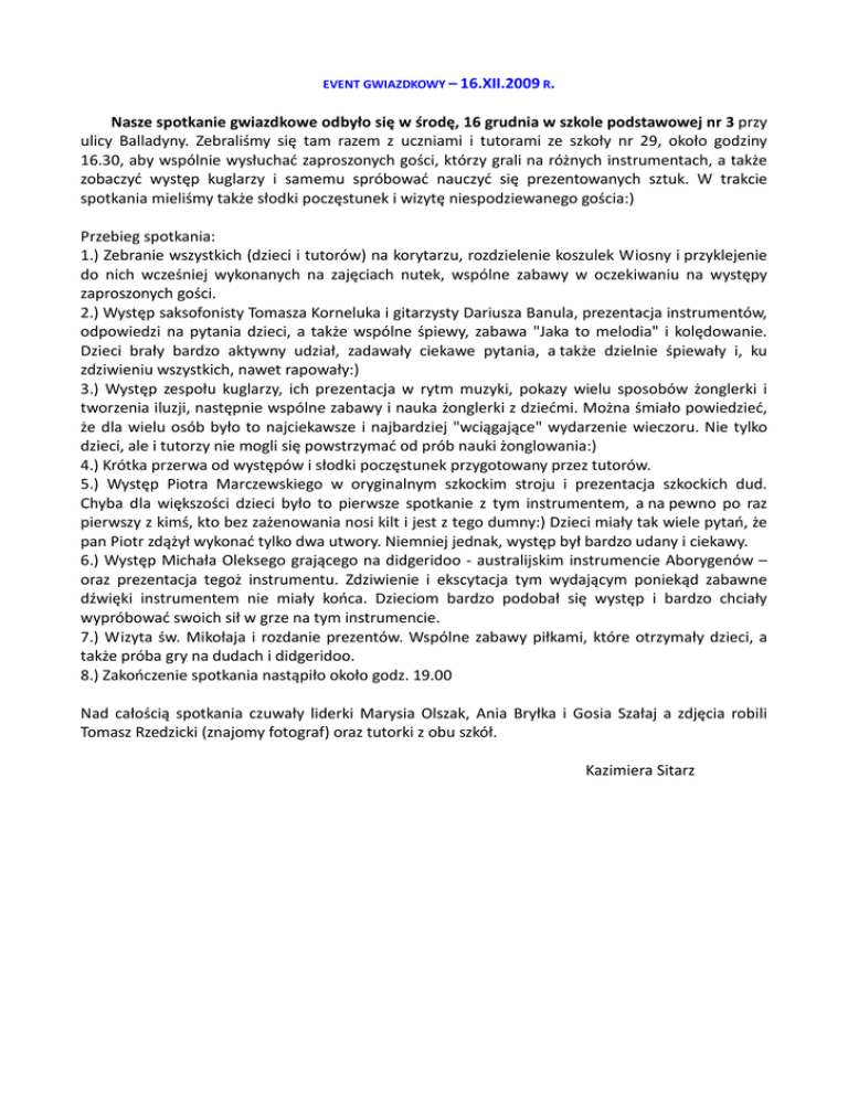 EVENT GWIAZDKOWY – 16.XII.2009 R. Nasze spotkanie gwiazdkowe odbyło się w środę, 16 grudnia w szkole podstawowej nr 3 przy ulicy Balladyny. Zebraliśmy się tam razem z uczniami i tutorami ze szkoły nr 29, około godziny 16.30, aby wspólnie wysłuchać zaproszonych gości, którzy grali na różnych instrumentach, a także zobaczyć występ kuglarzy i samemu spróbować nauczyć się prezentowanych sztuk. W trakcie spotkania mieliśmy także słodki poczęstunek i wizytę niespodziewanego gościa:) Przebieg spotkania: 1.) Zebranie wszystkich (dzieci i tutorów) na korytarzu, rozdzielenie koszulek Wiosny i przyklejenie do nich wcześniej wykonanych na zajęciach nutek, wspólne zabawy w oczekiwaniu na występy zaproszonych gości. 2.) Występ saksofonisty Tomasza Korneluka i gitarzysty Dariusza Banula, prezentacja instrumentów, odpowiedzi na pytania dzieci, a także wspólne śpiewy, zabawa "Jaka to melodia" i kolędowanie. Dzieci brały bardzo aktywny udział, zadawały ciekawe pytania, a także dzielnie śpiewały i, ku zdziwieniu wszystkich, nawet rapowały:) 3.) Występ zespołu kuglarzy, ich prezentacja w rytm muzyki, pokazy wielu sposobów żonglerki i tworzenia iluzji, następnie wspólne zabawy i nauka żonglerki z dziećmi. Można śmiało powiedzieć, że dla wielu osób było to najciekawsze i najbardziej "wciągające" wydarzenie wieczoru. Nie tylko dzieci, ale i tutorzy nie mogli się powstrzymać od prób nauki żonglowania:) 4.) Krótka przerwa od występów i słodki poczęstunek przygotowany przez tutorów. 5.) Występ Piotra Marczewskiego w oryginalnym szkockim stroju i prezentacja szkockich dud. Chyba dla większości dzieci było to pierwsze spotkanie z tym instrumentem, a na pewno po raz pierwszy z kimś, kto bez zażenowania nosi kilt i jest z tego dumny:) Dzieci miały tak wiele pytań, że pan Piotr zdążył wykonać tylko dwa utwory. Niemniej jednak, występ był bardzo udany i ciekawy. 6.) Występ Michała Oleksego grającego na didgeridoo - australijskim instrumencie Aborygenów – oraz prezentacja tegoż instrumentu. Zdziwienie i ekscytacja tym wydającym poniekąd zabawne dźwięki instrumentem nie miały końca. Dzieciom bardzo podobał się występ i bardzo chciały wypróbować swoich sił w grze na tym instrumencie. 7.) Wizyta św. Mikołaja i rozdanie prezentów. Wspólne zabawy piłkami, które otrzymały dzieci, a także próba gry na dudach i didgeridoo. 8.) Zakończenie spotkania nastąpiło około godz. 19.00 Nad całością spotkania czuwały liderki Marysia Olszak, Ania Bryłka i Gosia Szałaj a zdjęcia robili Tomasz Rzedzicki (znajomy fotograf) oraz tutorki z obu szkół. Kazimiera Sitarz
