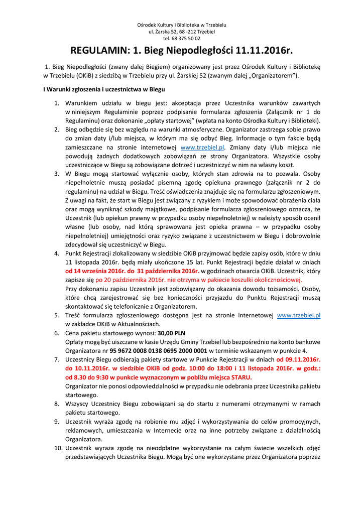 Ośrodek Kultury i Biblioteka w Trzebielu ul. Żarska 52, 68 -212 Trzebiel tel. 68 375 50 02 REGULAMIN: 1. Bieg Niepodległości 11.11.2016r. 1. Bieg Niepodległości (zwany dalej Biegiem) organizowany jest przez Ośrodek Kultury i Bibliotekę w Trzebielu (OKiB) z siedzibą w Trzebielu przy ul. Żarskiej 52 (zwanym dalej „Organizatorem”). I Warunki zgłoszenia i uczestnictwa w Biegu 1. Warunkiem udziału w biegu jest: akceptacja przez Uczestnika warunków zawartych w niniejszym Regulaminie poprzez podpisanie formularza zgłoszenia (Załącznik nr 1 do Regulaminu) oraz dokonanie „opłaty startowej” (wpłata na konto Ośrodka Kultury i Biblioteki). 2. Bieg odbędzie się bez względu na warunki atmosferyczne. Organizator zastrzega sobie prawo do zmian daty i/lub miejsca, w którym ma się odbyć Bieg. Informacje o tym fakcie będą zamieszczane na stronie internetowej www.trzebiel.pl. Zmiany daty i/lub miejsca nie powodują żadnych dodatkowych zobowiązań ze strony Organizatora. Wszystkie osoby uczestniczące w Biegu są zobowiązane dotrzeć i uczestniczyć w nim na własny koszt. 3. W Biegu mogą startować wyłącznie osoby, których stan zdrowia na to pozwala. Osoby niepełnoletnie muszą posiadać pisemną zgodę opiekuna prawnego (załącznik nr 2 do regulaminu) na udział w Biegu. Treść oświadczenia znajduje się na formularzu zgłoszeniowym. Z uwagi na fakt, że start w Biegu jest związany z ryzykiem i może spowodować obrażenia ciała oraz mogą wyniknąć szkody majątkowe, podpisanie formularza zgłoszeniowego oznacza, że Uczestnik (lub opiekun prawny w przypadku osoby niepełnoletniej) w należyty sposób ocenił własne (lub osoby, nad którą sprawowana jest opieka prawna – w przypadku osoby niepełnoletniej) umiejętności oraz ryzyko związane z uczestnictwem w Biegu i dobrowolnie zdecydował się uczestniczyć w Biegu. 4. Punkt Rejestracji zlokalizowany w siedzibie OKiB przyjmować będzie zapisy osób, które w dniu 11 listopada 2016r. będą miały ukończone 15 lat. Punkt Rejestracji będzie działał w dniach od 14 września 2016r. do 31 października 2016r. w godzinach otwarcia OKiB. Uczestnik, który zapisze się po 20 października 2016r. nie otrzyma w pakiecie koszulki okolicznościowej. Przy dokonaniu zapisu Uczestnik jest zobowiązany do okazania dowodu tożsamości. Osoby, które chcą zarejestrować się bez konieczności przyjazdu do Punktu Rejestracji muszą skontaktować się telefonicznie z Organizatorem. 5. Treść formularza zgłoszeniowego dostępna jest na stronie internetowej www.trzebiel.pl w zakładce OKiB w Aktualnościach. 6. Cena pakietu startowego wynosi: 30,00 PLN Opłaty mogą być uiszczane w kasie Urzędu Gminy Trzebiel lub bezpośrednio na konto bankowe Organizatora nr 95 9672 0008 0138 0695 2000 0001 w terminie wskazanym w punkcie 4. 7. Uczestnicy Biegu odbierają pakiety startowe w Punkcie Rejestracji w dniach od 09.11.2016r. do 10.11.2016r. w siedzibie OKiB od godz. 10:00 do 18:00 i 11 listopada 2016r. w godz.: od 8.30 do 9:30 w punkcie wyznaczonym w pobliżu miejsca STARU. Organizator nie ponosi odpowiedzialności w przypadku nie odebrania przez Uczestnika pakietu startowego. 8. Wszyscy Uczestnicy Biegu zobowiązani są do startu z numerami otrzymanymi w ramach pakietu startowego. 9. Uczestnik wyraża zgodę na robienie mu zdjęć i wykorzystywania do celów promocyjnych, reklamowych, umieszczania w Internecie oraz na inne potrzeby związane z działalnością Organizatora. 10. Uczestnik wyraża zgodę na nieodpłatne wykorzystanie na całym świecie wszelkich zdjęć przedstawiających Uczestnika Biegu. Mogą być one wykorzystane przez Organizatora poprzez Ośrodek Kultury i Biblioteka w Trzebielu ul. Żarska 52, 68 -212 Trzebiel tel. 68 375 50 02 11. 12. 13. 14. 15. 16. 17. 18. umieszczanie na stronach internetowych, w gazetach i na wystawach, jak również na potrzeby promocyjno-reklamowe związane z działalnością prowadzoną przez Organizatora. Podczas Imprezy zabrania się wnoszenia środków odurzających, nielegalnych substancji, środków podnoszących wydajność fizyczną oraz alkoholu wszelkiego rodzaju. Uczestnikom zabrania się zażywania takich środków i substancji zarówno przed jak i podczas Biegu. W przypadku stwierdzenia, że Uczestnik narusza powyższy zakaz, Organizator zastrzega sobie możliwość niedopuszczenia go do udziału w Biegu lub wykluczenia go w jego trakcie. Uczestnik, który dopuszcza się niesportowej rywalizacji może zostać zdyskwalifikowany przez Organizatora i nie ujęty w wynikach końcowych. Zawodnik ma do pokonania trasę wyznaczoną i oznakowaną przez Organizatora – około 5 km. Przez przekazanie do Organizatora prawidłowo wypełnionego i podpisanego formularza zgłoszeniowego Uczestnik wyraża zgodę i zezwala na wykorzystanie podanych przez niego danych osobowych na potrzeby przesłania do Uczestnika informacji o przyszłych imprezach. Uczestnikowi przysługuje prawo do wycofania takiej zgody i może to zrobić w dowolnym momencie kierując korespondencję na adres Organizatora. Wszystkie informacje dotyczące uczestników uzyskane przez Organizatora i zawarte w formularzu zgłoszeniowym zostaną zapisane w sposób elektroniczny i w każdym wypadku będą wykorzystywane zgodnie z ustawą o ochronie danych osobowych z dnia 29 sierpnia 1997r. (tekst jednolity: Dz.U.2015.2135 z późn. zm.). Organizator nie będzie ujawniał tych informacji osobom trzecim. Decyzja o zwrocie Uczestnikowi kosztów zakupu pakietu startowego w przypadku jego rezygnacji leży całkowicie w gestii Organizatora. Indywidualne wyniki Biegu zostaną ogłoszone wg numerów startowych na stronie www.trzebiel.pl, na co Uczestnik wyraża zgodę. Treść niniejszego Regulaminu będzie udostępniona wszystkim Uczestnikom Biegu w siedzibie Organizatora oraz na stronie www.trzebiel.pl. Organizator zastrzega sobie prawo zmiany treści niniejszego Regulaminu bez podania przyczyny poprzez ich publikację