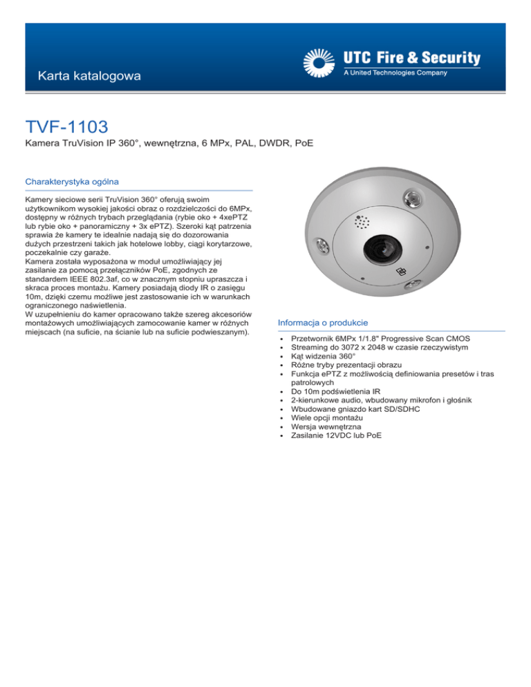 Karta katalogowa TVF-1103 Kamera TruVision IP 360°, wewnętrzna, 6 MPx, PAL, DWDR, PoE Charakterystyka ogólna Kamery sieciowe serii TruVision 360° oferują swoim użytkownikom wysokiej jakości obraz o rozdzielczości do 6MPx, dostępny w różnych trybach przeglądania (rybie oko + 4xePTZ lub rybie oko + panoramiczny + 3x ePTZ). Szeroki kąt patrzenia sprawia że kamery te idealnie nadają się do dozorowania dużych przestrzeni takich jak hotelowe lobby, ciągi korytarzowe, poczekalnie czy garaże. Kamera została wyposażona w moduł umożliwiający jej zasilanie za pomocą przełączników PoE, zgodnych ze standardem IEEE 802.3af, co w znacznym stopniu upraszcza i skraca proces montażu. Kamery posiadają diody IR o zasięgu 10m, dzięki czemu możliwe jest zastosowanie ich w warunkach ograniczonego naświetlenia. W uzupełnieniu do kamer opracowano także szereg akcesoriów montażowych umożliwiających zamocowanie kamer w różnych miejscach (na suficie, na ścianie lub na suficie podwieszanym). Informacja o produkcie E E E E E E E E E E E Przetwornik 6MPx 1/1.8" Progressive Scan CMOS Streaming do 3072 x 2048 w czasie rzeczywistym Kąt widzenia 360° Różne tryby prezentacji obrazu Funkcja ePTZ z możliwością definiowania presetów i tras patrolowych Do 10m podświetlenia IR 2-kierunkowe audio, wbudowany mikrofon i głośnik Wbudowane gniazdo kart SD/SDHC Wiele opcji montażu Wersja wewnętrzna Zasilanie 12VDC lub PoE TVF-1103 Kamera TruVision IP 360°, wewnętrzna, 6 MPx, PAL, DWDR, PoE Specyfikacja Jak zamawiać Kamera Przetwornik Kod produktu 6MPx 1/1.8" Progressive Scan CMOS H.264 / MJPEG wiele strumieni: dookólny, Kompresja IP/ Standard panoramiczny, 4 x PTZ Maksymalna rozdzielczość 3072 x2048 @25 fps 1 x rybie oko" (3072 x 2048, 25fps) lub (2048 x Tryb prezentacji obrazu 2048, 25fps) lub 4 x PTZ (1024 x 768, 25fps) 1 x "rybie oko" (1280 × 1280,12.5fps) oraz 1 x Tryb wielokanałowy panoramiczny (2048 x 1536, 12.5fps) oraz 3 x PTZ (1024 x 768, 12.5fps) Współczynnik S/N 50dB (cyfrowy) Elektroniczna migawka 1/25s do 1/100.000s Parametry Tryb WDR DWDR Cyfrowa redukcja szumów 3D DNR Tryb D/N Pełny tryb D/N Czułość (kolor): 0.3 lux @ f2.8 ARW wł. (0 Lux przy IR) Czułość (czarno-biały) 0 Lux przy IR Zasięg IR Do 10m Długość fali IR 850nm Obudowa Klasa środowiskowa nd Wykonanie zewnętrzne Nie Obiektyw Ogniskowa 1.27mm F-stop 2.8 Automatyczna przesłona Tak Varifocal Stały Zasilanie Napięcie zasilania 12VDC 10% Prąd Maks. 1A Pobór mocy Maks. 12W Standard PoE PoE(802.3af) Sieć ONVIF 2.2 PSIA 1.1 TCP/IP, HTTP, DHCP, DNS, DDNS, RTP, Obsługiwane protokoły RTSP, PPPoE, SMTP, NTP, UPnP, SNMP, HTTPS, FTP, 802.1x, Qos, IPv4/IPv6 Zapis danych Złączę pamięci lokalnej Micro SD/SDHC/SDXC Maksymalna pamięć 64GB lokalna Audio Mikrofon Wbudowany Głośnik Wbudowany Parametry mechaniczne Wymiary 167 × 45 mm Waga 767g Temperatura pracy -30 do 60 st.C UTC Fire & Security zastrzega sobie prawo do zmian specyfikacji produktu bez uprzedzenia. Aktualne specyfikacje produktów można znaleźć na stronie www.utcfssecurityproducts.pl lub kontaktując się z regionalnym przedstawicielem handlowym. TVF-1103-2014-12-3 08:23:10 Released :03-DEC-14 TVF-1103 Opis Kamera TruVision IP 360°, wewnętrzna, 6 MPx, PAL, DWDR, PoE