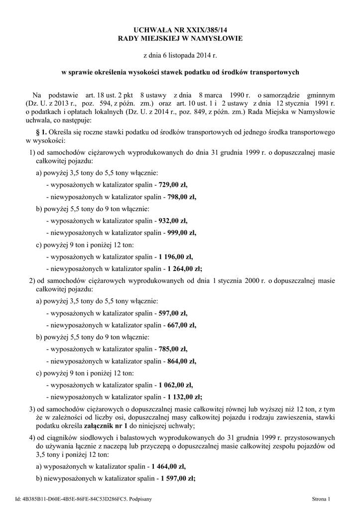 UCHWAŁA NR XXIX/385/14 RADY MIEJSKIEJ W NAMYSŁOWIE z dnia 6 listopada 2014 r. w sprawie określenia wysokości stawek podatku od środków transportowych Na podstawie art. 18 ust. 2 pkt 8 ustawy z dnia 8 marca 1990 r. o samorządzie gminnym (Dz. U. z 2013 r., poz. 594, z późn. zm.) oraz art. 10 ust. 1 i 2 ustawy z dnia 12 stycznia 1991 r. o podatkach i opłatach lokalnych (Dz. U. z 2014 r., poz. 849, z późn. zm.) Rada Miejska w Namysłowie uchwala, co następuje: § 1. Określa się roczne stawki podatku od środków transportowych od jednego środka transportowego w wysokości: 1) od samochodów ciężarowych wyprodukowanych do dnia 31 grudnia 1999 r. o dopuszczalnej masie całkowitej pojazdu: a) powyżej 3,5 tony do 5,5 tony włącznie: - wyposażonych w katalizator spalin - 729,00 zł, - niewyposażonych w katalizator spalin - 798,00 zł, b) powyżej 5,5 tony do 9 ton włącznie: - wyposażonych w katalizator spalin - 932,00 zł, - niewyposażonych w katalizator spalin - 999,00 zł, c) powyżej 9 ton i poniżej 12 ton: - wyposażonych w katalizator spalin - 1 196,00 zł, - niewyposażonych w katalizator spalin - 1 264,00 zł; 2) od samochodów ciężarowych wyprodukowanych od dnia 1 stycznia 2000 r. o dopuszczalnej masie całkowitej pojazdu: a) powyżej 3,5 tony do 5,5 tony włącznie: - wyposażonych w katalizator spalin - 597,00 zł, - niewyposażonych w katalizator spalin - 667,00 zł, b) powyżej 5,5 tony do 9 ton włącznie: - wyposażonych w katalizator spalin - 785,00 zł, - niewyposażonych w katalizator spalin - 864,00 zł, c) powyżej 9 ton i poniżej 12 ton: - wyposażonych w katalizator spalin - 1 062,00 zł, - niewyposażonych w katalizator spalin - 1 132,00 zł; 3) od samochodów ciężarowych o dopuszczalnej masie całkowitej równej lub wyższej niż 12 ton, z tym że w zależności od liczby osi, dopuszczalnej masy całkowitej pojazdu i rodzaju zawieszenia, stawki podatku określa załącznik nr 1 do niniejszej uchwały; 4) od ciągników siodłowych i balastowych wyprodukowanych do 31 grudnia 1999 r. przystosowanych do używania łącznie z naczepą lub przyczepą o dopuszczalnej masie całkowitej zespołu pojazdów od 3,5 tony i poniżej 12 ton: a) wyposażonych w katalizator spalin - 1 464,00 zł, b) niewyposażonych w katalizator spalin - 1 597,00 zł; Id: 4B385B11-D60E-4B5E-86FE-84C53D286FC5. Podpisany Strona 1 5) od ciągników siodłowych i balastowych wyprodukowanych od dnia 1 stycznia 2000 r., przystosowanych do używania łącznie z naczepą lub przyczepą o dopuszczalnej masie całkowitej zespołu pojazdów od 3,5 tony i poniżej 12 ton: a) wyposażonych w katalizator spalin - 1 327,00 zł, b) niewyposażonych w katalizator spalin - 1 397,00 zł; 6) od ciągników siodłowych i balastowych przystosowanych do używania łącznie z naczepą lub przyczepą, o dopuszczalnej masie całkowitej zespołu pojazdów równej lub wyższej niż 12 ton, z tym że w zależności od liczby osi, dopuszczalnej masy całkowitej pojazdu i rodzaju zawieszenia, stawki podatku określa załącznik nr 2 do niniejszej uchwały; 7) od przyczep i naczep wyprodukowanych do 31 grudnia 1999 r., które łącznie z pojazdem silnikowym posiadają dopuszczalną masę całkowitą od 7 ton i poniżej 12 ton, z wyjątkiem związanych wyłącznie z działalnością rolniczą prowadzoną przez podatnika podatku rolnego - 801,00 zł; 8) od przyczep i naczep wyprodukowanych od dnia 1 stycznia 2000 r., które łącznie z pojazdem silnikowym posiadają dopuszczalną masę całkowitą od 7 ton i poniżej 12 ton, z wyjątkiem związanych wyłącznie z działalnością rolniczą prowadzoną przez podatnika podatku rolnego 669,00 zł; 9) od przyczep i naczep, które łącznie z pojazdem silnikowym posiadają dopuszczalną masę całkowitą równą lub wyższą niż 12 ton, z wyjątkiem związanych wyłącznie z działalnością rolniczą prowadzoną przez podatnika podatku rolnego, z tym że w zależności od liczby osi, dopuszczalnej masy całkowitej pojazdu i rodzaju zawieszenia , stawki podatku określa załącznik nr 3 do niniejszej uchwały; 10) od autobusów wyprodukowanych do dnia 31 grudnia 1999 r. w zależności od liczby miejsc do siedzenia: a) mniej niż 30 miejsc: - wyposażonych w katalizator spalin - 932,00 zł, - niewyposażonych w katalizator spalin - 999,00 zł, b) równej lub wyższej niż 30 miejsc: - wyposażonych w katalizator spalin - 1 994,00 zł, - niewyposażonych w katalizator spalin - 2 062,00 zł; 11) od autobusów wyprodukowanych od dnia 1 stycznia 2000 r. w zależności od liczby miejsc do siedzenia: a) mniej niż 30 miejsc: - wyposażonych w katalizator spalin - 798,00 zł, - niewyposażonych w katalizator spalin - 864,00 zł, b) równej lub wyższej niż 30 miejsc: - wyposażonych w katalizator spalin - 1 862,00 zł, - niewyposażonych w katalizator spalin - 1 931,00 zł. § 2. Wykonanie uchwały powierza się Burmistrzowi Namysłowa. § 3. Traci moc uchwała Nr XXIII/291/13 Rady Miejskiej w Namysłowie z dnia 28 listopada 2013 r. w sprawie określenia wysokości stawek podatku od środków transportowych. Id: 4B385B11-D60E-4B5E-86FE-84C53D286FC5. Podpisany Strona 2 § 4. Uchwała podlega ogłoszeniu w Dzienniku Urzędowym Województwa Opolskiego i wchodzi w życie po upływie 14 dni od jej ogłoszenia, z mocą obowiązującą od 1 stycznia 20 15 r. Przewodniczący Rady Jarosław Iwanyszczuk Id: 4B385B11-D60E-4B5E-86FE-84C53D286FC5. Podpisany Strona 3 Załącznik Nr 1 do Uchwały Nr XXIX/385/14 Rady Miejskiej w Namysłowie z dnia 6 listopada 2014 r. STAWKI PODATKU DLA POJAZDÓW OKREŚLONYCH W § 1 PKT 3 UCHWAŁY liczba osi i dopuszczalna masa całkowita (w tonach) nie mniej niż 12 13 14 15 12 17 19 21 23 25 12 25 27 29 31 stawka podatku w złotych oś jezdna (osie) z zawieszeniem mniej niż pneumatycznym lub zawieszeniem uznanym za równoważne dwie osie 13 1 450,00 14 1 464,00 15 1 498,00 1 684,00 trzy osie 17 1 506,00 19 1 642,00 21 1 777,00 23 1 912,00 25 1 990,