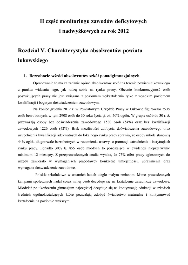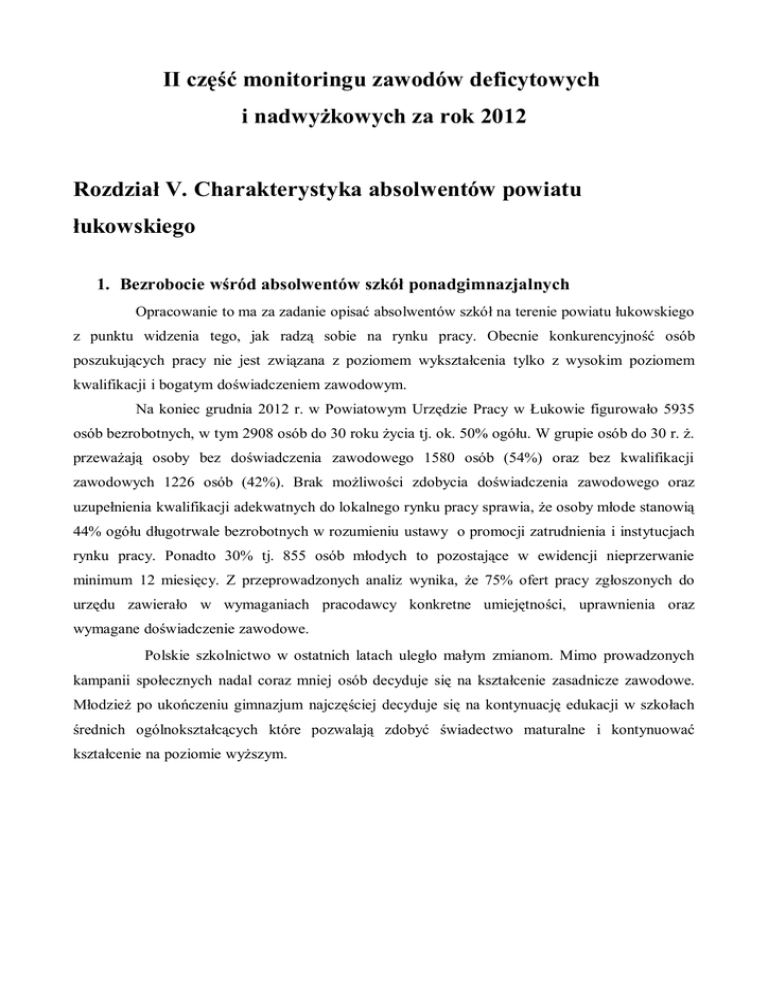 II część monitoringu zawodów deficytowych i nadwyżkowych za rok 2012 Rozdział V. Charakterystyka absolwentów powiatu łukowskiego 1. Bezrobocie wśród absolwentów szkół ponadgimnazjalnych Opracowanie to ma za zadanie opisać absolwentów szkół na terenie powiatu łukowskiego z punktu widzenia tego, jak radzą sobie na rynku pracy. Obecnie konkurencyjność osób poszukujących pracy nie jest związana z poziomem wykształcenia tylko z wysokim poziomem kwalifikacji i bogatym doświadczeniem zawodowym. Na koniec grudnia 2012 r. w Powiatowym Urzędzie Pracy w Łukowie figurowało 5935 osób bezrobotnych, w tym 2908 osób do 30 roku życia tj. ok. 50% ogółu. W grupie osób do 30 r. ż. przeważają osoby bez doświadczenia zawodowego 1580 osób (54%) oraz bez kwalifikacji zawodowych 1226 osób (42%). Brak możliwości zdobycia doświadczenia zawodowego oraz uzupełnienia kwalifikacji adekwatnych do lokalnego rynku pracy sprawia, że osoby młode stanowią 44% ogółu długotrwale bezrobotnych w rozumieniu ustawy o promocji zatrudnienia i instytucjach rynku pracy. Ponadto 30% tj. 855 osób młodych to pozostające w ewidencji nieprzerwanie minimum 12 miesięcy. Z przeprowadzonych analiz wynika, że 75% ofert pracy zgłoszonych do urzędu zawierało w wymaganiach pracodawcy konkretne umiejętności, uprawnienia oraz wymagane doświadczenie zawodowe. Polskie szkolnictwo w ostatnich latach uległo małym zmianom. Mimo prowadzonych kampanii społecznych nadal coraz mniej osób decyduje się na kształcenie zasadnicze zawodowe. Młodzież po ukończeniu gimnazjum najczęściej decyduje się na kontynuację edukacji w szkołach średnich ogólnokształcących które pozwalają zdobyć świadectwo maturalne i kontynuować kształcenie na poziomie wyższym. Tabela nr 1. Absolwenci którzy ukończyli szkołę w 2012 roku z podziałem na wykształcenie. Wykształcenie 2012 % Zawodowe 295 18,03% Średnie ogólnokształcące 792 48,41% Średnie zawodowe 374 22,86% Szkoły policealne 175 10,69% Ogółem 1636 100% Jak wcześniej wspomniano widoczne jest małe zainteresowanie kształceniem na poziomie zawodowym. W 2012 roku tylko 295 osób ukończyło ten typ szkoły. Absolwenci w powiecie łukowskim z podziałem na wykształcenie Szkoły policealne; 175 Zawodowe Zaw odow e ; 295 Średnie zaw odow e ; 374 Średnie ogólnokształcące Średnie zawodowe Szkoły policealne Średnie ogólnokształcące ; 792 Powyższy wykres przedstawia absolwentów z terenu powiatu łukowskiego, widzimy na nim iż, najliczniejszą grupę stanowią absolwenci szkół średnich ogólnokształcących tj 48,41% wszystkich absolwentów. Absolwentów z wykształceniem średnim zawodowym figurowało 375, zaś z zasadniczym zawodowych 295. W szkołach zawodowych kształci się osoby pod kątem zawodów, na które jest zapotrzebowanie na lokalnym rynku pracy. W porównaniu z rokiem ubiegłym mniej osób decydowało się na tego typu szkoły mimo iż bezrobocie coraz częściej dotyka absolwentów szkół wyższych. Rynek pracy powiatu łukowskiego charakteryzuje się dużą ilością ofert dla osób o niskich lub średnich kwalifikacjach ( szczegółowo informacje przedstawiono w rozdziale II ). Ofert pracy czy też ofert stażowych tego typu jest zdecydowanie więcej, nie zawsze jednak odpowiadają one oczekiwaniom i ambicjom absolwentów szkół wyższych. Jeżeli pojawiają się oferty dla specjalistów to obok wykształcenia wyższego wymagany jest staż pracy w danym zawodzie, znajomość konkretnych programów komputerowych oraz dodatkowych uprawnień. Pracodawca poszukuje osoby której nie będzie musiał przyuczać lub szkolić. Tabela nr 2. Udział absolwentów w bezrobociu w 2012 r. Bezrobotni Liczba osób w 2012 roku Absolwenci 568 Ogółem bezrobotni 5935 Prognozy dotyczące wzrostu bezrobocia wśród młodych ludzi nie sprawdziły się. Poza terenem powiatu możliwość znalezienia lepszej pracy jest alternatywą dla absolwentów z powiatu łukowskiego. Wiele osób decyduję się również na migrację zarobkową za granicę. Do zawodów po których najczęściej rejestrują się absolwenci w tutejszym urzędzie należą zawody przedstawione w poniżej tabeli: Tabela nr 3. Najczęstsze zawody wśród rejestrujących się absolwentów w 2012 r. Zawód 1. 2. 3. 4. 5. Sprzedawca Kucharz małej gastronomii Mechanik pojazdów samochodowych Fryzjer Napływ bezrobotnych Bezrobotni absolwentów wg absolwenci wg zawodów w powiecie zawodów w powiecie łukowskim w łukowskim – stan w 2012roku końcu 2012 roku 47 31 40 25 36 22 34 20 27 18 22 12 6. Specjalista administracji publicznej Technik ekonomista 7. Technik informatyk 17 7 8. Pedagog 16 8 9. Technik żywienia i gospodarstwa domowego Prawnik legislator 15 10 13 4 10. 11. Technik mechanik 12. 13. Monter instalacji i urządzeń sanitarnych Nauczyciel przedszkola 14. Specjalista do spraw finansów 15. Technik pojazdów samochodowych Technik usług kosmetycznych Nauczyciel wychowania fizycznego Technik hotelarstwa 16. 17. 18. 12 4 11 7 11 6 11 7 10 10 10 5 9 3 9 6 Tabela nr 4. Bezrobotni wg kodu 6 cyfrowego Nazwa zawodu Napływ bezrobotnych wg zawodów w powiecie łukowskim w 2012 roku wg kodów 6 cyfrowych. Bezrobotni wg zawodów w powiecie łukowskim Stan w końcu II- półrocza 2012 roku wg kodów 6 cyfrowych. Bezrobotni ogółem Bezrobotni ogółem Absolwenci Absolwenci 1. Bez zawodu 1281 536 942 181 2. Sprzedawca 402 47 428 31 3. Technik ekonomista 170 22 148 12 4. Kucharz małej gastronomii 154 40 157 25 5. Murarz 130 8 113 4 6. Technik mechanik 125 12 97 4 7. Mechanik pojazdów samochodowych 99 36 79 22 8. Fryzjer 92 34 76 20 9. Mechanik samochodów osobowych 82 3 58 0 10. Specjalista administracji publicznej 79 27 71 18 11. Robotnik gospodarczy 79 0 66 0 12. Technik żywienia i gospodarstwa domowego 68 15 65 10 13. Technik informatyk 56 17 29 7 14. Technik rolnik 56 3 57 1 15. Tokarz w metalu 53 0 48 0 16. Pedagog 43 16 42 8 17. Specjalista do spraw finans