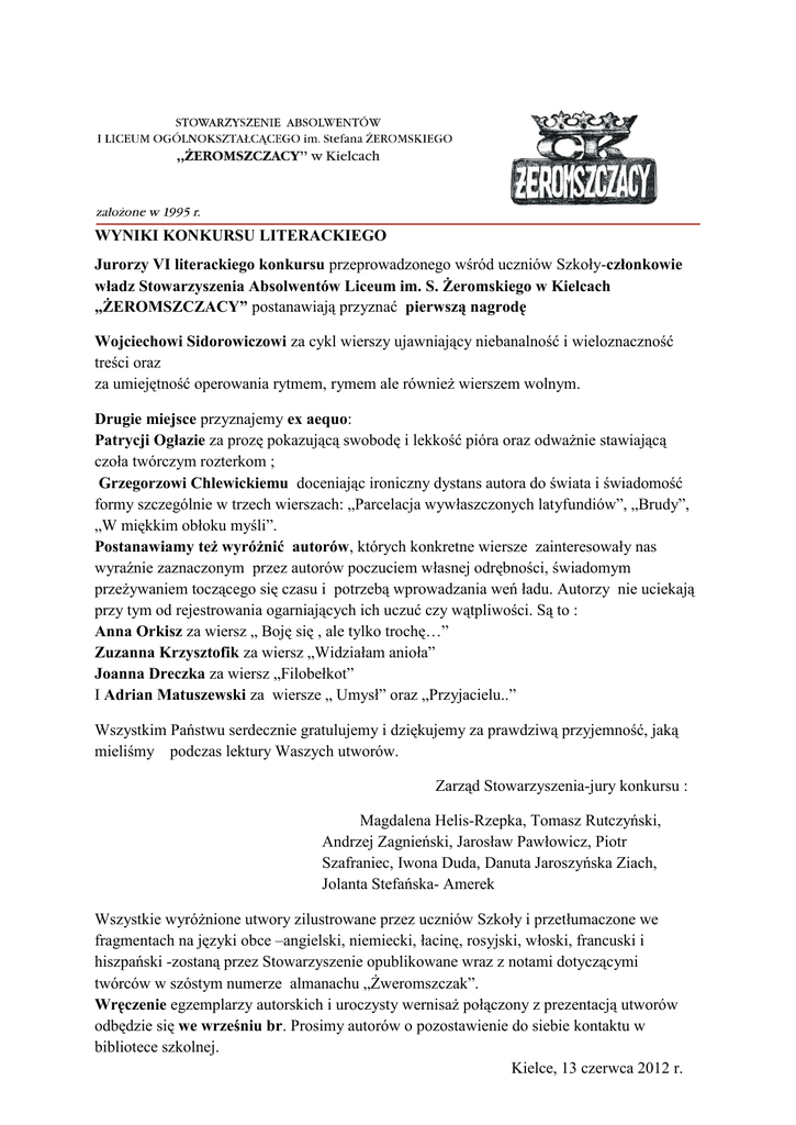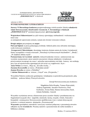 WYNIKI KONKURSU LITERACKIEGO Jurorzy VI literackiego konkursu przeprowadzonego wśród uczniów Szkoły-członkowie władz Stowarzyszenia Absolwentów Liceum im. S. Żeromskiego w Kielcach „ŻEROMSZCZACY” postanawiają przyznać pierwszą nagrodę Wojciechowi Sidorowiczowi za cykl wierszy ujawniający niebanalność i wieloznaczność treści oraz za umiejętność operowania rytmem, rymem ale również wierszem wolnym. Drugie miejsce przyznajemy ex aequo: Patrycji Ogłazie za prozę pokazującą swobodę i lekkość pióra oraz odważnie stawiającą czoła twórczym rozterkom ; Grzegorzowi Chlewickiemu doceniając ironiczny dystans autora do świata i świadomość formy szczególnie w trzech wierszach: „Parcelacja wywłaszczonych latyfundiów”, „Brudy”, „W miękkim obłoku myśli”. Postanawiamy też wyróżnić autorów, których konkretne wiersze zainteresowały nas wyraźnie zaznaczonym przez autorów poczuciem własnej odrębności, świadomym przeżywaniem toczącego się czasu i potrzebą wprowadzania weń ładu. Autorzy nie uciekają przy tym od rejestrowania ogarniających ich uczuć czy wątpliwości. Są to : Anna Orkisz za wiersz „ Boję się , ale tylko trochę…” Zuzanna Krzysztofik za wiersz „Widziałam anioła” Joanna Dreczka za wiersz „Filobełkot” I Adrian Matuszewski za wiersze „ Umysł” oraz „Przyjacielu..” Wszystkim Państwu serdecznie gratulujemy i dziękujemy za prawdziwą przyjemność, jaką mieliśmy podczas lektury Waszych utworów. Zarząd Stowarzyszenia-jury konkursu : Magdalena Helis-Rzepka, Tomasz Rutczyński, Andrzej Zagnieński, Jarosław Pawłowicz, Piotr Szafraniec, Iwona Duda, Danuta Jaroszyńska Ziach, Jolanta Stefańska- Amerek Wszystkie wyróżnione utwory zilustrowane przez uczniów Szkoły i przetłumaczone we fragmentach na języki obce –angielski, niemiecki, łacinę, rosyjski, włoski, francuski i hiszpański -zostaną przez Stowarzyszenie opublikowane wraz z notami dotyczącymi twórców w szóstym numerze almanachu „Żweromszczak”. Wręczenie egzemplarzy autorskich i uroczysty wernisaż połączony z prezentacją utworów odbędzie się we wrześniu br. Prosimy autorów o pozostawienie do siebie kontaktu w bibliotece szkolnej. Kielce, 13 czerwca 2012 r.