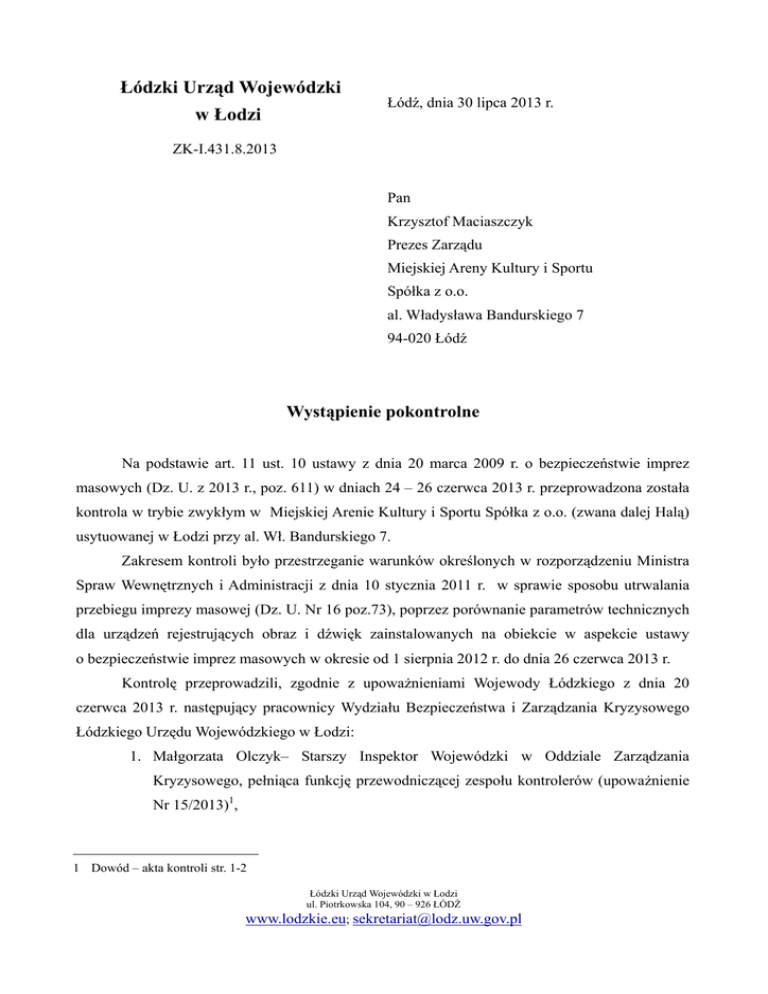 Łódzki Urząd Wojewódzki w Łodzi Łódź, dnia 30 lipca 2013 r. ZK-I.431.8.2013 Pan Krzysztof Maciaszczyk Prezes Zarządu Miejskiej Areny Kultury i Sportu Spółka z o.o. al. Władysława Bandurskiego 7 94-020 Łódź Wystąpienie pokontrolne Na podstawie art. 11 ust. 10 ustawy z dnia 20 marca 2009 r. o bezpieczeństwie imprez masowych (Dz. U. z 2013 r., poz. 611) w dniach 24 – 26 czerwca 2013 r. przeprowadzona została kontrola w trybie zwykłym w Miejskiej Arenie Kultury i Sportu Spółka z o.o. (zwana dalej Halą) usytuowanej w Łodzi przy al. Wł. Bandurskiego 7. Zakresem kontroli było przestrzeganie warunków określonych w rozporządzeniu Ministra Spraw Wewnętrznych i Administracji z dnia 10 stycznia 2011 r. w sprawie sposobu utrwalania przebiegu imprezy masowej (Dz. U. Nr 16 poz.73), poprzez porównanie parametrów technicznych dla urządzeń rejestrujących obraz i dźwięk zainstalowanych na obiekcie w aspekcie ustawy o bezpieczeństwie imprez masowych w okresie od 1 sierpnia 2012 r. do dnia 26 czerwca 2013 r. Kontrolę przeprowadzili, zgodnie z upoważnieniami Wojewody Łódzkiego z dnia 20 czerwca 2013 r. następujący pracownicy Wydziału Bezpieczeństwa i Zarządzania Kryzysowego Łódzkiego Urzędu Wojewódzkiego w Łodzi: 1. Małgorzata Olczyk– Starszy Inspektor Wojewódzki w Oddziale Zarządzania Kryzysowego, pełniąca funkcję przewodniczącej zespołu kontrolerów (upoważnienie Nr 15/2013)1, 1 Dowód – akta kontroli str. 1-2 Łódzki Urząd Wojewódzki w Łodzi ul. Piotrkowska 104, 90 – 926 ŁÓDŹ www.lodzkie.eu; [email protected] 2. Paweł Smulski - Informatyk w Oddziale Zarządzania Kryzysowego, pełniący funkcję kontrolera (upoważnienie Nr 17/2013). Ocenie poddano następujące zagadnienia: 1. Przygotowanie organizacyjne do realizacji zadań z zakresu bezpieczeństwa imprez masowych. 2. Sposób utrwalania przebiegu imprezy masowej, uwzględniając miejsce rejestracji na obiekcie. 3. Realizację obowiązków wynikających z Decyzji Wojewody Łódzkiego Nr ZK.I.5031-3/10 z dnia 26 lutego 2010 r. w sprawie umieszczenia hali sportowo – widowiskowej Atlas Arena usytuowanej w Łodzi przy al. Bandurskiego 7 w wykazie stadionów, obiektów i terenów, na których utrwalanie przebiegu imprez masowych za pomocą urządzeń rejestrujących obraz i dźwięk jest obowiązkowe. 4. Sposób gromadzenia, przechowywania i niszczenia materiałów z utrwalonych przebiegów imprez masowych organizowanych w Miejskiej Arenie Kultury i Sportu. 5. Stan techniczny i minimalne wymogi techniczne dla urządzeń rejestrujących obraz i dźwięk zainstalowanych w Hali, zgodnie z rozporządzeniem Ministra Spraw Wewnętrznych i Administracji z dnia 10 stycznia 2011 r. w sprawie sposobu utrwalania przebiegu imprezy masowej. Zgodnie z Krajowym Rejestrem Sądowym, Firma, pod którą działa spółka nosi nazwę „Miejska Arena Kultury i Sportu” Spółka z ograniczoną odpowiedzialnością, a organem uprawnionym do reprezentowania podmiotu jest Zarząd. Do składania oświadczeń w imieniu Spółki powołany jest Prezes Zarządu Pan Krzysztof Maciaszczyk2. 2 3 4 5 6 7 8 9 10 11 Dowód - akta kontroli str. 3-8 Dowód - akta kontroli str. 9-18 Dowód - akta kontroli str. 19-35 Dowód - akta kontroli str. 36-38 Dowód - płyta CD-R Dowód - akta kontroli str. 39-45 Dowód – akta kontroli str. 46-48 Dowód – akta kontroli str. 49 Dowód – akta kontroli str. 50 Dowód akta kontroli str. 51-52 Łódzki Urząd Wojewódzki w Łodzi ul. Piotrkowska 104, 90 – 926 ŁÓDŹ www.lodzkie.eu; [email protected] Przed przystąpieniem do czynności kontrolnych kontrolerzy dokonali w siedzibie Miejskiej Areny Kultury i Sportu wpisu do książki kontroli. Badaniem objęto dokumentację przedstawioną przez Prezesa Zarządu Miejskiej Areny Kultury i Sportu Spółka z o.o. - p. Krzysztofa Maciaszczyka. W ramach przygotowania organizacyjnego przedstawiono kontrolującym Akt Notarialny spisany 14 maja 2009 r. dotyczący utworzenia przez Miasto Łódź Spółki z ograniczoną odpowiedzialnością pod firmą „Miejska Arena Kultury i Sportu”3. Dołączono również umowę dzierżawy zawartą w dniu 17 czerwca 2009 r. pomiędzy Miastem Łódź a Spółką pod firmą „Miejska Arena Kultury i Sportu” Spółka z o.o. w przedmiocie dzierżawy nieruchomości zabudowanych położonych w Łodzi przy al. Władysława Bandurskiego 74. W toku czynności kontrolnych przedstawiono kontrolującym umowę zawartą pomiędzy Miejską Areną Kultury i Sportu Sp. z o.o. a ASD J. Ciegielski Spółka Komandytowa (na okres dwóch lat - obowiązującą od dnia 4 lipca 2012 r. do dnia 3 lipca 2014 r.) której przedmiotem jest usługa serwisowa instalacji teletechnicznych, która ma na celu utrzymanie w pełnej sprawności systemów monitorujących kontrolowanej Hali5. Na kontrolowanym obiekcie, system monitoringu wizyjnego składa się z 127 kamer cyfrowych obrotowych stałopozycyjnych. System CCTV został wdrożony w czerwcu 2009 r. przez firmę ASD sp. z o.o. Kontrolujący dysponuje dokumentacją powykonawczą systemu monitoringu wizyjnego dla obiektu „Hala widowiskowo – sportowa w Łodzi” Kategoria I, opracowany przez ASD sp. z o.o.6 Przedstawiono kontrolującym schemat rozmieszczenia poszczególnych elementów monitoringu, który pokrywał się ze stanem faktycznym. Wszystkie urządzenia były sprawne i w pełni funkcjonujące. W okresie objętym kontrolą system monitoringu zainstalowany w Hali był regularnie konserwowany7. Sposób montażu poszczególnych elementów monitoringu wypełnia zapisy § 4 ust. 1 i 2 rozporządzenia Ministra Spraw Wewnętrznych i Administracji z dnia 10 stycznia 2011 r. w sprawie sposobu utrwalania przebiegu imprezy masowej. Sprawdzenie sposobu utrwalania przebiegu imprezy masowej, uwzględniające miejsce rejestracji w Hali nastąpiło podczas imprezy masowej w dniu 25 czerwca 2013 r. (koncert zespołu TOTO). Sporządzono stosowny protokół oględzin8. System rejestrujący