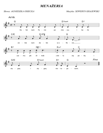 MENAŻERIA Słowa: AGNIESZKA OSIECKA Muzyka: SEWERYN KRAJEWSKI Ad lib. # & c ‰ j œ G j œ j œ Da -‐ łeś # C/E j ‰ & œ sie # B‰ 7 œ & J œ J sty -‐ gnę j # œ œ D 7/F nam œ J jak j œ i œ Pa -‐ nie j œ bie cze -‐ mu # G/D & œj œ nam j œ -‐ j œ da œ J D -‐ #o 7 łeś œ. j œ sty -‐ j œ œ po j j œ œ œ. D7 mie -‐ czu j œ w o œ J Em7 śli -‐ mak D 7sus4 j œ D 7sus4 i j œ j œ G -‐ j Cj œ œ œ œ gnę r r œ œ D7 nie -‐ to ˙. fie -‐ rze z bó -‐ lu œ be -‐ rle się pe -‐ rlę G -‐ œ pe -‐ œ rzem. Ó j œ i Fine