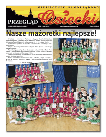 Nasze maŜoretki najlepsze! NUMER 56 (Kwiecień 2012) ISSN 1898-3200 W sobotę 14 kwietnia we Wschowie odbyły się Otwarte Mistrzostwa Mażoretek Polski Zachodniej. Była to również estrada kwalifikacyjna do Mistrzostw Polski Mażoretek, które odbędą się 11-13 maja w Opolu. Do Wschowy zjechało 12 zespołów z województwa lubuskiego i wielkopolskiego. Grupa z Osiecznej startowała w kategorii Baton (taniec z pałeczką) i zajęła 3 miejsce. Natomiast grupa z Kąkolewa startowała w kategorii Baton i Pom-Pom (taniec z pomponami) i w obu zajęła I miejsce! I grupa "Bryza" Kąkolewo otrzymała nominację do Mistrzostw Polski. Dziewczyny musiały zaprezentować się w układzie przemarszowym oraz w układzie na scenie. Blanka Prałat zatańczyła również solo z pałeczką i zajęła IV miejsce, a duet w kategorii pom-pom Blanka Prałat i Natalia Majchrzak zajął III miejsce. fot. Michał Sobański www.osieczna.pl/gazeta Cena 1,50 zł