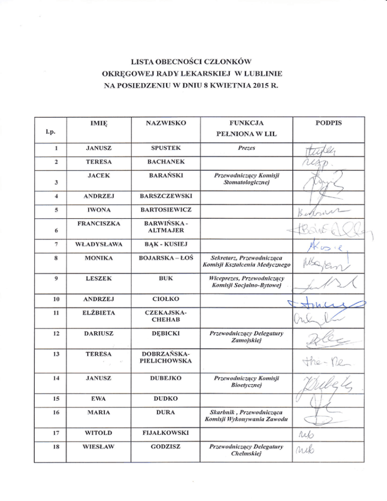 LISTA OBECNOŚCI CZŁONKÓW OKRĘGOWEJ RADY LEKARSKIEJ W LUBLINIE NA POSIEDZENIU W DNIU 8 KWIETNIA2015 R. IMIĘ NAZwIsKo FIJNKCJA PEŁNIONAW LIL 1 .IANUSz sPUsTEK Pfezes 2 TERESA BAcHANEK .IAcEK słnłŃsxr l,p. 3 4 ANDRzE.I BARSZCZEWSKI 5 IwoNA BARTOSIEWICZ FRANCISZKA BłnwrŃsxl- 6 PoDPIs rfuż, ,ąąt) Przewodnicący Komisji slomatologiczlrej BĄK KUSIEJ WŁADYSŁAWA 8 MoNIKA Bo.IARSKA 9 LEszEK BUK _ _ Łos 10 ANDRzE.I cIoŁKo 11 ELzBIETA czEKAJSKACHEHAB 12 DARIUsz DĘBICKI s e krelaĘ, Pftew o dnicząc a Ko misj i Ksłałcen ia Medj c arego TEREsA l4 JANUsZ DUBEJKo 15 EWA DUDKo l6 MARIA DURA 17 wIToLD FIJAŁKOWSKI 18 wIEsŁAw GoDzlsz lI"l>-< k"- ą tu^rrrł ący Wic epreze s, Przew o dtl ic Komi sj i S o cj aln o- Bytow ej =L,r,',' ,a ł w^r,ń -z'1 Pr zew o dn ic ząc), D e le gatu f), Zamojskiej ooBnzłŃsrł- 13 ,) llńr--n- ALTMAJER 7 * iią, - ilz__ PIELICHOWSKA Przewodnicąc! Komisji BioeĘ,carej S k ar b n ik, Prx,ew o dnicząc a Ko misj i |l/y k o nyw an ia Zaw o du ,"/,z l,/ r' Lllrs4 !/ l',!/ l/ \_- -Ł_ !;- W Przel, o dnicąc! D ele galułJ) Chehnskiej arń NAZWIsKo IMIĘ l.p. PoDPIs F,UNKc.IA PEŁMONAWLIL 19 .IAN ż0 DARIUsz ż1 BARBARA , HAŁABUDA Przew HANKIEWICZ Przewo dn HASIEc o dtt ic zący D e le g atu ry Bialskopodlaskiej, Przew o dtt ic zqcj Komisj i ds. Lekarql Seniorów i c ząc! L] ,(- ,\l,ż Komisj i Ku llu ly Czlonek Preątdium, Przewodtticąca Komisji ds. \l'W konkursów 22 JERzY JAKUBOWICZ 23 JANUsz KLEINRoK 24 MAREK LEWANDOWSKI 25 KRZYSZTOF LEWKOWICZ 26 MIRoSŁAw MIsZTAL 27 JAcEK NIEZABITOWSKI 28 GRZEGoRz PIETRAs 29 wo.IcIEcH PRAZMo 30 ANDRzEJ PRYsTUPA 31 MARIA RYss 3ż DARIUsz SAMBORSKI 33 MAREK STANKIEWICZ 34 wIoLETTA SZAFRANSKA- 35 JAcEK szKUTNIK 36 EWA TUSZKIEWICZ_ MIsZTAL 37 ANDRzEJ WYSOKINSKI 38 ANNA ZMYSŁOWSKA \l,/ ) t\tl,\4.ttł;ą/ it CJ' \łl U,b Rzecznik Płuw Lekarza / Członek Prezsltlium, ,// źi-a:^- pr7ewodnicący komisji Rekreacji i Spottu ,./- / ,.-/ //',/ 7/.,r-,4"YI ,'/,.---- bŃr-,. ,lr]D /\, '/ )fĆlł],n^'a,-ł W KocUN Wicepfezes Przew o dtt ic ąc a Ko misj i Ety k Czlonek Prcł)dium, Przew o dn icąc a Ko misj i ds. i Zmian Slstemowlch w Ochronie Zdnwia ',^J.-L, 4(]w""L1 |, W