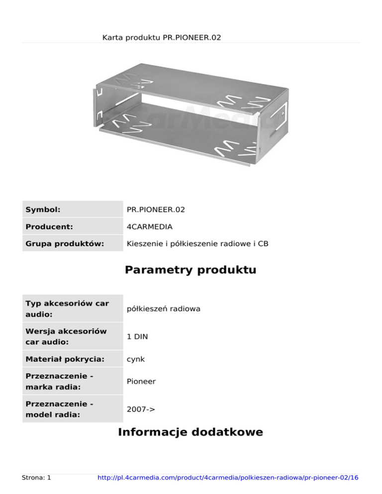 Karta produktu PR.PIONEER.02 Symbol: PR.PIONEER.02 Producent: 4CARMEDIA Grupa produktów: Kieszenie i półkieszenie radiowe i CB Parametry produktu Typ akcesoriów car audio: Wersja akcesoriów car audio: Materiał pokrycia: Przeznaczenie marka radia: Przeznaczenie model radia: półkieszeń radiowa 1 DIN cynk Pioneer 2007-> Informacje dodatkowe Strona: 1 http://pl.4carmedia.com/product/4carmedia/polkieszen-radiowa/pr-pioneer-02/16 Karta produktu PR.PIONEER.02 Masa brutto: Strona: 2 0,16 kg http://pl.4carmedia.com/product/4carmedia/polkieszen-radiowa/pr-pioneer-02/16