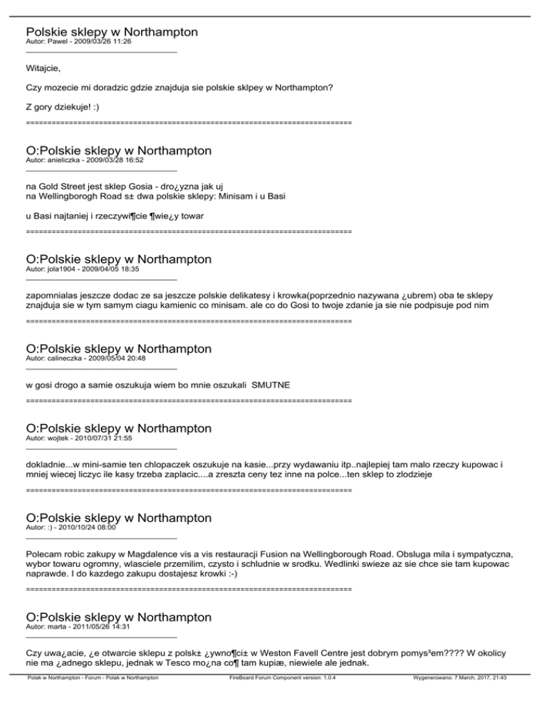 Polskie sklepy w Northampton Autor: Pawel - 2009/03/26 11:26 _____________________________________ Witajcie, Czy mozecie mi doradzic gdzie znajduja sie polskie sklpey w Northampton? Z gory dziekuje! :) ============================================================================ O:Polskie sklepy w Northampton Autor: anieliczka - 2009/03/28 16:52 _____________________________________ na Gold Street jest sklep Gosia - dro¿yzna jak uj na Wellingborogh Road s± dwa polskie sklepy: Minisam i u Basi u Basi najtaniej i rzeczywi¶cie ¶wie¿y towar ============================================================================ O:Polskie sklepy w Northampton Autor: jola1904 - 2009/04/05 18:35 _____________________________________ zapomnialas jeszcze dodac ze sa jeszcze polskie delikatesy i krowka(poprzednio nazywana ¿ubrem) oba te sklepy znajduja sie w tym samym ciagu kamienic co minisam. ale co do Gosi to twoje zdanie ja sie nie podpisuje pod nim ============================================================================ O:Polskie sklepy w Northampton Autor: calineczka - 2009/05/04 20:48 _____________________________________ w gosi drogo a samie oszukuja wiem bo mnie oszukali SMUTNE ============================================================================ O:Polskie sklepy w Northampton Autor: wojtek - 2010/07/31 21:55 _____________________________________ dokladnie...w mini-samie ten chlopaczek oszukuje na kasie...przy wydawaniu itp..najlepiej tam malo rzeczy kupowac i mniej wiecej liczyc ile kasy trzeba zaplacic....a zreszta ceny tez inne na polce...ten sklep to zlodzieje ============================================================================ O:Polskie sklepy w Northampton Autor: :) - 2010/10/24 08:00 _____________________________________ Polecam robic zakupy w Magdalence vis a vis restauracji Fusion na Wellingborough Road. Obsluga mila i sympatyczna, wybor towaru ogromny, wlasciele przemilim, czysto i schludnie w srodku. Wedlinki swieze az sie chce sie tam kupowac naprawde. I do kazdego zakupu dostajesz krowki :-) ============================================================================ O:Polskie sklepy w Northampton Autor: marta - 2011/05/26 14:31 _____________________________________ Czy uwa¿acie, ¿e otwarcie sklepu z polsk± ¿ywno¶ci± w Weston Favell Centre jest dobrym pomys³em???? W okolicy nie ma ¿adnego sklepu, jednak w Tesco mo¿na co¶ tam kupiæ, niewiele ale jednak. Polak w Northampton - Forum - Polak w Northampton FireBoard Forum Component version: 1.0.4 Wygenerowano: 7 March, 2017, 21:43 ============================================================================ Polak w Northampton - Forum - Polak w Northampton FireBoard Forum Component version: 1.0.4 Wygenerowano: 7 March, 2017, 21:43