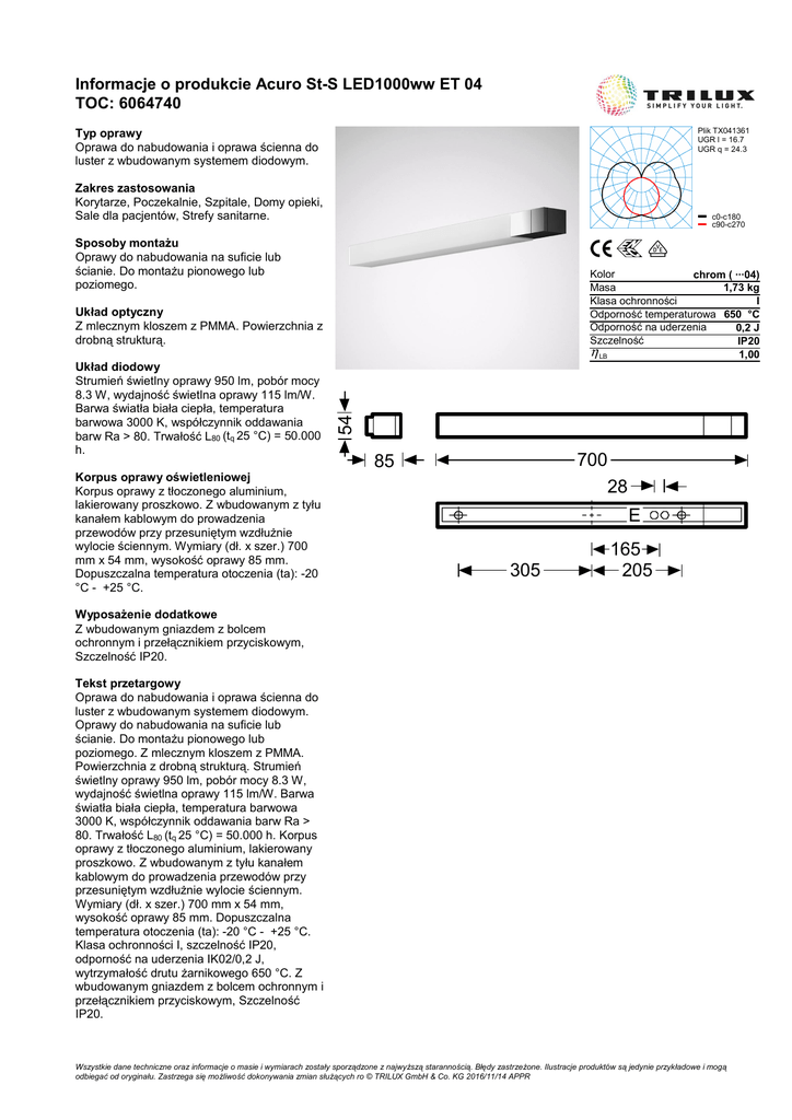 Informacje o produkcie Acuro St-S LED1000ww ET 04 TOC: 6064740 Typ oprawy Oprawa do nabudowania i oprawa ścienna do luster z wbudowanym systemem diodowym. Plik TX041361 UGR l = 16.7 UGR q = 24.3 Zakres zastosowania Korytarze, Poczekalnie, Szpitale, Domy opieki, Sale dla pacjentów, Strefy sanitarne. c0-c180 c90-c270 Sposoby montażu Oprawy do nabudowania na suficie lub ścianie. Do montażu pionowego lub poziomego. Kolor chrom ( ···04) Masa 1,73 kg Klasa ochronności I Odporność temperaturowa 650 °C Odporność na uderzenia 0,2 J Szczelność IP20 η LB 1,00 Układ diodowy Strumień świetlny oprawy 950 lm, pobór mocy 8.3 W, wydajność świetlna oprawy 115 lm/W. Barwa światła biała ciepła, temperatura barwowa 3000 K, współczynnik oddawania barw Ra > 80. Trwałość L80 (tq 25 °C) = 50.000 h. Korpus oprawy oświetleniowej Korpus oprawy z tłoczonego aluminium, lakierowany proszkowo. Z wbudowanym z tyłu kanałem kablowym do prowadzenia przewodów przy przesuniętym wzdłużnie wylocie ściennym. Wymiary (dł. x szer.) 700 mm x 54 mm, wysokość oprawy 85 mm. Dopuszczalna temperatura otoczenia (ta): -20 °C - +25 °C. 54 Układ optyczny Z mlecznym kloszem z PMMA. Powierzchnia z drobną strukturą. 700 28 85 E 305 165 205 Wyposażenie dodatkowe Z wbudowanym gniazdem z bolcem ochronnym i przełącznikiem przyciskowym, Szczelność IP20. Tekst przetargowy Oprawa do nabudowania i oprawa ścienna do luster z wbudowanym systemem diodowym. Oprawy do nabudowania na suficie lub ścianie. Do montażu pionowego lub poziomego. Z mlecznym kloszem z PMMA. Powierzchnia z drobną strukturą. Strumień świetlny oprawy 950 lm, pobór mocy 8.3 W, wydajność świetlna oprawy 115 lm/W. Barwa światła biała ciepła, temperatura barwowa 3000 K, współczynnik oddawania barw Ra > 80. Trwałość L80 (tq 25 °C) = 50.000 h. Korpus oprawy z tłoczonego aluminium, lakierowany proszkowo. Z wbudowanym z tyłu kanałem kablowym do prowadzenia przewodów przy przesuniętym wzdłużnie wylocie ściennym. Wymiary (dł. x szer.) 700 mm x 54 mm, wysokość oprawy 85 mm. Dopuszczalna temperatura otoczenia (ta): -20 °C - +25 °C. Klasa ochronności I, szczelność IP20, odporność na uderzenia IK02/0,2 J, wytrzymałość drutu żarnikowego 650 °C. Z wbudowanym gniazdem z bolcem ochronnym i przełącznikiem przyciskowym, Szczelność IP20. Wszystkie dane techniczne oraz informacje o masie i wymiarach zostały sporządzone z najwyższą starannością. Błędy zastrzeżone. Ilustracje produktów są jedynie przykładowe i mogą odbiegać od oryginału. Zastrzega się możliwość dokonywania zmian służących ro © TRILUX GmbH & Co. KG 2016/11/14 APPR