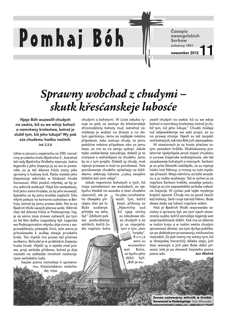 Časopis ewangelskich Serbow załoženy 1891 11 nowember 2012 Sprawny wobchad z chudymi – skutk křesćanskeje lubosće Njeje Bóh wuzwolił chudych na swěće, kiž su we wěrje bohaći a namrěwcy kralestwa, kotrež je slubił tym, kiž jeho lubuja? Wy pak sće chudemu hańbu načinili. Jak 2,5.6 Lětsa w januaru swjećachu so 300. narodniny pruskeho krala Bjedricha II., kotrehož tež rady Bjedricha Wulkeho mjenuja. Jedna legenda z jeho žiwjenja je so wo to postarała, zo je tež dźensa hišće znaty jako sprawny a ludowy kral. Pječa myleše jeho klepotanje wětrnika w bliskosći hroda Sanssouci. Wón poskići młynkej, zo by jemu wětrnik wotkupił. Hdyž tón wotpokaza, kral jemu samo hrožeše, zo by jeho wuswojił, bjezteho zo by jemu krošika zapłaćił. Tola młynk pokaza na komorne sudnistwo w Berlinje, kotrež by jemu prawo dało. Na to so Bjedrich Wulki swojich planow wzda. Wětrnik steji tež dźensa hišće w Podstupimje, haj, je so samo zaso znowa natwarił, po tym zo bě lěta dołho rozpadany był. Legenda wo Podstupimskim młynku drje nima z woprawdźitosću přewjele činić, tola wona je přinošowała k wulkej sławje pruskeho krala. Tón mjeńši ma prawo tež přećiwo wulkemu. Bohužel je w praktiskim žiwjenju husto hinak. Wjetši sy a wjetše maš prawo, praji serbske přisłowo, kotrež je drje nastało na zakładźe mnohich nazhonjenjow serbskeho luda. Swjate pismo namołwja k sprawnemu, křesćanskemu wobchadej mjez chudymi a bohatymi. W Lisće Jakuba rysuje so pad, zo zastupi do křesćanskeje zhromadźizny bohaty muž, kotrehož zamóženje je widźeć na drasće a na złotym pjeršćenju. Jemu so najlěpše městno připokaza. Jako zastupi chudy, so jemu pobóčne městno připokaza abo so jemu kaza, zo ma so na zemju sydnyć. Jakub tajke zadźerženje zasudźuje, dokelž je to zranjace a wohańbjace za chudeho. Jemu by so z tym prajiło: Dokelž sy chudy, maš mjenje prawow a maš so ponižować. Tola ponižowanje chudeho spřećiwja so bibliskemu zakonjej lubosće „Lubuj swojeho blišeho kaž sam sebje“. Jakub napomina bohatych a tych, kiž maja zamołwitosć we wosadach, zo njebychu hladali na wosobu a česć chudeho njezranili, ale jeho jako runohódneho čłowjeka přiwzali. Tym, kotřiž njejsu žiwi po lubosći, přihrozy so Bože sudźenje. „Njesmilny sud přińdźe na teho, kiž njeje smilny był.“ Zdobom pak su Jakubowe słowa pozbudźenje za chudych a za wšitkich, kotřiž čuja so mjenjehódni napřećo bohatym a tym „tam horjeka“. Runje woni su wuzwoleni wot Boha, zo bychu jeho dźěći byli. „Bóh je wu- zwolił chudych na swěće, kiž su we wěrje bohaći a namrěwcy kralestwa, kotrež je slubił tym, kiž jeho lubuja.“ Chudźi móžeja tuž sebjewědomje wo sebi prajić, zo su na prawej stronje. Njech su tež zacpěći wot bohatych, tak tola Bóh jich njezacpěwa. W stawiznach je so husto přećiwo tutym zasadam hrěšiło. Wuklukowany proletariat njedyrbješe jenož znjesć chudobu a surowe žiwjenske wobstejnosće, ale tež zacpěwanje bohatych a mócnych. Serbam je so přez lětstotki zašćěpiło, zo su mjenje hódni hač Němcy, a mnozy su tute myslenje přiwzali. Maja němčinu za bóle wosobnu a ju radšo wužiwaja. Tež w cyrkwi je so napřećo Serbam hrěšiło, wosebje potom, hdyž je so jim zapowědźiło serbske nabožne žiwjenje. W cyrkwi pak tajke myslenje knježić njesmě. Chudy ma so jenak česćić kaž bohaty, Serb runje tak kaž Němc. Bože słowo žada sej lubosć napřećo wšěm. Hač je Bjedrich Wulki woprawdźe socialny a sprawny był, wo tym njech stawiznarjo sudźa, kotřiž zamóžeja legendy wot woprawdźitosće dźělić. Kak ma so dźensa w našim kraju a w našim swěće chudym sprawnosć dóstać, wo tym dyrbja politikarjo po dokładnym pruwowanju móžnosćow rozsudźić. Zo pak mamy my wšitcy tym, kiž w čłowjeskej hierarchiji deleka steja, jich česć wostajić a jich jako Bože dźěći přiwzać, tole je po słowach Swjateho pisma jasna wěc. Jan Malink Znowa natwarjeny wětrnik w hrodźe Sanssouci w Podstupimje Foto: Wikimedia 2 nowember 2012 Pomhaj Bóh A w templu w Jerusalemje B w templu w Betlehemje C při jězoru Getsemane (n) (k) (a) 8. Hdźe da so Jezus wukřćić? A w jězoru Getsemane B w rěce Jordanu C w templu Jerusalema (p) (j) (b) Bibliske hódančko Lube dźěći, dźensa chcu was z bibliskim hódančkom zawjeselić. Hdyž sće prawu wotmołwu namakali, sadźće pismik w spinkach do kašćika z wotpowědnym čisłom prašenja. Wučitaće potom mjeno swjateho, na kotrehož tutón měsac wosebje spominamy. Gabriela Gruhlowa 1. Kelko psalmow steji w bibliji? A 145 (o) B 150 (a) C 138 (u) 2. Kak rěkaše žona Izaaka? A Rebekka B Mirjam C Salome (r) (m) (s) 3. Kelko bratrow měješe Jozef? A 10 B 11 C 12 (r) (w) (l) 4. Kak stary běše Jozef, jako jeho do Egyptowskeje předachu? A 17 (t) B 12 (š) C 13 (w) 5. Kak rěkaše město, kotrehož měšćanske murje so rozwalichu, jako truby trubjachu a Israelića wótře wołachu? A Jerusalem (n) B Kapernaum (f) C Jericho (m) 6. Kotry profet připowědźi přichad Božeho Syna? A Sacharja (č) B Habakuk (dź) C Micha (ć) 7. Hdźe nadeńdźeštaj Marja a Jozef 12lětneho Jezusa? 10 3 8 1 4 12 Dopis přećela Serbow z Čěskeje Česćeny knježe superintendento, lětsa sym na Praskich knižnych wikach 12. čisło (december) 2011 Wašeho časopisa Pomhaj Bóh dóstał a sym so jara zwjeselił, zo Waš časopis přeco hišće wuchadźa. Prěni króć je mi něšto čisłow tutoho časopisa njeboh knjez superintendent Wirth w lěće 1974 darił. Z wulkim zajimom sym wo knjezu fararju Christophje Rummelu čitał, sym mjenujcy dwanaće lět w Rumunskej skutkował. Sym w Bukaresće na uniwersiće čěšćinu wučił a sym tam tež serbski rěčny kurs nawjedował a wučbnicu serbšćiny napisał (fragmenty z tuteje knihi móžeće sej na mojich webowych stronach wobhladać). Na Praskich wikach sym sej tež CD z Jana Kilianowym