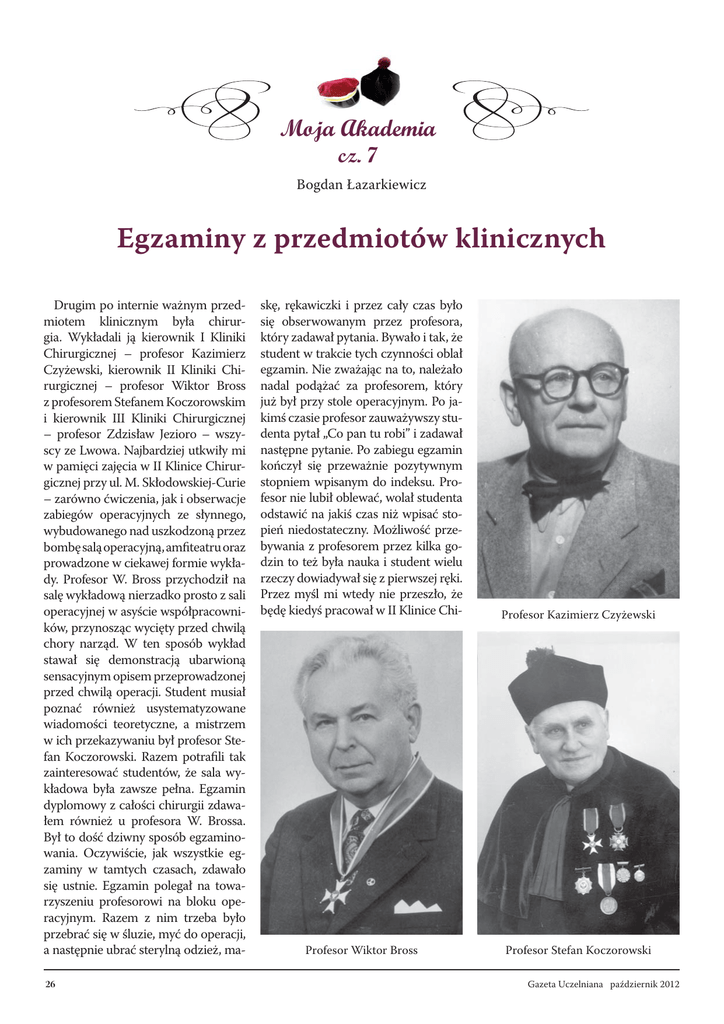 Moja Akademia cz. 7 Bogdan Łazarkiewicz Egzaminy z przedmiotów klinicznych Drugim po internie ważnym przedmiotem klinicznym była chirurgia. Wykładali ją kierownik I Kliniki Chirurgicznej – profesor Kazimierz Czyżewski, kierownik II Kliniki Chirurgicznej – profesor Wiktor Bross z profesorem Stefanem Koczorowskim i kierownik III Kliniki Chirurgicznej – profesor Zdzisław Jezioro – wszyscy ze Lwowa. Najbardziej utkwiły mi w pamięci zajęcia w II Klinice Chirurgicznej przy ul. M. Skłodowskiej-Curie – zarówno ćwiczenia, jak i obserwacje zabiegów operacyjnych ze słynnego, wybudowanego nad uszkodzoną przez bombę salą operacyjną, amfiteatru oraz prowadzone w ciekawej formie wykłady. Profesor W. Bross przychodził na salę wykładową nierzadko prosto z sali operacyjnej w asyście współpracowników, przynosząc wycięty przed chwilą chory narząd. W ten sposób wykład stawał się demonstracją ubarwioną sensacyjnym opisem przeprowadzonej przed chwilą operacji. Student musiał poznać również usystematyzowane wiadomości teoretyczne, a mistrzem w ich przekazywaniu był profesor Stefan Koczorowski. Razem potrafili tak zainteresować studentów, że sala wykładowa była zawsze pełna. Egzamin dyplomowy z całości chirurgii zdawałem również u profesora W. Brossa. Był to dość dziwny sposób egzaminowania. Oczywiście, jak wszystkie egzaminy w tamtych czasach, zdawało się ustnie. Egzamin polegał na towarzyszeniu profesorowi na bloku operacyjnym. Razem z nim trzeba było przebrać się w śluzie, myć do operacji, a następnie ubrać sterylną odzież, ma26 skę, rękawiczki i przez cały czas było się obserwowanym przez profesora, który zadawał pytania. Bywało i tak, że student w trakcie tych czynności oblał egzamin. Nie zważając na to, należało nadal podążać za profesorem, który już był przy stole operacyjnym. Po jakimś czasie profesor zauważywszy studenta pytał „Co pan tu robi” i zadawał następne pytanie. Po zabiegu egzamin kończył się przeważnie pozytywnym stopniem wpisanym do indeksu. Profesor nie lubił oblewać, wolał studenta odstawić na jakiś czas niż wpisać stopień niedostateczny. Możliwość przebywania z profesorem przez kilka godzin to też była nauka i student wielu rzeczy dowiadywał się z pierwszej ręki. Przez myśl mi wtedy nie przeszło, że będę kiedyś pracował w II Klinice Chi- Profesor Kazimierz Czyżewski Profesor Wiktor Bross Profesor Stefan Koczorowski Gazeta Uczelniana październik 2012 Autor przy aparacie sztuczne płuco-serce typu Kay Cross (1963 r.) rurgicznej, że będę świadkiem pionierskich zabiegów kardiochirurgicznych i współuczestnikiem (jako perfuzjonista) pierwszego krążenia pozaustrojowego i zabiegu na otwartym sercu wykonanego przez profesora Wiktora Brossa (12.04.1961 r.) oraz świadkiem pierwszego w Polsce przeszczepu nerki od żywego dawcy (1966 r.). Pediatrię wykładała profesor Hanna Hirszfeldowa, dermatologię profesor Henryk Mierzecki ze Lwowa, radiologię docent St. Kubrakiewicz, położnictwo i ginekologię profesor Stanisław Krzysztoporski, profesor Kazimierz Jabłoński ze Lwowa i prof Kazimierz No- Profesor Zdzisław Jezioro Gazeta Uczelniana październik 2012 Profesor Kazimiez Nowosad gratuluje autorowi habilitacji (1972 r.) wosad, typowy Lwowiak. Ten pierwszy odszedł nagle z naszej Uczelni w 1953 r. Powód określilibyśmy dzisiaj delikatnie – „nierzetelność naukowa” (podręcznik „Patofizjologia ciąży”). 30 stycznia 1954 r. zdałem egzamin z ginekologii i położnictwa u profesora Kazimierza Nowosada, który był lubiany zarówno przez studentów, współpracowników, jak i przez pacjentki. Do głowy mi wtedy nie przyszło, że będę w przyszłości konsultował chirurgicznie jego klinikę. W latach 70. wspólnie z profesorem K. Nowosadem operowaliśmy pacjentkę w ciężkim stanie z rozlanym zapaleniem otrzewnej, przyjętą ze szpitala terenowego, gdzie przed kilkoma tygodniami rodziła cięciem cesarskim. Przyczynę znaleźliśmy w jamie brzusznej – corpus alienum... Z przedmiotów klinicznych muszę jeszcze wymienić choroby zakaźne (profesor Józef Kaniak), okulistykę (prof. Witold Kapuściński), laryngologię (prof. Wiktor Jankowski), psychiatrię (prof. Adrian Demianowski) i neurologię (prof. Rudolf Arend). Egzamin z neurologii to jedyny, który zdałem z wynikiem celującym, co zawdzięczam kilkuletniej pracy w Zakładzie Anatomii Opisowej u prof. Tadeusza Marciniaka (doskonała znajomość anatomii układu nerwowego). Profesor A. Demianowski jeszcze przed naszym absolutorium został usunięty z kliniki i dopiero w 1957 r. przywrócono mu ponownie kierownictwo Kliniki Psychiatrii. Nagonka na profesora była znana w uczelni również studentom. Przytaczano dwa incydenty związane z zajęciami na psychiatrii: w czasie badania w obecności profesora student zapytał chorego, kto to jest Stalin. Podobno odpowiedź brzmiała „największy tchórz świata, bo schował się za czerwoną płachtą”. Drugi zdarzył się w czasie wykładu, gdy profesor demonstrował chorą na schizofrenię, a ta uklękła i głośno przepraszała Pana Boga za to, że zapisała się do partii. Wspomnę jeszcze o przedmiocie „stomatologia”, który prowadził prof Tadeusz Owiński, Lwowiak. Tego przedmiotu już dzisiaj na Wydziale Lekarskim nie ma, a szkoda... W czasie ćwiczeń każdy z nas musiał zaliczyć usunięcie dwóch zębów. Pierwsza wykonana przeze mnie ekstrakcja zakończyła się fatalnie. Brak było pacjentów i nasz kolega, Leon Kapłański, zgłosił się na ochotnika. Znieczuliłem go i wtedy zabieg musiał skończyć asystent, ponieważ za dużo siły użyłem i zęba złamałem. Następną ekstrakcję udało mi się wykonać prawidłowo. (Zdjęcia pochodzą z archiwum autora) 27