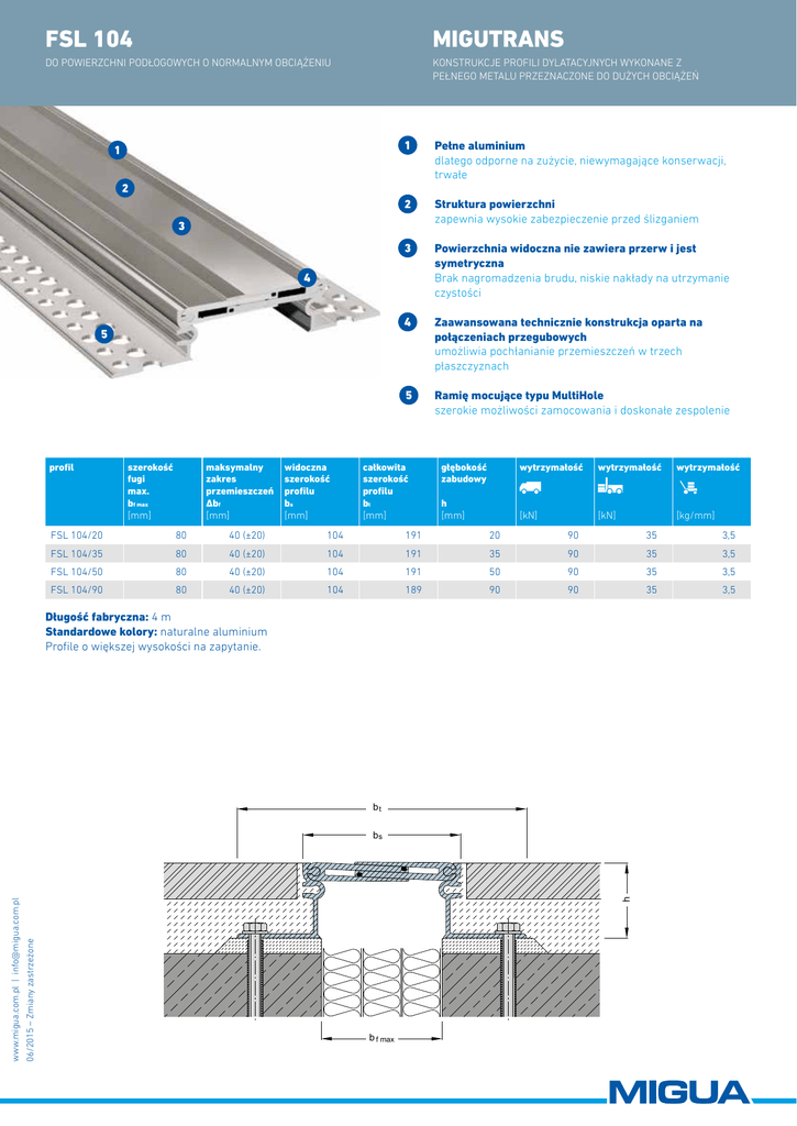 FSL 104 MIGUTRANS DO POWIERZCHNI PODŁOGOWYCH O NORMALNYM OBCIĄŻENIU KONSTRUKCJE PROFILI DYLATACYJNYCH WYKONANE Z PEŁNEGO METALU PRZEZNACZONE DO DUŻYCH OBCIĄŻEŃ Pełne aluminium dlatego odporne na zużycie, niewymagające konserwacji, trwałe Struktura powierzchni zapewnia wysokie zabezpieczenie przed ślizganiem Powierzchnia widoczna nie zawiera przerw i jest symetryczna Brak nagromadzenia brudu, niskie nakłady na utrzymanie czystości Zaawansowana technicznie konstrukcja oparta na połączeniach przegubowych umożliwia pochłanianie przemieszczeń w trzech płaszczyznach Ramię mocujące typu MultiHole szerokie możliwości zamocowania i doskonałe zespolenie profil szerokość fugi max. bf max [mm] maksymalny zakres przemieszczeń ∆bf [mm] widoczna szerokość profilu bs [mm] całkowita szerokość profilu bt [mm] głębokość zabudowy h [mm] wytrzymałość wytrzymałość wytrzymałość [kN] [kN] [kg/mm] FSL 104/20 80 40 (±20) 104 191 20 90 35 3,5 FSL 104/35 80 40 (±20) 104 191 35 90 35 3,5 FSL 104/50 80 40 (±20) 104 191 50 90 35 3,5 FSL 104/90 80 40 (±20) 104 189 90 90 35 3,5 Długość fabryczna: 4 m Standardowe kolory: naturalne aluminium Profile o większej wysokości na zapytanie. bt h 06/2015 – Zmiany zastrzeżone www.migua.com.pl | [email protected] bs b f max