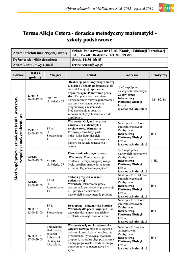 Oferta szkoleniowa MODM, wrzesień 2015 - styczeń 2016 Teresa Alicja Cetera - doradca metodyczny matematyki szkoły podstawowe Adres i telefon macierzystej szkoły Dyżur w siedzibie doradców Adres kontaktowy e-mail Sieci współpracy i samokształcenia, warsztaty, zespoły samokształceniowe Forma Data i godziny 23.09.15 16:00-19:00 25.09.15 15:00-18:00 7.10.15 16:00-19:00 8.10.15 15:00-18:00 20.10.15 15:00-18:00 26.10.2015 17:00-20:00 Miejsce MODM ul. Poleska 27 SP nr 1, ul. Słowackiego 4 MODM ul. Poleska 27 Szkoła Podstawowa nr 12, ul. Komisji Edukacji Narodowej 1A, 15- 687 Białystok, tel. 85 6793880 Środa 14:30-15:15 [email protected] Temat Realizacja podstawy programowej w klasie IV szkoły podstawowej (II etap edukacyjny). Spotkanie organizacyjne. Planowanie pracy sieci. Cel pracy sieci: wymiana doświadczeń w zakresie planowania i realizacji wymagań podstawy programowej z matematyki Sieć ma charakter otwarty, zapraszam chętnych nauczycieli do współpracy. Warsztaty: Origami w pracy nauczyciela matematyki i wychowawcy. Warsztaty: Prostokąty, kwadraty, paski, koła: świat figur płaskich i przestrzennych wyczarowanych z papieru na użytek nauczyciela i ucznia Planowanie własnego rozwoju. Warsztaty: Przewiduj swoje działania. Przeżyj przygodę swego życia, zrealizuj marzenia. A zacznij już teraz. Daj uczniom przykład. SP 44 ul. Rumiankowa 13 Metoda projektu w szkole podstawowej Warsztaty: Planowanie pracy, realizacja, kryteria oceny, prezentacja i … pożytek dla uczniów i nauczycieli z pracy metodą projektu SP 1, ul. Słowackiego 4 Decoupage - matematyka i sztuka Warsztaty dla początkujących: Jak, używając dostępnych materiałów, przekształcać najbliższe otoczenie Politechnika Białostocka, Wydział Informatyki, ul. Wiejska 45a, sala 3c Warsztaty origami i matematyka Origami rozwija:myślenie logiczne, twórcze, konstrukcyjne, wyobraźnię przestrzenną, sytuacyjną, wyczucie proporcji, naturalną chęć poznawania otaczającego świata - czyli to, czego potrzebujemy na matematyce i w życiu. Adresaci Priorytety Sieć współpracy nauczycieli matematyki Zapisy przez Internetową Platformę Obsługi http:// ipo.modm.bialystok.pl M4, P2, B6 Nauczyciele SP 1 oraz inni zainteresowani Zapisy przez Internetową Platformę Obsługi http:// ipo.modm.bialystok.pl Sieć współpracy nauczycieli matematyki Zapisy przez Internetową Platformę Obsługi http:// ipo.modm.bialystok.pl Nauczyciele SP 44 oraz inni zainteresowani Zapisy przez Internetową Platformę Obsługi http:// ipo.modm.bialystok.pl Nauczyciele SP 1 oraz inni zainteresowani Zapisy przez Internetową Platformę Obsługi http:// ipo.modm.bialystok.pl Nauczyciele oraz inni zainteresowani Zapisy przez Internetową Platformę Obsługi http:// ipo.modm.bialystok.pl B4a 1, B2 B4a B4a B4a Oferta szkoleniowa MODM, wrzesień 2015 - styczeń 2016 Sieci współpracy i samokształcenia, warsztaty, zespoły samokształceniowe Forma Data i godziny 4.11.15 16:00-19:00 MODM ul. Poleska 27 16.11.15 17:00-20:00 Politechnika Białostocka, Wydział Informatyki, ul. Wiejska 45a, sala 3c 17.11.15 16:00-19:00 07.12.15 17:00-20:00 11.01.16 17:00-20:00 Lekcje otwarte Forma Miejsce Data i godziny 12.11.2015 12:50-14:35 MODM ul. Poleska 27 Politechnika Białostocka, Wydział Informatyki, ul. Wiejska 45a, sala 3c Politechnika Białostocka, Wydział Informatyki, ul. Wiejska 45a, sala 3c Miejsce SP 12, ul. KEN 1A Temat Adresaci Przyczyny osiągnięć i problemów w realizacji programu nauczani a matematyki Cel pracy sieci: wymiana doświadczeń w zakresie realizacji programów nauczania matematyki. Sieć ma charakter otwarty, zapraszam chętnych nauczycieli do współpracy. Warsztaty origami i matematyka. Origami rozwija: myślenie logiczne, twórcze, konstrukcyjne, wyobraźnię przestrzenną, sytuacyjną, wyczucie proporcji, naturalną chęć poznawania otaczającego świata - czyli to, czego potrzebujemy na matematyce i w życiu. Innowacje oświatowe w kraju i na świecie...P2, B3 Konferencje SNM, Bridges i inne - jako inspiracja do pracy nauczycieli matematyki Warsztaty origami i matematyka Origami rozwija:myślenie logiczne, twórcze, konstrukcyjne, wyobraźnię przestrzenną, sytuacyjną, wyczucie proporcji, naturalną chęć poznawania otaczającego świata - czyli to, czego potrzebujemy na matematyce i w życiu. Warsztaty origami i matematyka Origami rozwija:myślenie logiczne, twórcze, konstrukcyjne, wyobraźnię przestrzenną, sytuacyjną, wyczucie proporcji, naturalną chęć poznawania otaczającego świata - czyli to, czego potrzebujemy na matematyce i w życiu. Temat Zastosowanie różnych metod pracy i oceniania. Temat bieżący w klasie 4. Priorytety Nauczyciele oraz inni zainteresowani Zapisy przez Internetową Platformę Obsługi http:// ipo.modm.bialystok.pl B4a Nauczyciele oraz inni zainteresowani Zapisy przez Internetową Platformę Obsługi http:// ipo.modm.bialystok.pl B4a Nauczyciele oraz inni zainteresowani Zapisy przez Internetową Platformę Obsługi http:// ipo.modm.bialystok.pl P2, B3 Nauczyciele oraz inni zainteresowani Zapisy przez Internetową Platformę Obsługi http:// ipo.modm.bialystok.pl B4a Nauczyciele oraz inni zainteresowani Zapisy przez Internetową Platformę Obsługi http:// ipo.modm.bialystok.pl B4a Adresaci Priorytety Nauczyciele matematyki -II etap edukacyjny. Zapisy przez Internetową Platformę Obsługi http:// ipo.modm.bialystok.pl B4a