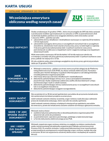 KARTA USŁUGI USTALANIE UPRAWNIEŃ DO ŚWIADCZEŃ Wcześniejsza emerytura obliczona według nowych zasad KOGO DOTYCZY? Osoby urodzonej po 31 grudnia 1948 r., która nie przystąpiła do OFE lub złoży wniosek o przekazanie środków zgromadzonych na rachunku w OFE za pośrednictwem ZUS na dochody budżetu państwa oraz osiągnęła obniżony wiek emerytalny i przed 1 stycznia 1999 r., spełniła warunki: • udowodniła okresy składkowe i nieskładkowe wynoszące co najmniej 20 lat kobieta i 25 lat mężczyzna • udowodniła wymagany okres pracy w szczególnych warunkach lub w szczególnym charakterze, działalności twórczej lub artystycznej, pracy na kolei bądź co najmniej 5 lat pracy górniczej wykonywanej stale i w pełnym wymiarze czasu pracy pod ziemią lub na odkrywce w kopalniach siarki i węgla brunatnego oraz kopalniach otworowych siarki. Wiek emerytalny wynoszący 60 lat dla kobiet i 65 lat dla mężczyzn obniża się o 6 miesięcy za każdy rok pracy górniczej wykonywanej stale i w pełnym wymiarze czasu pracy, jednak nie więcej niż o 15 lat. W celu ustalenia wieku emerytalnego uwzględnia się okresy pracy górniczej przebyte także po 31 grudnia 1998 r. JAKIE DOKUMENTY SĄ WYMAGANE? • Wniosek o emeryturę – pobierz ze strony www.zus.pl lub zaloguj się do Platformy Usług Elektronicznych ZUS (PUE), by złożyć wniosek elektronicznie. Formularz wniosku jest również dostępny w punkcie informacyjnym w sali obsługi klientów w każdej jednostce organizacyjnej ZUS • informacja dotycząca okresów składkowych i nieskładkowych • dokumenty potwierdzające okresy m.in.: pracy/ prowadzenia działalności pozarolniczej/ służby wojskowej/ pobierania zasiłku dla bezrobotnych/ urlopu wychowawczego/ nauki w szkole wyższej • dokumenty potwierdzające okresy wykonywania pracy w szczególnych warunkach lub w szczególnym charakterze • dokumenty potwierdzające osiągane wynagrodzenie. Nie wcześniej niż na 30 dni przed spełnieniem warunków do przyznania świadczenia lub zamierzonym terminem przejścia na emeryturę. KIEDY ZŁOŻYĆ DOKUMENTY? Jeżeli wniosek zostanie złożony wcześniej, organ rentowy wyda decyzję o odmowie prawa do świadczenia wskazując, które warunki nie zostały spełnione. Jeżeli wniosek zostanie złożony w kolejnych miesiącach po spełnieniu warunków do emerytury, prawo do świadczenia zostanie ustalone od miesiąca zgłoszenia wniosku. GDZIE I W JAKI SPOSÓB ZŁOŻYĆ DOKUMENTY? JAK I KIEDY ZUS ZAŁATWI SPRAWĘ? Wniosek można złożyć: • osobiście lub przez pełnomocnika w dowolnej jednostce organizacyjnej ZUS (pisemnie lub ustnie do protokołu) • za pośrednictwem: operatora pocztowego, polskiego urzędu konsularnego • w formie dokumentu elektronicznego przez PUE. Wniosek rozpatruje organ rentowy właściwy ze względu na miejsce zamieszkania osoby zainteresowanej lub jednostka organizacyjna Zakładu wyznaczona przez Prezesa ZUS. Po analizie wniosku i załączonej dokumentacji oraz ewentualnym przeprowadzeniu postępowania wyjaśniającego organ rentowy wydaje decyzję w terminie 30 dni od wyjaśnienia ostatniej okoliczności niezbędnej do wydania decyzji. CZY MOŻNA SIĘ ODWOŁAĆ? Od decyzji przysługuje odwołanie, które należy wnieść pisemnie lub ustnie do protokołu, za pośrednictwem jednostki organizacyjnej ZUS, która wydała decyzję, do sądu okręgowego – sądu pracy i ubezpieczeń społecznych, w terminie miesiąca od dnia doręczenia decyzji. Postępowanie odwoławcze jest wolne od opłat. Osoby z tej grupy wiekowej mogą wystąpić z wnioskiem o przyznanie emerytury z tytułu zatrudnienia w szczególnych warunkach lub w szczególnym charakterze najpóźniej w dniu poprzedzającym dzień osiągnięcia powszechnego wieku emerytalnego. Osoba, która udowodniła wykonywanie pracy w szczególnych warunkach lub w szczególnym charakterze przez okres co najmniej 15 lat i nie skorzystała z możliwości nabycia prawa do emerytury wcześniejszej, emerytury pomostowej lub nauczycielskiego świadczenia kompensacyjnego, ma prawo do rekompensaty ustalanej jako dodatek do kapitału początkowego uwzględnianego przy obliczeniu emerytury powszechnej. Aby uzyskać bliższe informacje, przejdź do karty rekompensata z tytułu pracy w szczególnych warunkach lub w szczególnym charakterze. Prawo do emerytury ulega zawieszeniu w przypadku kontynuowania zatrudnienia, bez uprzedniego rozwiązania stosunku pracy, u tego samego pracodawcy, na rzecz którego emeryt wykonywał je bezpośrednio przed dniem nabycia prawa do emerytury. INFORMACJE DODATKOWE Przy ustalaniu prawa do emerytury oraz obliczaniu jej wysokości okresy nieskładkowe uwzględnia się w wymiarze nieprzekraczającym jednej trzeciej udowodnionych okresów składkowych. Wniosek może zostać wycofany, jednakże nie później niż do dnia uprawomocnienia się decyzji organu rentowego, tj. w przypadku, gdy nie zostało złożone odwołanie do sądu – w terminie miesiąca od daty doręczenia decyzji. Przy załatwianiu formalności można skorzystać z pomocy pracowników ZUS: • w Centrum Obsługi Telefonicznej —— pod numerem telefonu 22 560 16 00 (opłata za połączenie jest zgodna z planem taryfikacyjnym danego operatora) —— za pośrednictwem e-maila [email protected] —— przez komunikator Skype na stronie www.zus.pl lub pod zus_centrum_obslugi_tel —— przez czat na stronie www.zus.pl konsultanci są dostępni w dni robocze: pon.–pt. w godz. 7.00–18.00 • w najbliższej jednostce organizacyjnej ZUS lub uzyskać informację na stronie internetowej www.zus.pl. PODSTAWA PRAWNA • Ustawa z dnia 17 grudnia 1998 r. o emeryturach i rentach z Funduszu Ubezpieczeń Społecznych • Rozporządzenie Ministra Pracy i Polityki Społecznej z dnia 11 października 2011 r. w sprawie postępowania o świadczenia emerytalno-rentowe • Rozporządzenie Rady Ministrów z dnia 7 lutego 1983 r. w sprawie wieku emerytalnego pracowników zatrudnionych w 