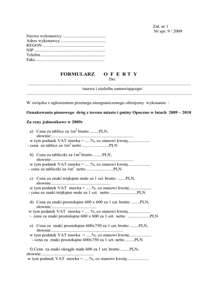 Zał. nr 1 Nr spr. 9 / 2009 Nazwa wykonawcy ....................................... Adres wykonawcy ........................................ REGON ....................................................... NIP ............................................................... Telefon ......................................................... Faks.............................................................. FORMULARZ O F E RT Y Do: .................................................................................................................................................. /nazwa i siedziba zamawiającego/ .................................................................................................................................................... W związku z ogłoszeniem przetargu nieograniczonego oferujemy wykonanie : Oznakowania pionowego dróg z terenu miasta i gminy Opoczno w latach 2009 – 2010 Za ceny jednostkowe w 2009r a) Cena za tablice za 1m2 brutto ........PLN, słownie:......................................................................... w tym podatek VAT stawka = .....%, co stanowi kwotę.................... - cena za tablice za 1m2 netto ........................PLN b) Cena za tabliczki za 1m2 brutto ........PLN, słownie:......................................................................... w tym podatek VAT stawka = .....%, co stanowi kwotę.................... - cena za tabliczki za 1m2 netto ........................PLN c) Cena za znaki trójkątne małe za 1 szt. brutto ........PLN, słownie:..................................................... w tym podatek VAT stawka = .....%, co stanowi kwotę.................... - cena za znaki trójkątne małe za 1 szt. netto ........................PLN d) Cena za znaki prostokątne 600 x 600 za 1 szt. brutto ........PLN, słownie:........................................ w tym podatek VAT stawka = .....%, co stanowi kwotę.................... - cena za znaki prostokątne 600 x 600 za 1 szt. netto ....................PLN e) Cena za znaki prostokątne 600x750 za 1 szt. brutto ........PLN, słownie:................................................................ w tym podatek VAT stawka = .....%, co stanowi kwotę.................... - cena za znaki prostokątne 600x750 za 1 szt. netto ........PLN f) Cena za znaki okrągłe małe 600 za 1 szt. brutto ........PLN, słownie:............................................... w tym podatek VAT stawka = .....%, co stanowi kwotę.................... - cena za znaki okrągłe małe 600 za 1 szt. netto ..................PLN g) Cena za stop średni za 1 szt. brutto ..............PLN, słownie:.................................................................... w tym podatek VAT stawka = .....%, co stanowi kwotę.................... - cena za stop średni za 1 szt. netto ..............PLN h) Cena za znaki ustawione przed przejazdami kolejowymi G-1a, G-1b, G-1c, G-1d, G-1e, G-1f, odblaskowe za 1 szt. brutto .............PLN, słownie:................................................................................ w tym podatek VAT stawka = .....%, co stanowi kwotę............ - cena za znaki ustawione przed przejazdami kolejowymi G-1a, G-1b, G-1c, G-1d, G-1e, G-1f, odblaskowe za 1 szt. netto ................. PLN i) Cena za słupki ocynkowane do znaków drogowych 1,5’’ za 1 mb brutto ........PLN, słownie:................................... w tym podatek VAT stawka = .....%, co stanowi kwotę............. - cena za słupki ocynkowane do znaków drogowych 1,5’’ za 1 mb netto ........PLN j) Cena za obejmy do znaków za 1 komplet brutto ........PLN, słownie:............................................. w tym podatek VAT stawka = .....%, co stanowi kwotę............. - cena za obejmy do znaków za 1 komplet netto ........PLN Za ceny jednostkowe w 2010r a) Cena za tablice za 1m2 brutto ........PLN, słownie:......................................................................... w tym podatek VAT stawka = .....%, co stanowi kwotę.................... - cena za tablice za 1m2 netto ........................PLN b) Cena za tabliczki za 1m2 brutto ........PLN, słownie:......................................................................... w tym podatek VAT stawka = .....%, co stanowi kwotę.................... - cena za tabliczki za 1m2 netto ........................PLN c) Cena za znaki trójkątne małe za 1 szt. brutto ........PLN, słownie:..................................................... w tym podatek VAT stawka = .....%, co stanowi kwotę.................... - cena za znaki trójkątne małe za 1 szt. netto ........................PLN d) Cena za znaki prostokątne 600 x 600 za 1 szt. brutto ........PLN, słownie:........................................ w tym podatek VAT stawka = .....%, co stanowi kwotę.................... - cena za znaki prostokątne 600 x 600 za 1 szt. netto ....................PLN e) Cena za znaki prostokątne 600x750 za 1 szt. brutto ........PLN, słownie:................................................................ w tym podatek VAT stawka = .....%, co stanowi kwotę.................... - cena za znaki prostokątne 600x750 za 1 szt. netto ........PLN f) Cena za znaki okrągłe małe 600 za 1 szt. brutto ........PLN, słownie:............................................... w tym podatek VAT stawka = .....%, co stanowi kwotę.................... - cena za znaki okrągłe małe 600 za 1 szt. netto ..................PLN g) Cena za stop średni za 1 szt. brutto ..............PLN, słownie:.................................................................... w tym podatek VAT stawka = .....%, co stanowi kwotę.................... - cena za stop średni za 1 szt. netto ..............PLN h) Cena za znaki ustawione przed przejazdami kolejowymi G-1a, G-1b, G-1c, G-1d, G-1e, G-1f, odblaskowe za 1 szt. brutto .............PLN, słownie:................................................................................ w tym podatek VAT stawka = .....%, co stanowi 