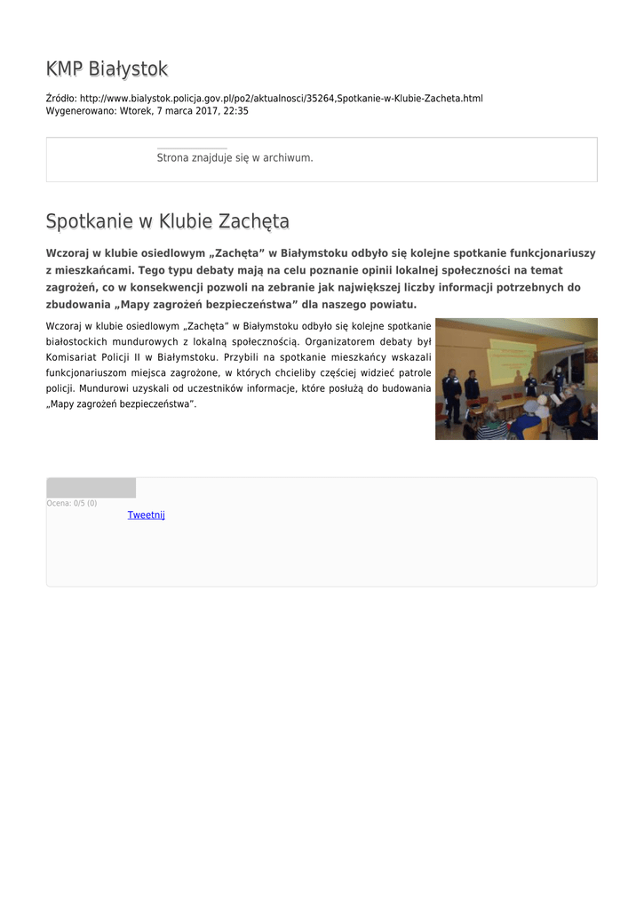 KMP Białystok Źródło: http://www.bialystok.policja.gov.pl/po2/aktualnosci/35264,Spotkanie-w-Klubie-Zacheta.html Wygenerowano: Wtorek, 7 marca 2017, 22:35 Strona znajduje się w archiwum. Spotkanie w Klubie Zachęta Wczoraj w klubie osiedlowym „Zachęta” w Białymstoku odbyło się kolejne spotkanie funkcjonariuszy z mieszkańcami. Tego typu debaty mają na celu poznanie opinii lokalnej społeczności na temat zagrożeń, co w konsekwencji pozwoli na zebranie jak największej liczby informacji potrzebnych do zbudowania „Mapy zagrożeń bezpieczeństwa” dla naszego powiatu. Wczoraj w klubie osiedlowym „Zachęta” w Białymstoku odbyło się kolejne spotkanie białostockich mundurowych z lokalną społecznością. Organizatorem debaty był Komisariat Policji II w Białymstoku. Przybili na spotkanie mieszkańcy wskazali funkcjonariuszom miejsca zagrożone, w których chcieliby częściej widzieć patrole policji. Mundurowi uzyskali od uczestników informacje, które posłużą do budowania „Mapy zagrożeń bezpieczeństwa”. Ocena: 0/5 (0) Tweetnij