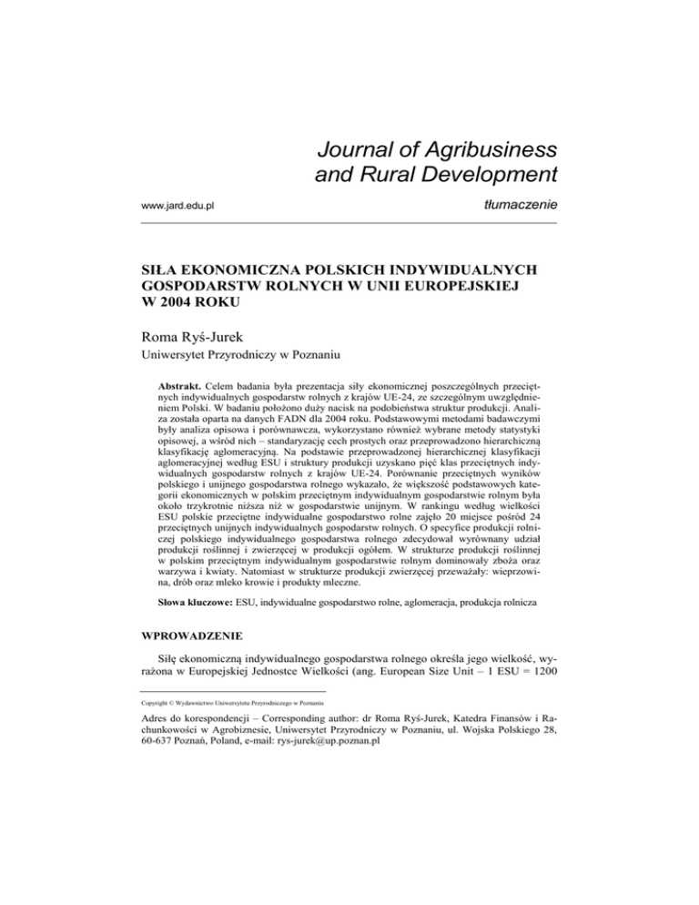 Journal of Agribusiness and Rural Development www.jard.edu.pl tłumaczenie SIŁA EKONOMICZNA POLSKICH INDYWIDUALNYCH GOSPODARSTW ROLNYCH W UNII EUROPEJSKIEJ W 2004 ROKU Roma Ryś-Jurek Uniwersytet Przyrodniczy w Poznaniu Abstrakt. Celem badania była prezentacja siły ekonomicznej poszczególnych przeciętnych indywidualnych gospodarstw rolnych z krajów UE-24, ze szczególnym uwzględnieniem Polski. W badaniu położono duży nacisk na podobieństwa struktur produkcji. Analiza została oparta na danych FADN dla 2004 roku. Podstawowymi metodami badawczymi były analiza opisowa i porównawcza, wykorzystano również wybrane metody statystyki opisowej, a wśród nich – standaryzację cech prostych oraz przeprowadzono hierarchiczną klasyfikację aglomeracyjną. Na podstawie przeprowadzonej hierarchicznej klasyfikacji aglomeracyjnej według ESU i struktury produkcji uzyskano pięć klas przeciętnych indywidualnych gospodarstw rolnych z krajów UE-24. Porównanie przeciętnych wyników polskiego i unijnego gospodarstwa rolnego wykazało, że większość podstawowych kategorii ekonomicznych w polskim przeciętnym indywidualnym gospodarstwie rolnym była około trzykrotnie niższa niż w gospodarstwie unijnym. W rankingu według wielkości ESU polskie przeciętne indywidualne gospodarstwo rolne zajęło 20 miejsce pośród 24 przeciętnych unijnych indywidualnych gospodarstw rolnych. O specyfice produkcji rolniczej polskiego indywidualnego gospodarstwa rolnego zdecydował wyrównany udział produkcji roślinnej i zwierzęcej w produkcji ogółem. W strukturze produkcji roślinnej w polskim przeciętnym indywidualnym gospodarstwie rolnym dominowały zboża oraz warzywa i kwiaty. Natomiast w strukturze produkcji zwierzęcej przeważały: wieprzowina, drób oraz mleko krowie i produkty mleczne. Słowa kluczowe: ESU, indywidualne gospodarstwo rolne, aglomeracja, produkcja rolnicza WPROWADZENIE Siłę ekonomiczną indywidualnego gospodarstwa rolnego określa jego wielkość, wyrażona w Europejskiej Jednostce Wielkości (ang. European Size Unit – 1 ESU = 1200 Copyright © Wydawnictwo Uniwersytetu Przyrodniczego w Poznaniu Adres do korespondencji – Corresponding author: dr Roma Ryś-Jurek, Katedra Finansów i Rachunkowości w Agrobiznesie, Uniwersytet Przyrodniczy w Poznaniu, ul. Wojska Polskiego 28, 60-637 Poznań, Poland, e-mail: [email protected] 2 R. Ryś-Jurek euro). Wielkość ESU jest ustalana na podstawie standardowych nadwyżek bezpośrednich gospodarstwa [Wyniki standardowe... 2006]. Według ESU, wyróżnia się sześć klas wielkości gospodarstw [Czyżewski i Henisz-Matuszczak 2004]1. Siłę polskich indywidualnych gospodarstw rolnych zmniejsza współistnienie wielu problemów, które stanowią bariery rozwoju polskiego rolnictwa. Można do nich zaliczyć m. in.: zróżnicowanie regionalne na wszystkich poziomach (w układzie makroregionów, województw, a zwłaszcza gmin), niekorzystną strukturę gospodarstw, nadmiar siły roboczej w rolnictwie, niedostatek nowoczesnego kapitału i niekorzystne warunki klimatyczne [Strategia... 2004]. Warto podkreślić, że niesprzyjające warunki klimatyczne są problemem nie tylko w Polsce, lecz także w większości krajów Unii Europejskiej (UE). To właśnie warunki pogodowe w dużej mierze determinują strukturę produkcji rolniczej, od rozmiarów której zależą dochody rolników. Celem opracowania jest prezentacja siły ekonomicznej poszczególnych przeciętnych indywidualnych gospodarstw rolnych z krajów UE-24 w 2004 roku2, ze szczególnym uwzględnieniem Polski. W badaniu położono duży nacisk na podobieństwa struktur produkcji. Starano się odpowiedzieć na następujące pytania: 1. Które miejsce pod względem wielkości ESU zajęło polskie przeciętne indywidualne gospodarstwo rolne pośród innych unijnych przeciętnych indywidualnych gospodarstw rolnych? 2. Jaka była specyfika produkcji rolniczej polskiego przeciętnego indywidualnego gospodarstwa rolnego na tle innych unijnych przeciętnych indywidualnych gospodarstw rolnych? 3. Do których przeciętnych indywidualnych gospodarstw rolnych z państw europejskich podobne było polskie przeciętne gospodarstwo, po uwzględnieniu wielkości ESU i struktury produkcji? METODYKA BADAŃ Do badań zastosowano dane, które pochodzą z sieci danych rachunkowości rolnej gospodarstw rolniczych FADN (ang. Farm Accountancy Data Network). Trzeba dodać, że w bazie tej znajdują się tylko informacje o indywidualnych gospodarstwach rolnych prowadzących rachunkowość rolną3. Badaniem objęto 24 przeciętne indywidualne gospodarstwa rolne z Unii Europejskiej w 2004 roku. Przedmiotem badań było określenie siły ekonomicznej przeciętnych indywidualnych gospodarstw rolnych z uwzględnieniem specyfiki produkcji rolniczej występującej w każdym kraju z UE-24. 1 Wśród sześciu klas wielkości wyróżnia się klasy gospodarstw: A (0-<4 ESU) – bardzo małe, B (4-<8 ESU) – małe, C (8-<16 ESU) – średnio małe, D (16-<40 ESU) – średnio duże, E (40-<100 ESU) – duże, F (≥100 ESU) – bardzo duże. 2 W bazie danych FADN nie ma informacji o Malcie. 3 Jak wynika z literatury, w Polsce przyjmuje się, że gospodarstwa prowadzące rachunkowość rolną są „lepsze” od przeciętnych w kraju o około 30%. Jednakże dane pochodzące z tej bazy są obecnie jedynymi dostępnymi i ujednoliconymi informacjami o gospodarstwach rolnych, umożliwiającymi przeprowadzenie porównań Polski z innymi krajami UE [Błąd 2000, Woś 2000]. Journal of Agribusiness and Rural Development Siła ekonomiczna polskich indywidualnych gospodarstw rolnych ... 3 Zastosowano przede wszystkim metody analizy opisowej, analizy porównawczej, podstawowe metody statystyki opisowej (w tym standaryzacja cech prostych) oraz metodę hierarchicznej klasyfikacji aglomeracyjnej. Zanim przeprowadzono hierarchiczną klasyfikację aglomeracyjną, dane dotyczące wielkości ESU i struktury produkcji każdego przeci