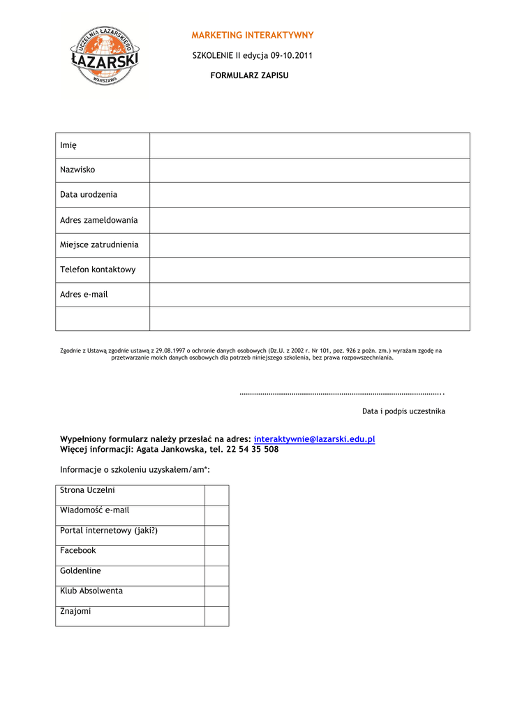 MARKETING INTERAKTYWNY SZKOLENIE II edycja 09-10.2011 FORMULARZ ZAPISU Imię Nazwisko Data urodzenia Adres zameldowania Miejsce zatrudnienia Telefon kontaktowy Adres e-mail Zgodnie z Ustawą zgodnie ustawą z 29.08.1997 o ochronie danych osobowych (Dz.U. z 2002 r. Nr 101, poz. 926 z poźn. zm.) wyrażam zgodę na przetwarzanie moich danych osobowych dla potrzeb niniejszego szkolenia, bez prawa rozpowszechniania. …………………………………………………………………………………….. Data i podpis uczestnika Wypełniony formularz należy przesłać na adres: [email protected] Więcej informacji: Agata Jankowska, tel. 22 54 35 508 Informacje o szkoleniu uzyskałem/am*: Strona Uczelni Wiadomość e-mail Portal internetowy (jaki?) Facebook Goldenline Klub Absolwenta Znajomi