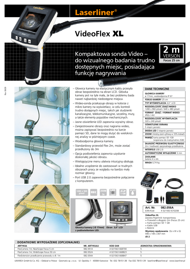VideoFlex XL Rev 0609 Kompaktowa sonda Video – do wizualnego badania trudno dostępnych miejsc, posiadająca funkcję nagrywania 2 m VERSION Focus 25 cm –G łowica kamery na elastycznym kablu przesyła obraz bezpośrednio na ekran LCD. Główka kamery jest na tyle mała, że bez problemu bada nawet najbardziej niedostępne miejsca. DANE TECHNICZNE –W ideo-sonda przekazuje obrazy w kolorze z mikro kamery na wyświetlacz, w celu kontroli trudno dostępnych miejsc, takich jak studzienki kanalizacyjne, telekomunikacyjne, szczeliny, mury, a także elementy pojazdów mechanicznych. TYP WYŚWIETLACZA 3,0" LCD GŁOWICA KAMERY ø 17mm, wodoodporna IP 67 FOKUS KAMERY 25 cm ROZDZIELCZOŚĆ ZDJĘĆ/WIDEO 1280 x 960 pikseli / 640 x 480 pikseli FORMAT ZDJĘĆ / FORMAT WIDEO jpeg / AVI ROZDZIELCZOŚĆ WYŚWITLACZA 320 x 240 pikseli – Jasne oświetlenie LED zapewnia wyraźny obraz. OŚWIETLENIE EKRANU 5 stopni jasności – Z arejestrowane obrazy oraz nagrania wideo, można zapisywać bezpośrednio na karcie pamięci SD, dane te mogą służyć do wielokrotnej analizy w późniejszym czasie. DIODA LED 3 stopnie jasności ZOOM 3-krotny zoom cyfrowy w 10% krokach PAMIĘĆ k arta pamięci SD 1GB (wspierana do maksymalnie 2GB) – Wodoodporna głowica kamery. DŁUGOŚĆ PRZEWODU ELASTYCZNEGO 2m / możliwość opcjonalnego przedłużenia – S tandardowy przewód Flex 2m, może zostać przedłużony do 3m INTERFEJS USB 2.0 AUTOMATYCZNE WYŁĄCZENIE 5 min –O pcja podświetlenia zapewnia uzyskanie doskonałej jakości obrazu. ZASILANIE baterie 4 x AA – Wielojęzyczne menu ułatwia intuicyjną obsługę. WAGA 0,74 kg – Idealne urządzenie do zastosowań w trudnych obszarach pracy ze względu na bardzo mały rozmiar głowicy. – P ort USB 2.0 zapewnia bezpośrednie połączenie z komputerem. 1280 x 960 pixel REC ZOOM 3x Głowica kamery ( Ø 17mm) z podświetleniem LED. LED LIGHT IP 67 1 GB Art. Nr. 082.056A EAN-Kod: 4 021563 670208 VideoFlex XL Zawiera Pojemnik transportowy + Przewód o długości 2m (Focus 25 cm) + Karta pamięci SD 1 GB + Kable USB + Baterie Wymiary opakowania (Sz x W x G) 440 x 144 x 307 mm JO 2 Ekran 3,0” LCD Dodatkowe wyposażenie (opcjonalnie) Artykuł FlexCamera 1m; NearScope Focus 5 cm FlexCamera 1m; WideScope Focus 50 cm Nr. Artykułu 082.051A 082.052A KOD EAN 4 021563 668700 4 021563 668823 Jednostka opakowaniowa 5 5 FlexExtension przedłużenie przewodu o dł. 1m 082.054A 4 021563 668847 5 UMAREX GmbH & Co. KG – Oddział w Polsce . Geomatix sp. z o.o. . Ul. Opolska 1 . 40084 Katowice . Tel. 032 78151-38 . Fax 032 78151-39 . [email protected] . www.laserliner.pl