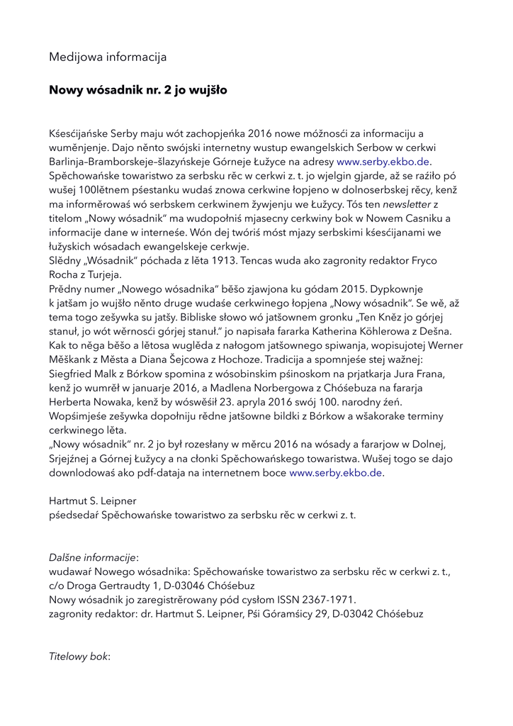 Medijowa informacija Nowy wósadnik nr. 2 jo wujšło Kśesćijańske Serby maju wót zachopjeńka 2016 nowe móžnosći za informaciju a wuměnjenje. Dajo něnto swójski internetny wustup ewangelskich Serbow w cerkwi Barlinja–Bramborskeje–šlazyńskeje Górneje Łužyce na adresy www.serby.ekbo.de. Spěchowańske towaristwo za serbsku rěc w cerkwi z. t. jo wjelgin gjarde, až se raźiło pó wušej 100lětnem pśestanku wudaś znowa cerkwine łopjeno w dolnoserbskej rěcy, kenž ma informěrowaś wó serbskem cerkwinem žywjenju we Łužycy. Tós ten newsletter z titelom „Nowy wósadnik“ ma wudopołniś mjasecny cerkwiny bok w Nowem Casniku a informacije dane w interneśe. Wón dej twóriś móst mjazy serbskimi kśesćijanami we łužyskich wósadach ewangelskeje cerkwje. Slědny „Wósadnik“ póchada z lěta 1913. Tencas wuda ako zagronity redaktor Fryco Rocha z Turjeja. Prědny numer „Nowego wósadnika“ běšo zjawjona ku gódam 2015. Dypkownje k jatšam jo wujšło něnto druge wudaśe cerkwinego łopjena „Nowy wósadnik“. Se wě, až tema togo zešywka su jatšy. Bibliske słowo wó jatšownem gronku „Ten Kněz jo górjej stanuł, jo wót wěrnosći górjej stanuł.“ jo napisała fararka Katherina Köhlerowa z Dešna. Kak to něga běšo a lětosa wuglěda z nałogom jatšownego spiwanja, wopisujotej Werner Měškank z Města a Diana Šejcowa z Hochoze. Tradicija a spomnjeśe stej wažnej: Siegfried Malk z Bórkow spomina z wósobinskim pśinoskom na prjatkarja Jura Frana, kenž jo wumrěł w januarje 2016, a Madlena Norbergowa z Chóśebuza na fararja Herberta Nowaka, kenž by wóswěśił 23. apryla 2016 swój 100. narodny źeń. Wopśimjeśe zešywka dopołniju rědne jatšowne bildki z Bórkow a wšakorake terminy cerkwinego lěta. „Nowy wósadnik“ nr. 2 jo był rozesłany w měrcu 2016 na wósady a fararjow w Dolnej, Srjejźnej a Górnej Łužycy a na cłonki Spěchowańskego towaristwa. Wušej togo se dajo downlodowaś ako pdf-dataja na internetnem boce www.serby.ekbo.de. Hartmut S. Leipner pśedsedaŕ Spěchowańske towaristwo za serbsku rěc w cerkwi z. t. Dalšne informacije: wudawaŕ Nowego wósadnika: Spěchowańske towaristwo za serbsku rěc w cerkwi z. t., c/o Droga Gertraudty 1, D-03046 Chóśebuz Nowy wósadnik jo zaregistrěrowany pód cysłom ISSN 2367-1971. zagronity redaktor: dr. Hartmut S. Leipner, Pśi Góramśicy 29, D-03042 Chóśebuz Titelowy bok: