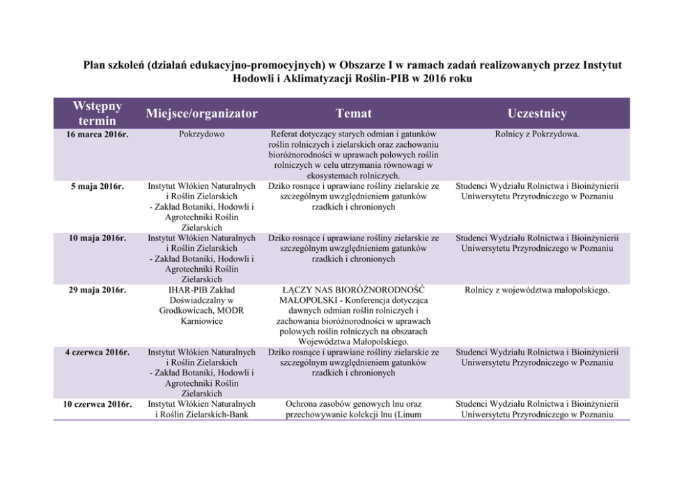 Plan szkoleń (działań edukacyjno-promocyjnych) w Obszarze I w ramach zadań realizowanych przez Instytut Hodowli i Aklimatyzacji Roślin-PIB w 2016 roku Wstępny termin Miejsce/organizator Temat Uczestnicy 16 marca 2016r. Pokrzydowo Rolnicy z Pokrzydowa. 5 maja 2016r. Instytut Włókien Naturalnych i Roślin Zielarskich - Zakład Botaniki, Hodowli i Agrotechniki Roślin Zielarskich Instytut Włókien Naturalnych i Roślin Zielarskich - Zakład Botaniki, Hodowli i Agrotechniki Roślin Zielarskich IHAR-PIB Zakład Doświadczalny w Grodkowicach, MODR Karniowice Referat dotyczący starych odmian i gatunków roślin rolniczych i zielarskich oraz zachowaniu bioróżnorodności w uprawach polowych roślin rolniczych w celu utrzymania równowagi w ekosystemach rolniczych. Dziko rosnące i uprawiane rośliny zielarskie ze szczególnym uwzględnieniem gatunków rzadkich i chronionych 10 maja 2016r. 29 maja 2016r. 4 czerwca 2016r. 10 czerwca 2016r. Instytut Włókien Naturalnych i Roślin Zielarskich - Zakład Botaniki, Hodowli i Agrotechniki Roślin Zielarskich Instytut Włókien Naturalnych i Roślin Zielarskich-Bank Studenci Wydziału Rolnictwa i Bioinżynierii Uniwersytetu Przyrodniczego w Poznaniu Dziko rosnące i uprawiane rośliny zielarskie ze szczególnym uwzględnieniem gatunków rzadkich i chronionych Studenci Wydziału Rolnictwa i Bioinżynierii Uniwersytetu Przyrodniczego w Poznaniu ŁĄCZY NAS BIORÓŻNORODNOŚĆ MAŁOPOLSKI - Konferencja dotycząca dawnych odmian roślin rolniczych i zachowania bioróżnorodności w uprawach polowych roślin rolniczych na obszarach Województwa Małopolskiego. Dziko rosnące i uprawiane rośliny zielarskie ze szczególnym uwzględnieniem gatunków rzadkich i chronionych Rolnicy z województwa małopolskiego. Ochrona zasobów genowych lnu oraz przechowywanie kolekcji lnu (Linum Studenci Wydziału Rolnictwa i Bioinżynierii Uniwersytetu Przyrodniczego w Poznaniu Studenci Wydziału Rolnictwa i Bioinżynierii Uniwersytetu Przyrodniczego w Poznaniu Genów 22-23 czerwca 2016r. 8-9 września 2016r. Wrzesień 2016r. IHAR PIB, Zakład Nasiennictwa i Ochrony Ziemniaka w Boninie IHAR PIB, Zakład Nasiennictwa i Ochrony Ziemniaka w Boninie Modliszewice. Świętokrzyski Ośrodek Doradztwa Rolniczego w Modliszewicach Październik 2016r. województwo świętokrzyskie Październik 2016r. województwo łódzkie usitatissimum L.) w Banku Genów IWNiRZ w Poznaniu Szkolenie dla specjalistów PIORiN z zakresu oceny polowej materiału nasiennego ziemniaka I część. Szkolenie dla specjalistów PIORiN z zakresu oceny polowej materiału nasiennego ziemniaka – II część. Nowości hodowlane roślin rolniczych oraz wykorzystanie zgromadzonych w „ Banku Genów” form do ich wytwarzania, metody hodowli roślin. Szkolenie dotyczące starych odmian i gatunków roślin rolniczych i zielarskich oraz zachowaniu bioróżnorodności w uprawach polowych roślin rolniczych w celu utrzymania równowagi w ekosystemach rolniczych.. Szkolenie organizowane wspólnie z Instytutem Ogrodnictwa w Skierniewicach przy współpracy z lokalnym ODR. Szkolenie dotyczące starych odmian i gatunków roślin rolniczych i zielarskich oraz zachowaniu bioróżnorodności w uprawach polowych roślin rolniczych w celu utrzymania równowagi w ekosystemach rolniczych. Szkolenie organizowane we współpracy z lokalnym ODR. Pracownicy z całego kraju. Pracownicy z całego kraju. Doradcy produkcji roślinnej ŚODR. Szkolenie dla rolników z województwa świętokrzyskiego. Szkolenie dla rolników z województwa łódzkiego.