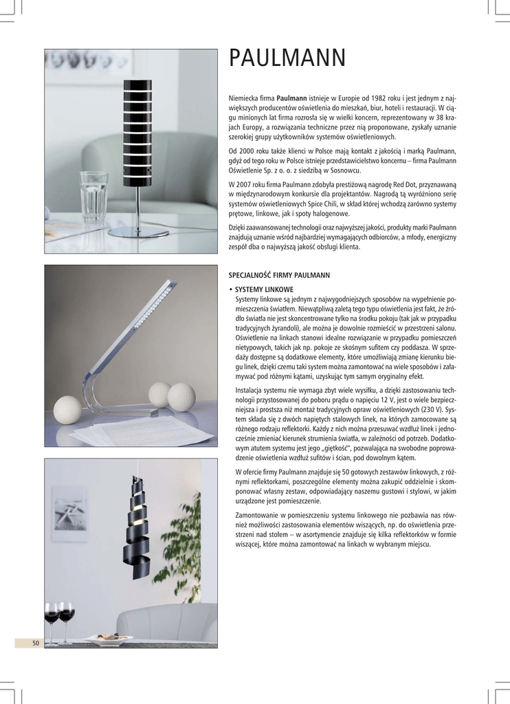 PAULMANN Niemiecka firma Paulmann istnieje w Europie od 1982 roku i jest jednym z największych producentów oświetlenia do mieszkań, biur, hoteli i restauracji. W ciągu minionych lat firma rozrosła się w wielki koncern, reprezentowany w 38 krajach Europy, a rozwiązania techniczne przez nią proponowane, zyskały uznanie szerokiej grupy użytkowników systemów oświetleniowych. Od 2000 roku także klienci w Polsce mają kontakt z jakością i marką Paulmann, gdyż od tego roku w Polsce istnieje przedstawicielstwo koncernu – firma Paulmann Oświetlenie Sp. z o. o. z siedzibą w Sosnowcu. W 2007 roku firma Paulmann zdobyła prestiżową nagrodę Red Dot, przyznawaną w międzynarodowym konkursie dla projektantów. Nagrodą tą wyróżniono serię systemów oświetleniowych Spice Chili, w skład której wchodzą zarówno systemy prętowe, linkowe, jak i spoty halogenowe. Dzięki zaawansowanej technologii oraz najwyższej jakości, produkty marki Paulmann znajdują uznanie wśród najbardziej wymagających odbiorców, a młody, energiczny zespół dba o najwyższą jakość obsługi klienta. SPECJALNOŚĆ FIRMY PAULMANN • SYSTEMY LINKOWE Systemy linkowe są jednym z najwygodniejszych sposobów na wypełnienie pomieszczenia światłem. Niewątpliwą zaletą tego typu oświetlenia jest fakt, że źródło światła nie jest skoncentrowane tylko na środku pokoju (tak jak w przypadku tradycyjnych żyrandoli), ale można je dowolnie rozmieścić w przestrzeni salonu. Oświetlenie na linkach stanowi idealne rozwiązanie w przypadku pomieszczeń nietypowych, takich jak np. pokoje ze skośnym sufitem czy poddasza. W sprzedaży dostępne są dodatkowe elementy, które umożliwiają zmianę kierunku biegu linek, dzięki czemu taki system można zamontować na wiele sposobów i załamywać pod różnymi kątami, uzyskując tym samym oryginalny efekt. Instalacja systemu nie wymaga zbyt wiele wysiłku, a dzięki zastosowaniu technologii przystosowanej do poboru prądu o napięciu 12 V, jest o wiele bezpieczniejsza i prostsza niż montaż tradycyjnych opraw oświetleniowych (230 V). System składa się z dwóch napiętych stalowych linek, na których zamocowane są różnego rodzaju reflektorki. Każdy z nich można przesuwać wzdłuż linek i jednocześnie zmieniać kierunek strumienia światła, w zależności od potrzeb. Dodatkowym atutem systemu jest jego „giętkość”, pozwalająca na swobodne poprowadzenie oświetlenia wzdłuż sufitów i ścian, pod dowolnym kątem. W ofercie firmy Paulmann znajduje się 50 gotowych zestawów linkowych, z różnymi reflektorkami, poszczególne elementy można zakupić oddzielnie i skomponować własny zestaw, odpowiadający naszemu gustowi i stylowi, w jakim urządzone jest pomieszczenie. Zamontowanie w pomieszczeniu systemu linkowego nie pozbawia nas również możliwości zastosowania elementów wiszących, np. do oświetlenia przestrzeni nad stołem – w asortymencie znajduje się kilka reflektorków w formie wiszącej, które można zamontować na linkach w wybranym miejscu. 50 • SYSTEMY SZYNOWE I PRĘTOWE Phantom oraz U-Rail to równie praktyczne systemy oświetlenia przystosowane do poboru prądu o napięciu 230 V, jednak z wykorzystaniem szyn. Dzięki nim niemal każde indywidualne rozwiązanie staje się możliwe do zrealizowania. System bazowy, łatwy i szybki w montażu, może być dowolnie rozszerzany. Można efektywnie, a zarazem efektownie oświetlić pokoje nawet o dużej powierzchni, wykorzystując do tego tylko jedno źródło prądu. Ponadto do systemu bazowego dołączyć można dowolną ilość lampek (maks. 1000 W), a źródło prądu może zostać umieszczone w każdym miejscu. Phantom i U-Rail oferują różne rodzaje oświetlenia, odpowiadające najróżniejszym wymaganiom. Dzięki dużej ilości oferowanych opcjonalnie halogenów punktowych można uzyskać zarówno światło ukierunkowane na poszczególne przedmioty, jak i nie rażące światło ogólne, czy też światło rozproszone, do rozjaśniania pomieszczeń. Największym plusem tych systemów jest fakt, że poszczególne lampki można montować w dowolnym punkcie systemu i indywidualnie regulować rozprowadzenie światła, a w razie potrzeby dowolnie je zmieniać, bez konieczności dodatkowej instalacji. Podobne zalety mają systemy prętowe przystosowane do poboru prądu o napięciu 12 V. Różnią się one tym, że w komplecie znajduje się transformator o określonej mocy, który zamienia napięcie 230 V na 12 V – jest on jednak schowany w eleganckiej obudowie, która idealnie komponuje się z całym zestawem. POZOSTAŁA OFERTA FIRMY • lampy wiszące • lampy podłogowe • kinkiety i plafony • lampki biurkowe i nocne • cała gama źródeł światła: – tradycyjne – dekoracyjne – specjalistyczne. PAULMANN OŚWIETLENIE Sp. z o.o. ul. Mierosławskiego 3 41-200 Sosnowiec tel. 032 785-36-63 fax 032 290-64-96 [email protected] www.paulmann.pl 51