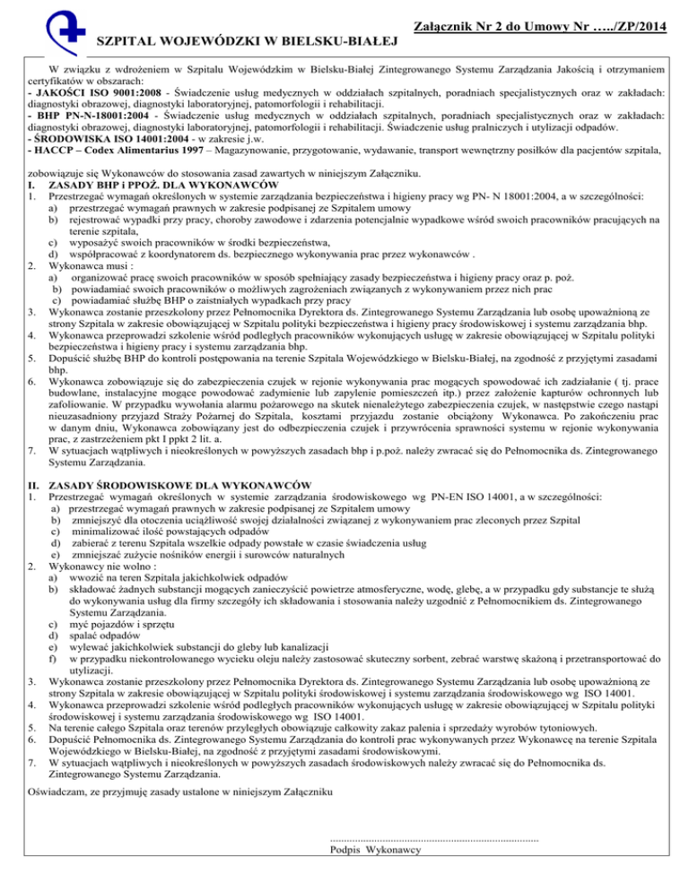 Załącznik Nr 2 do Umowy Nr …../ZP/2014 SZPITAL WOJEWÓDZKI W BIELSKU-BIAŁEJ W związku z wdroŜeniem w Szpitalu Wojewódzkim w Bielsku-Białej Zintegrowanego Systemu Zarządzania Jakością i otrzymaniem certyfikatów w obszarach: - JAKOŚCI ISO 9001:2008 - Świadczenie usług medycznych w oddziałach szpitalnych, poradniach specjalistycznych oraz w zakładach: diagnostyki obrazowej, diagnostyki laboratoryjnej, patomorfologii i rehabilitacji. - BHP PN-N-18001:2004 - Świadczenie usług medycznych w oddziałach szpitalnych, poradniach specjalistycznych oraz w zakładach: diagnostyki obrazowej, diagnostyki laboratoryjnej, patomorfologii i rehabilitacji. Świadczenie usług pralniczych i utylizacji odpadów. - ŚRODOWISKA ISO 14001:2004 - w zakresie j.w. - HACCP – Codex Alimentarius 1997 – Magazynowanie, przygotowanie, wydawanie, transport wewnętrzny posiłków dla pacjentów szpitala, zobowiązuje się Wykonawców do stosowania zasad zawartych w niniejszym Załączniku. I. ZASADY BHP i PPOś. DLA WYKONAWCÓW 1. Przestrzegać wymagań określonych w systemie zarządzania bezpieczeństwa i higieny pracy wg PN- N 18001:2004, a w szczególności: a) przestrzegać wymagań prawnych w zakresie podpisanej ze Szpitalem umowy b) rejestrować wypadki przy pracy, choroby zawodowe i zdarzenia potencjalnie wypadkowe wśród swoich pracowników pracujących na terenie szpitala, c) wyposaŜyć swoich pracowników w środki bezpieczeństwa, d) współpracować z koordynatorem ds. bezpiecznego wykonywania prac przez wykonawców . 2. Wykonawca musi : a) organizować pracę swoich pracowników w sposób spełniający zasady bezpieczeństwa i higieny pracy oraz p. poŜ. b) powiadamiać swoich pracowników o moŜliwych zagroŜeniach związanych z wykonywaniem przez nich prac c) powiadamiać słuŜbę BHP o zaistniałych wypadkach przy pracy 3. Wykonawca zostanie przeszkolony przez Pełnomocnika Dyrektora ds. Zintegrowanego Systemu Zarządzania lub osobę upowaŜnioną ze strony Szpitala w zakresie obowiązującej w Szpitalu polityki bezpieczeństwa i higieny pracy środowiskowej i systemu zarządzania bhp. 4. Wykonawca przeprowadzi szkolenie wśród podległych pracowników wykonujących usługę w zakresie obowiązującej w Szpitalu polityki bezpieczeństwa i higieny pracy i systemu zarządzania bhp. 5. Dopuścić słuŜbę BHP do kontroli postępowania na terenie Szpitala Wojewódzkiego w Bielsku-Białej, na zgodność z przyjętymi zasadami bhp. 6. Wykonawca zobowiązuje się do zabezpieczenia czujek w rejonie wykonywania prac mogących spowodować ich zadziałanie ( tj. prace budowlane, instalacyjne mogące powodować zadymienie lub zapylenie pomieszczeń itp.) przez załoŜenie kapturów ochronnych lub zafoliowanie. W przypadku wywołania alarmu poŜarowego na skutek nienaleŜytego zabezpieczenia czujek, w następstwie czego nastąpi nieuzasadniony przyjazd StraŜy PoŜarnej do Szpitala, kosztami przyjazdu zostanie obciąŜony Wykonawca. Po zakończeniu prac w danym dniu, Wykonawca zobowiązany jest do odbezpieczenia czujek i przywrócenia sprawności systemu w rejonie wykonywania prac, z zastrzeŜeniem pkt I ppkt 2 lit. a. 7. W sytuacjach wątpliwych i nieokreślonych w powyŜszych zasadach bhp i p.poŜ. naleŜy zwracać się do Pełnomocnika ds. Zintegrowanego Systemu Zarządzania. II. ZASADY ŚRODOWISKOWE DLA WYKONAWCÓW 1. Przestrzegać wymagań określonych w systemie zarządzania środowiskowego wg PN-EN ISO 14001, a w szczególności: a) przestrzegać wymagań prawnych w zakresie podpisanej ze Szpitalem umowy b) zmniejszyć dla otoczenia uciąŜliwość swojej działalności związanej z wykonywaniem prac zleconych przez Szpital c) minimalizować ilość powstających odpadów d) zabierać z terenu Szpitala wszelkie odpady powstałe w czasie świadczenia usług e) zmniejszać zuŜycie nośników energii i surowców naturalnych 2. Wykonawcy nie wolno : a) wwozić na teren Szpitala jakichkolwiek odpadów b) składować Ŝadnych substancji mogących zanieczyścić powietrze atmosferyczne, wodę, glebę, a w przypadku gdy substancje te słuŜą do wykonywania usług dla firmy szczegóły ich składowania i stosowania naleŜy uzgodnić z Pełnomocnikiem ds. Zintegrowanego Systemu Zarządzania. c) myć pojazdów i sprzętu d) spalać odpadów e) wylewać jakichkolwiek substancji do gleby lub kanalizacji f) w przypadku niekontrolowanego wycieku oleju naleŜy zastosować skuteczny sorbent, zebrać warstwę skaŜoną i przetransportować do utylizacji. 3. Wykonawca zostanie przeszkolony przez Pełnomocnika Dyrektora ds. Zintegrowanego Systemu Zarządzania lub osobę upowaŜnioną ze strony Szpitala w zakresie obowiązującej w Szpitalu polityki środowiskowej i systemu zarządzania środowiskowego wg ISO 14001. 4. Wykonawca przeprowadzi szkolenie wśród podległych pracowników wykonujących usługę w zakresie obowiązującej w Szpitalu polityki środowiskowej i systemu zarządzania środowiskowego wg ISO 14001. 5. Na terenie całego Szpitala oraz terenów przyległych obowiązuje całkowity zakaz palenia i sprzedaŜy wyrobów tytoniowych. 6. Dopuścić Pełnomocnika ds. Zintegrowanego Systemu Zarządzania do kontroli prac wykonywanych przez Wykonawcę na terenie Szpitala Wojewódzkiego w Bielsku-Białej, na zgodność z przyjętymi zasadami środowiskowymi. 7. W sytuacjach wątpliwych i nieokreślonych w powyŜszych zasadach środowiskowych naleŜy zwracać się do Pełnomocnika ds. Zintegrowanego Systemu Zarządzania. Oświadczam, ze przyjmuję zasady ustalone w niniejszym Załączniku ............................................................................ Podpis Wykonawcy