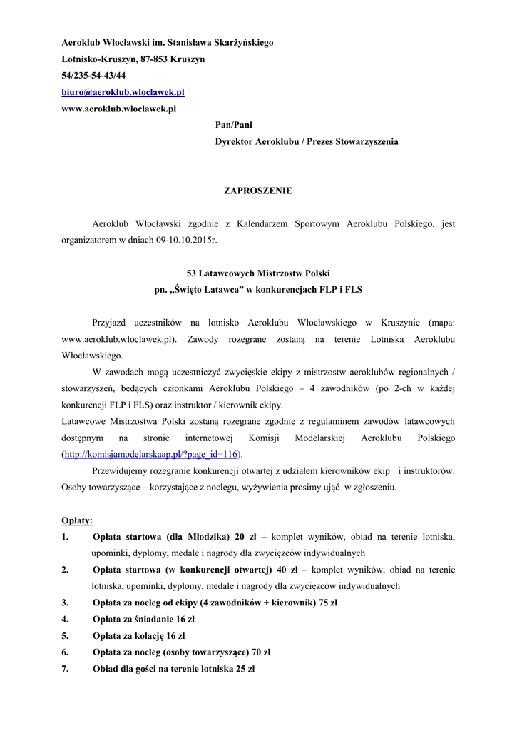 Aeroklub Włocławski im. Stanisława Skarżyńskiego Lotnisko-Kruszyn, 87-853 Kruszyn 54/235-54-43/44 [email protected] www.aeroklub.wloclawek.pl Pan/Pani Dyrektor Aeroklubu / Prezes Stowarzyszenia ZAPROSZENIE Aeroklub Włocławski zgodnie z Kalendarzem Sportowym Aeroklubu Polskiego, jest organizatorem w dniach 09-10.10.2015r. 53 Latawcowych Mistrzostw Polski pn. „Święto Latawca” w konkurencjach FLP i FLS Przyjazd uczestników na lotnisko Aeroklubu Włocławskiego w Kruszynie (mapa: www.aeroklub.wloclawek.pl). Zawody rozegrane zostaną na terenie Lotniska Aeroklubu Włocławskiego. W zawodach mogą uczestniczyć zwycięskie ekipy z mistrzostw aeroklubów regionalnych / stowarzyszeń, będących członkami Aeroklubu Polskiego – 4 zawodników (po 2-ch w każdej konkurencji FLP i FLS) oraz instruktor / kierownik ekipy. Latawcowe Mistrzostwa Polski zostaną rozegrane zgodnie z regulaminem zawodów latawcowych dostępnym na stronie internetowej Komisji Modelarskiej Aeroklubu Polskiego (http://komisjamodelarskaap.pl/?page_id=116). Przewidujemy rozegranie konkurencji otwartej z udziałem kierowników ekip i instruktorów. Osoby towarzyszące – korzystające z noclegu, wyżywienia prosimy ująć w zgłoszeniu. Opłaty: 1. Opłata startowa (dla Młodzika) 20 zł – komplet wyników, obiad na terenie lotniska, upominki, dyplomy, medale i nagrody dla zwycięzców indywidualnych 2. Opłata startowa (w konkurencji otwartej) 40 zł – komplet wyników, obiad na terenie lotniska, upominki, dyplomy, medale i nagrody dla zwycięzców indywidualnych 3. Opłata za nocleg od ekipy (4 zawodników + kierownik) 75 zł 4. Opłata za śniadanie 16 zł 5. Opłata za kolację 16 zł 6. Opłata za nocleg (osoby towarzyszące) 70 zł 7. Obiad dla gości na terenie lotniska 25 zł Ponadto istnieje możliwość korzystania z pola namiotowego na terenie lotniska. Informujemy, że Latawcowe Mistrzostwa Polski organizowane w roku bieżącym nie posiadają dofinansowania przez Ministerstwo Sportu i Turystyki. Program Latawcowych Mistrzostw Polski p. n „ŚWIĘTO LATAWCA „ Termin: 09-10.10.2015r. Konkurencje: FLP – latawce płaskie FLS – latawce skrzynkowe Uczestnicy: Młodzicy ( dzieci do 14 lat ; rok urodzenia 2001 i wyższy ) - wymagane posiadanie legitymacji szkolnej lub innego dokumentu - zwycięskie ekipy /z eliminacjami/ Mistrzostw Aeroklubów Regionalnych / Stowarzyszeń Modelarskich, 4 zawodników po 2 w każdej konkurencji - Konkurs Otwarty- Instruktorzy , kierownicy ekip (dopuszczone są osoby niestowarzyszone) Miejsce rozgrywania zawodów: Teren lotniska Aeroklubu Włocławskiego Adres: Aeroklub Włocławski Lotnisko – Kruszyn 87 -853 Kruszyn tel./ fax. (54) 235 54 43 mail : [email protected] Osoby odpowiedzialne: Grzegorz Sieradzki tel./ fax. Jak powyżej tel. kom. 695-203-271 Ilona Skórzewska tel./ fax. Jak powyżej tel. kom. 667-673-480 Termin nadsyłania zgłoszeń: Nieprzekraczalny do dnia 18.09.2015r. Opłaty: Jak w piśmie przewodnim Program zawodów: Dzień: 09.10.2015 do godz.18:00 Przyjazd zawodników, rejestracja i zakwaterowanie. Dzień: 10.10.2015 7.00 – 8.00 Rejestracja zawodników 8.00 – 10.00 Ocena statystyczna 10.00 – 10.15 Uroczyste otwarcie zawodów 10.15 – 13.30 Loty zawodnicze 13.30 – 15.00 Obiad 15.00 – 15.30 Zakończenie zawodów, wręczenie nagród i dyplomów