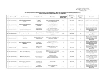 Załącznik do uchwały Nr 521/141/12 Zarządu Województwa Mazowieckiego z dnia 12 marca 2012 r. Lista rankingowa wniosków o dofinansowanie ocenionych w konkursie zamkniętym nr 1/IN/6.1.1/2011 na posiedzeniu KOP powołanej Zarządzeniem Nr 67/11 Dyrektora Wojewódzkiego Urzędu Pracy w Warszawie z dnia 5 grudnia 2011 r. Lp. Nr wniosku w KSI Nazwa Wnioskodawcy Siedziba Wnioskodawcy Tytuł projektu Liczba przyznanych punktów ogółem Wnioskowane dofinansowanie w PLN Proponowane dofinansowanie w PLN Status wniosku 1 POKL.06.01.01-14-011/11 Zakład Doskonalenia Zawodowego w Płocku ul. Ułańska 1, 09-402 Płock Zielony potencjał subregionu płockiego szansą rozwoju rynku pracy 62,5 2 737 900,00 2 055 100,00 Pozytywnie oceniony - do negocjacji 2 POKL.06.01.01-14-019/11 Zakład Doskonalenia Zawodowego w Kielcach ul. Paderewskiego 55, 25-950 Kielce PI-PWP - Model Regionalnego Centrum Kompetencji Technologicznych Green-Job 62 1 906 346,00 1 430 066,00 Pozytywnie oceniony - do negocjacji 3 POKL.06.01.01-14-012/11 FUNDACJA DRABINA ROZWOJU ul. Dobra 5 lok. 2, 00-384 Warszawa Nowy zawód: bajkoterapeuta rozwiązanie dla kobiet chcących wrócić do pracy po urodzeniu dziecka 51 2 037 018,00 0 Odrzucony z powodu nieuzyskania minimum punktowego w zakresie kryteriów w części B Karty Oceny Merytorycznej 4 POKL.06.01.01-14-017/11 Fundacja Pomocy Matematykom i Informatykom Niesprawnym Ruchowo ul. Twarda 51 lok. 55, 00-818 Warszawa Akademia Telezawodów - innowacyjny Model kształcenia osób niepełnosprawnych w zawodach przyszłości 49,5 3 078 603,00 0 Odrzucony z powodu nieuzyskania minimum punktowego w zakresie kryteriów w części B Karty Oceny Merytorycznej 5 POKL.06.01.01-14-010/11 INVESTIN Aleje Jerozolimskie 51 lok.5, 00-697 Warszawa PI: Interaktywne symulacje dla promocji i nauki nowych zawodów 46,5 1 762 380,00 0 Odrzucony z powodu nieuzyskania minimum punktowego w zakresie kryteriów w części B Karty Oceny Merytorycznej 6 POKL.06.01.01-14-002/11 Beauty, Massage &SPA Agnieszka Zapała-BMAS ul. Szkolna 16, 05-500 Piaseczno PI: MIKROPIGMENTACJA MEDYCZNA - nowy zawód na rynku pracy 46 771 076,00 0 Odrzucony z powodu nieuzyskania minimum punktowego w zakresie kryteriów w części B Karty Oceny Merytorycznej 7 POKL.06.01.01-14-021/11 Powiat Pułtuski ul. Białowiejska 5, 06-100 Pułtusk PI-PWP Zielone miejsca pracy w Powiecie Pułtuskim 46 1 224 250,00 0 Odrzucony z powodu nieuzyskania minimum punktowego w zakresie kryteriów w części B Karty Oceny Merytorycznej 8 POKL.06.01.01-14-015/11 Miasto Stołeczne Warszawa Plac Bankowy 3/5, 00-950 Warszawa CRAFT - w poszukiwaniu instrumentów wspierających rozwój zainteresowania zanikającymi zawodami 43,5 1 543 950,00 0 Odrzucony z powodu nieuzyskania minimum punktowego w zakresie kryteriów w części B Karty Oceny Merytorycznej 9 POKL.06.01.01-14-022/11 JPB Doradztwo Personalne S.C. ul. Smolna 13 lok.505, 00-375 Warszawa Legitymizacja zawodu opiekuna/opiekunki dziecięcej sposobem na legalne zatrudnienie. 43,5 1 419 549,40 0 Odrzucony z powodu nieuzyskania minimum punktowego w zakresie kryteriów w części B Karty Oceny Merytorycznej 10 POKL.06.01.01-14-008/11 SLG International Training Center Sp. z o.o. ul. Żurawia 47/49, 00-680 Warszawa Perspektywy Plus 40 1 999 916,62 0 Odrzucony z powodu nieuzyskania minimum punktowego w zakresie kryteriów w części B Karty Oceny Merytorycznej 11 POKL.06.01.01-14-016/11 MDG Doradztwo Gospodarcze Sp. z o.o. ul. Irysów 15, 05-077 Warszawa "Audytor - nowy zawód nowe możliwości" 37,5 1 295 076,00 0 Odrzucony z powodu nieuzyskania minimum punktowego w zakresie kryteriów w części B Karty Oceny Merytorycznej 12 POKL.06.01.01-14-018/11 Fundacja Na Rzecz Rozwoju Wsi "Polska Wieś 2000" im. Macieja Rataja Al.W. Reymonta 12 a, 01-842 Warszawa PI-PWP Wyjątkowy zawód - wyjątkowa droga rozwoju 37 709 890,88 0 Odrzucony z powodu nieuzyskania minimum punktowego w zakresie kryteriów w części B Karty Oceny Merytorycznej 13 POKL.06.01.01-14-005/11 Europejski Dom Spotkań - Fundacja Nowy Staw ul. M. Skłodowskiej-Curie 3, 20-029 Lublin PI Eko - Doradca 36,5 1 438 636,30 0 Odrzucony z powodu nieuzyskania minimum punktowego w zakresie kryteriów w części B Karty Oceny Merytorycznej 14 POKL.06.01.01-14-003/11 Europejski Dom Spotkań - Fundacja Nowy Staw ul. M. Skłodowskiej-Curie 3, 20-029 Lublin PI Eko - Biznes 36 1 438 636,30 0 Odrzucony z powodu nieuzyskania minimum punktowego w zakresie kryteriów w części B Karty Oceny Merytorycznej 15 POKL.06.01.01-14-013/11 Polski Związek Jeździecki ul. Lektykarska 29, 01-687 Warszawa Konie dają elastyczną pracę 32,5 1 208 330,00 0 Odrzucony z powodu nieuzyskania minimum punktowego w zakresie kryteriów w części B Karty Oceny Merytorycznej 16 POKL.06.01.01-14-014/11 Polski Komitet Pomocy Społecznej Rada Naczelna ul. Wiejska 18 lok. 19, 00-490 Warszawa FACHOWIEC POD RĘKĄ 31,5 1 948 472,00 0 Odrzucony z powodu nieuzyskania minimum punktowego w zakresie kryteriów w części B Karty Oceny Merytorycznej 17 POKL.06.01.01-14-023/11 VERNUM Wojciech Owczarzak ul. Łoskoń Stary 1E, 62-095 Murowana Goślina PI-PWP Naturalne tynkowanie i wzornictwo - Natural Plastering and Finishing 28,5 996 036,37 0 Odrzucony z powodu nieuzyskania minimum punktowego w zakresie kryteriów w części B Karty Oceny Merytorycznej 27,5 1 599 900,00 0 Odrzucony z powodu nieuzyskania minimum punktowego w zakresie kryteriów w części B Karty Oceny Merytorycznej 18 POKL.06.01.01-14-020/11 AKADEMIA SZYBKIEJ NAUKI TADEUSZ BUZAREWICZ ul. Kormoranów 10, 11-600 Radzieje, Węgorzewo Tworzenie instrumentów wspierających rozwój zainteresowania nowymi zawodami, zawodami niszowymi oraz cieszącymi się małą popularnością pod kątem osób niepełnosprawnych z województwa mazowieckiego. 19 POKL.06.01.01-14-004/11 Regionalne Centrum Integracji Europejskiej ul. Toruńska 148, 87-800 Włocławek PI-PWP Od kapitału społecznego do kapitału kreatywnego 27,5 1 577 768,56 0 Odrzucony z powod