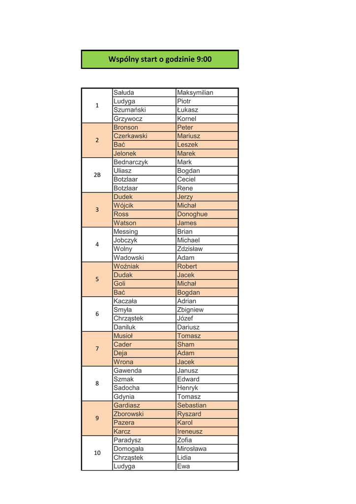 Wspólny start o godzinie 9:00 1 2 2B 3 4 5 6 7 8 9 10 Sałuda Ludyga Szumański Grzywocz Bronson Czerkawski Bać Jelonek Bednarczyk Uliasz Botzlaar Botzlaar Dudek Wójcik Ross Watson Messing Jobczyk Wolny Wadowski Woźniak Dudak Goli Bać Kaczała Smyła Chrząstek Daniluk Musioł Cader Deja Wrona Gawenda Szmak Sadocha Gdynia Gardiasz Zborowski Pazera Karcz Paradysz Domogała Chrząstek Ludyga Maksymilian Piotr Łukasz Kornel Peter Mariusz Leszek Marek Mark Bogdan Ceciel Rene Jerzy Michał Donoghue James Brian Michael Zdzisław Adam Robert Jacek Michał Bogdan Adrian Zbigniew Józef Dariusz Tomasz Sham Adam Jacek Janusz Edward Henryk Tomasz Sebastian Ryszard Karol Ireneusz Zofia Mirosława Lidia Ewa 10B 11 12 13 13B 14 15 16 17 18 18B Ślązak Królikowska Szmit-Szumańska Kasperowicz Dzida Tobiasz Kantor Pawłowski Gazecki Żmuda Michałowski Kucharski Królikowski Iwan Górko Ligocki Kotlarek Grochowski Hudak Sobków Stefanik Stefański Nowak Horodyński Michałek Pawłowski Dziubałtowski Gajda Szczepański Daniluk Paradysz Domogała Szumański Fiszer Ślązak Górski Tomczykiewicz Wesołowski Niesyto Brzeziński Majchrowicz Traczyk Szymik Stencel Alicja Aleksandra Iwona Krzysztof Jozef Robert Marek Łukasz Jacek Michał Michał Sławomir Marek Tomasz Adam Mateusz Sławomir Marcin Karol Marek Marian Sylwester Mirek Remigiusz Mariusz Mariusz Piotr Andreas Adam Leszek Andrzej Michał Mariusz Bogusław Krystian Maciej Tomasz Tadeusz Tomasz Waldemar Marcin Tomasz Krzysztof Jacek