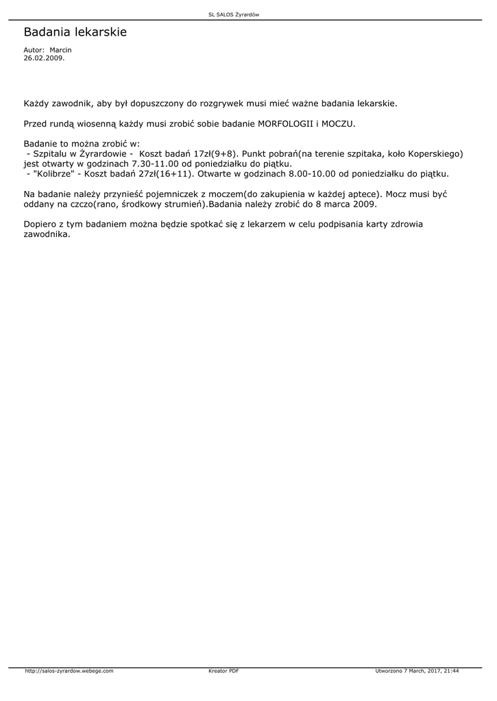 SL SALOS Żyrardów Badania lekarskie Autor: Marcin 26.02.2009. Każdy zawodnik, aby był dopuszczony do rozgrywek musi mieć ważne badania lekarskie. Przed rundą wiosenną każdy musi zrobić sobie badanie MORFOLOGII i MOCZU. Badanie to można zrobić w: - Szpitalu w Żyrardowie - Koszt badań 17zł(9+8). Punkt pobrań(na terenie szpitaka, koło Koperskiego) jest otwarty w godzinach 7.30-11.00 od poniedziałku do piątku. - "Kolibrze" - Koszt badań 27zł(16+11). Otwarte w godzinach 8.00-10.00 od poniedziałku do piątku. Na badanie należy przynieść pojemniczek z moczem(do zakupienia w każdej aptece). Mocz musi być oddany na czczo(rano, środkowy strumień).Badania należy zrobić do 8 marca 2009. Dopiero z tym badaniem można będzie spotkać się z lekarzem w celu podpisania karty zdrowia zawodnika. http://salos-zyrardow.webege.com Kreator PDF Utworzono 7 March, 2017, 21:44