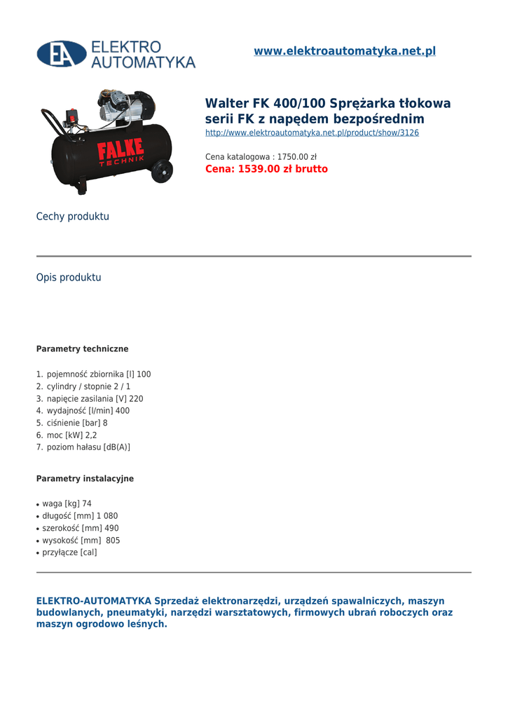www.elektroautomatyka.net.pl Walter FK 400/100 Sprężarka tłokowa serii FK z napędem bezpośrednim http://www.elektroautomatyka.net.pl/product/show/3126 Cena katalogowa : 1750.00 zł Cena: 1539.00 zł brutto Cechy produktu Opis produktu Parametry techniczne 1. 2. 3. 4. 5. 6. 7. pojemność zbiornika [l] 100 cylindry / stopnie 2 / 1 napięcie zasilania [V] 220 wydajność [l/min] 400 ciśnienie [bar] 8 moc [kW] 2,2 poziom hałasu [dB(A)] Parametry instalacyjne ● ● ● ● ● waga [kg] 74 długość [mm] 1 080 szerokość [mm] 490 wysokość [mm] 805 przyłącze [cal] ELEKTRO-AUTOMATYKA Sprzedaż elektronarzędzi, urządzeń spawalniczych, maszyn budowlanych, pneumatyki, narzędzi warsztatowych, firmowych ubrań roboczych oraz maszyn ogrodowo leśnych. Sklep Bochnia ul. Brzeska 50 32-700 Bochnia Sklep Brzesko ul. Szarych Szeregów 23 32-800 Brzesko Serwis, Magazyn ul. Św. Brata Alberta 4 32-800 Brzesko tel. 691 572 333 e-mail: [email protected] tel. 609 523 230 e-mail: [email protected] tel. 609 523 645 e-mail: [email protected]