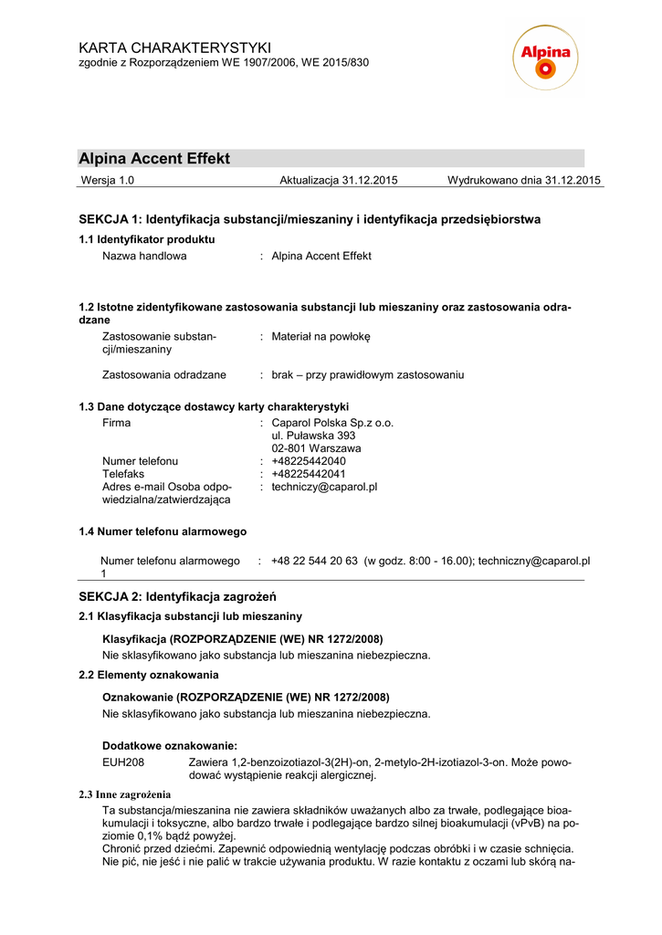 KARTA CHARAKTERYSTYKI zgodnie z Rozporządzeniem WE 1907/2006, WE 2015/830 Alpina Accent Effekt Wersja 1.0 Aktualizacja 31.12.2015 Wydrukowano dnia 31.12.2015 SEKCJA 1: Identyfikacja substancji/mieszaniny i identyfikacja przedsiębiorstwa 1.1 Identyfikator produktu Nazwa handlowa : Alpina Accent Effekt 1.2 Istotne zidentyfikowane zastosowania substancji lub mieszaniny oraz zastosowania odradzane Zastosowanie substan: Materiał na powłokę cji/mieszaniny Zastosowania odradzane : brak – przy prawidłowym zastosowaniu 1.3 Dane dotyczące dostawcy karty charakterystyki Firma : Caparol Polska Sp.z o.o. ul. Puławska 393 02-801 Warszawa Numer telefonu : +48225442040 Telefaks : +48225442041 Adres e-mail Osoba odpo: [email protected] wiedzialna/zatwierdzająca 1.4 Numer telefonu alarmowego Numer telefonu alarmowego 1 : +48 22 544 20 63 (w godz. 8:00 - 16.00); [email protected] SEKCJA 2: Identyfikacja zagrożeń 2.1 Klasyfikacja substancji lub mieszaniny Klasyfikacja (ROZPORZĄDZENIE (WE) NR 1272/2008) Nie sklasyfikowano jako substancja lub mieszanina niebezpieczna. 2.2 Elementy oznakowania Oznakowanie (ROZPORZĄDZENIE (WE) NR 1272/2008) Nie sklasyfikowano jako substancja lub mieszanina niebezpieczna. Dodatkowe oznakowanie: EUH208 Zawiera 1,2-benzoizotiazol-3(2H)-on, 2-metylo-2H-izotiazol-3-on. Może powodować wystąpienie reakcji alergicznej. 2.3 Inne zagrożenia Ta substancja/mieszanina nie zawiera składników uważanych albo za trwałe, podlegające bioakumulacji i toksyczne, albo bardzo trwałe i podlegające bardzo silnej bioakumulacji (vPvB) na poziomie 0,1% bądź powyżej. Chronić przed dziećmi. Zapewnić odpowiednią wentylację podczas obróbki i w czasie schnięcia. Nie pić, nie jeść i nie palić w trakcie używania produktu. W razie kontaktu z oczami lub skórą na- KARTA CHARAKTERYSTYKI zgodnie z Rozporządzeniem WE 1907/2006, WE 2015/830 Alpina Accent Effekt Wersja 1.0 Aktualizacja 31.12.2015 Wydrukowano dnia 31.12.2015 tychmiast obficie przemyć je wodą. Zabezpieczyć przed przedostaniem się do kanalizacji, wód powierzchniowych i gruntowych oraz gleby. Czyszczenie narzędzi wodą i mydłem natychmiast po użyciu. Nie wdychać pary/rozpylonej cieczy. SEKCJA 3: Skład/informacja o składnikach 3.2 Mieszaniny Składniki niebezpieczne Uwagi : Brak składników niebezpiecznych SEKCJA 4: Środki pierwszej pomocy 4.1 Opis środków pierwszej pomocy Porady ogólne : Brak zagrożeń wymagających specjalistycznej pierwszej pomocy. Usunąć z zagrożonej strefy. Udzielający pierwszej pomocy powinien zapewnić sobie pomoc. W przypadku wdychania : Wyprowadzić poszkodowanego na świeże powietrze. W przypadku kontaktu ze skórą : Zmyć starannie skórę wodą z mydłem lub zastosować znane środki zmywające. NIE stosować rozpuszczalników lub rozcieñczalników. W przypadku kontaktu z oczami : Usunąć szkła (szkło) kontaktowe. Przepłukiwać otwarte oczy obficie czystą, świeżą wodą przynajmniej przez 10 minut. Zasięgnąć porady medycznej. W przypadku połknięcia : Przy połknięciu NIE wywoływać wymiotów. Przemyć usta wodą i następnie wypić dużą ilość wody. Nieprzytomnej osobie nigdy nie podawać nic doustnie. Jeśli objawy utrzymują się, wezwać lekarza. 4.2 Najważniejsze ostre i opóźnione objawy oraz skutki narażenia Objawy : Brak dostępnej informacji. Zagrożenia : Brak dostępnej informacji. 4.3 Wskazania dotyczące wszelkiej natychmiastowej pomocy lekarskiej i szczególnego postępowania z poszkodowanym Leczenie : Brak dostępnej informacji. SEKCJA 5: Postępowanie w przypadku pożaru 5.1 Środki gaśnicze Odpowiednie środki gaśnicze : Niepalny. Użycie środków gaśniczych odpowiednich dla lokalnych warunków i dla środowiska. 2 / 11 KARTA CHARAKTERYSTYKI zgodnie z Rozporządzeniem WE 1907/2006, WE 2015/830 Alpina Accent Effekt Wersja 1.0 Niewłaściwe środki gaśnicze Aktualizacja 31.12.2015 Wydrukowano dnia 31.12.2015 : Silny strumień wody 5.2 Szczególne zagrożenia związane z substancją lub mieszaniną Specyficzne zagrożenia w : Spalanie wyzwala drażniące dymy. czasie zwalczania pożaru Nie dopuścić do przedostania się wody z gaszenia pożaru do sieci wodnej lub kanalizacji. 5.3 Informacje dla straży pożarnej Specjalny sprzęt ochronny : Użyć środków ochrony osobistej. W razie konieczności w dla strażaków trakcie akcji gaśniczej założyć aparat oddechowy z zamkniętym obiegiem. Dalsze informacje : Produkt niepalny. Standardowa procedura w przypadku pożaru z udziałem substancji chemicznych. SEKCJA 6: Postępowanie w przypadku niezamierzonego uwolnienia do środowiska 6.1 Indywidualne środki ostrożności, wyposażenie ochronne i procedury w sytuacjach awaryjnych Indywidualne środki ostroż: Unikać zanieczyszczenia skóry i oczu. ności. Material może powodować śliskość powierzchni. Stosować obuwie ochronne lub buty z podeszwą z gumy surowej. Sprawdź środki ochronne w sekcjach 7 i 8. Postępować z odzyskanym materiałem w sposób opisany w sekcji "Postępowanie z odpadami". 6.2 Środki ostrożności w zakresie ochrony środowiska Środki ostrożności w zakre: Nie wylewać do wód powierzchniowych i kanalizacji. sie ochrony środowiska W przypadku skażenia produktem rzek, jezior lub ścieków powiadomić odpowiednie władze. Zapobiegać dalszemu wyciekowi lub rozlaniu, jeżeli to bezpieczne. 6.3 Metody i materiały zapobiegające rozprzestrzenianiu się skażenia i służące do usuwania skażenia Metody oczyszczania : Wchłonąć w obojętny materiał absorpcyjny (np. Piasek, żel krzemionkowy, pochłaniacz kwasów, pochłaniacz uniwersalny, trociny). Przechować w odpowiednich, zamkniętych pojemnikach do czasu usunięcia. 6.4 Odniesienia do innych sekcji Dalsze informacje patrz Sekcja 8 & 13 karty charakterystyki. SEKCJA 7: Postępowanie z substancjami i mieszaninami oraz ich magazynowanie 7.1 Środki ostrożności dotyczące bezpiecznego postępowania Wskazówki dotyczące bez: Brak specjalnych