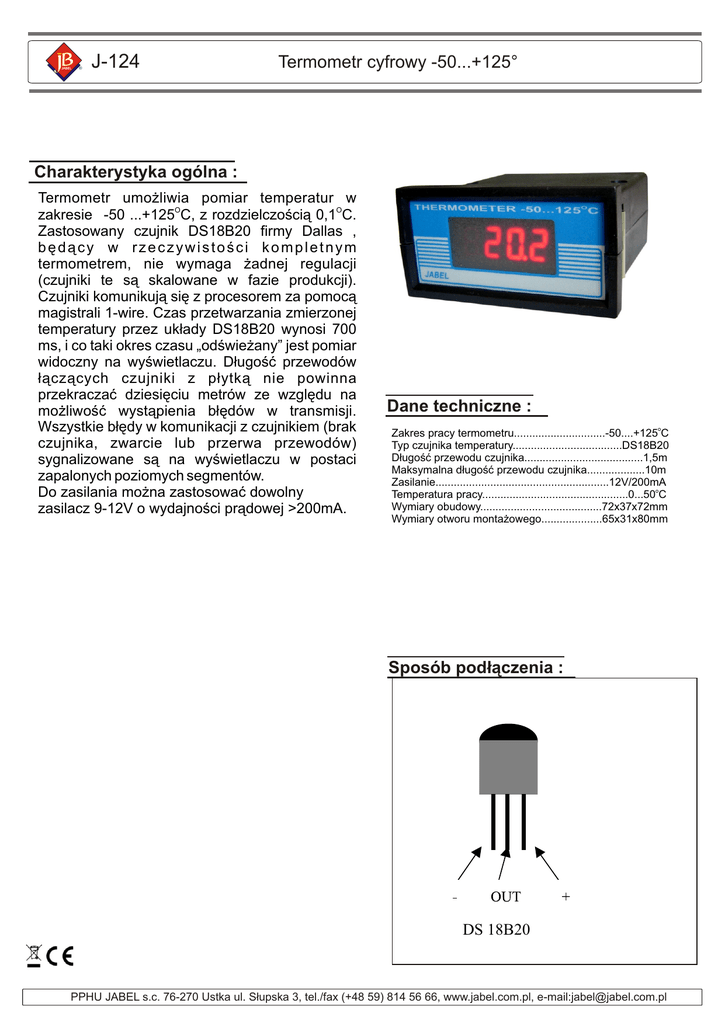 JABEL ® J-124 Termometr cyfrowy -50...+125° Charakterystyka ogólna : Termometr umożliwia pomiar temperatur w zakresie -50 ...+125OC, z rozdzielczością 0,1OC. Zastosowany czujnik DS18B20 firmy Dallas , będący w rzeczywistości kompletnym termometrem, nie wymaga żadnej regulacji (czujniki te są skalowane w fazie produkcji). Czujniki komunikują się z procesorem za pomocą magistrali 1-wire. Czas przetwarzania zmierzonej temperatury przez układy DS18B20 wynosi 700 ms, i co taki okres czasu „odświeżany” jest pomiar widoczny na wyświetlaczu. Długość przewodów łączących czujniki z płytką nie powinna przekraczać dziesięciu metrów ze względu na możliwość wystąpienia błędów w transmisji. Wszystkie błędy w komunikacji z czujnikiem (brak czujnika, zwarcie lub przerwa przewodów) sygnalizowane są na wyświetlaczu w postaci zapalonych poziomych segmentów. Do zasilania można zastosować dowolny zasilacz 9-12V o wydajności prądowej >200mA. Dane techniczne Dane techniczne : Zakres pracy termometru..............................-50....+125oC Typ czujnika temperatury....................................DS18B20 Długość przewodu czujnika.......................................1,5m Maksymalna długość przewodu czujnika...................10m Zasilanie.........................................................12V/200mA Temperatura pracy................................................0...50oC Wymiary obudowy........................................72x37x72mm Wymiary otworu montażowego....................65x31x80mm Sposób podłączenia : DS 18B20 PPHU JABEL s.c. 76-270 Ustka ul. Słupska 3, tel./fax (+48 59) 814 56 66, www.jabel.com.pl, e-mail:[email protected]