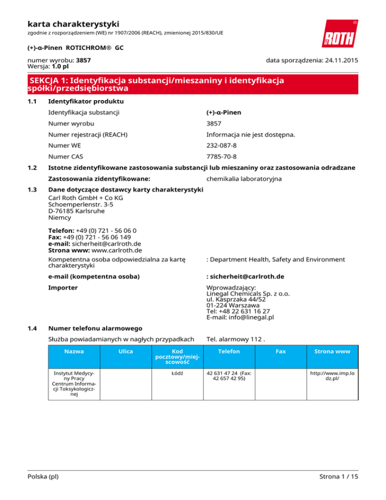 karta charakterystyki zgodnie z rozporządzeniem (WE) nr 1907/2006 (REACH), zmienionej 2015/830/UE (+)-α-Pinen ROTICHROM® GC numer wyrobu: 3857 Wersja: 1.0 pl data sporządzenia: 24.11.2015 SEKCJA 1: Identyfikacja substancji/mieszaniny i identyfikacja spółki/przedsiębiorstwa 1.1 1.2 Identyfikator produktu Identyfikacja substancji (+)-α-Pinen Numer wyrobu 3857 Numer rejestracji (REACH) Informacja nie jest dostępna. Numer WE 232-087-8 Numer CAS 7785-70-8 Istotne zidentyfikowane zastosowania substancji lub mieszaniny oraz zastosowania odradzane Zastosowania zidentyfikowane: 1.3 chemikalia laboratoryjna Dane dotyczące dostawcy karty charakterystyki Carl Roth GmbH + Co KG Schoemperlenstr. 3-5 D-76185 Karlsruhe Niemcy Telefon: +49 (0) 721 - 56 06 0 Fax: +49 (0) 721 - 56 06 149 e-mail: [email protected] Strona www: www.carlroth.de 1.4 Kompetentna osoba odpowiedzialna za kartę charakterystyki : Department Health, Safety and Environment e-mail (kompetentna osoba) : [email protected] Importer Wprowadzający: Linegal Chemicals Sp. z o.o. ul. Kasprzaka 44/52 01-224 Warszawa Tel: +48 22 631 16 27 E-mail: [email protected] Numer telefonu alarmowego Służba powiadamianych w nagłych przypadkach Nazwa Instytut Medycyny Pracy Centrum Informacji Toksykologicznej Polska (pl) Ulica Tel. alarmowy 112 . Kod pocztowy/miejscowość Telefon Łódź 42 631 47 24 (Fax: 42 657 42 95) Fax Strona www http://www.imp.lo dz.pl/ Strona 1 / 15 karta charakterystyki zgodnie z rozporządzeniem (WE) nr 1907/2006 (REACH), zmienionej 2015/830/UE (+)-α-Pinen ROTICHROM® GC numer wyrobu: 3857 SEKCJA 2: Identyfikacja zagrożeń 2.1 Klasyfikacja substancji lub mieszaniny Klasyfikacja zgodnie z rozporządzeniem (WE) nr 1272/2008 (CLP) Klasyfikacja zg. z GHS Sekcja Klasa zagrożenia Klasa i kategoria zagrożenia Zwrot wskazujący rodzaj zagrożenia 2.6 substancja ciekła łatwopalna (Flam. Liq. 3) H226 3.2 działanie żrące/podrażniające na skórę (Skin Irrit. 2) H315 3.4S działanie uczulające na skórę (Skin Sens. 1B) H317 3.10 zagrożenie spowodowane aspiracją (Asp. Tox. 1) H304 4.1A stwarzające zagrożenie dla środowiska wodnego - zagrożenie ostre (Aquatic Acute 1) H400 4.1C stwarzające zagrożenie dla środowiska wodnego - zagrożenie przewlekłe (Aquatic Chronic 1) H410 Uwagi Pełny tekst zwrotów wskazujących rodzaj zagrożenia i zwrotów EUH: zob. SEKCJA 16. 2.2 Elementy oznakowania Oznakowania zgodnie z rozporządzeniem (WE) nr 1272/2008 (CLP) Hasło ostrzegawcze Niebezpieczeństwo Piktogramy Zwroty wskazujące rodzaj zagrożenia H226 H304 H315 H317 H410 Łatwopalna ciecz i pary. Połknięcie i dostanie się przez drogi oddechowe może grozić śmiercią. Działa drażniąco na skórę. Może powodować reakcję alergiczną skóry. Działa bardzo toksycznie na organizmy wodne, powodując długotrwałe skutki. Zwroty wskazujące środki ostrożności Zwroty wskazujące środki ostrożności - zapobieganie P210 P273 P280 Polska (pl) Przechowywać z dala od źródeł ciepła, gorących powierzchni, źródeł iskrzenia, otwartego ognia i innych źródeł zapłonu. Nie palić. Unikać uwolnienia do środowiska. Stosować rękawice ochronne/ochronę oczu. Strona 2 / 15 karta charakterystyki zgodnie z rozporządzeniem (WE) nr 1907/2006 (REACH), zmienionej 2015/830/UE (+)-α-Pinen ROTICHROM® GC numer wyrobu: 3857 Zwroty wskazujące środki ostrożności - reagowanie P301+P310 W PRZYPADKU POŁKNIĘCIA: natychmiast skontaktować się z OŚRODKIEM ZATRUĆ lub z lekarzem. NIE wywoływać wymiotów. P331 Oznakowanie opakowań, których zawartość nie przekracza 125 ml Hasło ostrzegawcze: Niebezpieczeństwo Symbol(-e) 2.3 H304 H317 Połknięcie i dostanie się przez drogi oddechowe może grozić śmiercią. Może powodować reakcję alergiczną skóry. P280 P301+P310 P331 Stosować rękawice ochronne/odzież ochronną/ochronę oczu/ochronę twarzy. W PRZYPADKU POŁKNIĘCIA: natychmiast skontaktować się z OŚRODKIEM ZATRUĆ lub z lekarzem. NIE wywoływać wymiotów. Inne zagrożenia Nie ma dodatkowych informacji. SEKCJA 3: Skład/informacja o składnikach 3.1 Substancje Nazwa substancji (+)-α-Pinen Numer WE 232-087-8 Numer CAS 7785-70-8 Wzór cząsteczkowy C₁₀H₁₆ Masa cząsteczkowa 136,2 g/mol SEKCJA 4: Środki pierwszej pomocy 4.1 Opis środków pierwszej pomocy Uwagi ogólne Zdjąć zanieczyszczoną odzież. Po narażeniu przez drogi oddechowe Należy zadbać o należytą wentylację. W przypadku nieregularnego oddechu lub bezdechu należy natychmiast zgłosić się do lekarza i rozpocząć czynności pierwszej pomocy. Po kontakcie ze skórą Spłukać skórę pod strumieniem wody/prysznicem. Należy udać się do dermatologa. Po kontakcie z oczami Ostrożnie płukać wodą przez kilka minut. Zasięgnąć porady lekarza w przypadku pojawienia się jakichkolwiek wątpliwości, lub jeżeli objawy nie ustępują. Polska (pl) Strona 3 / 15 karta charakterystyki zgodnie z rozporządzeniem (WE) nr 1907/2006 (REACH), zmienionej 2015/830/UE (+)-α-Pinen ROTICHROM® GC numer wyrobu: 3857 Po narażeniu przez przewód pokarmowy Zagrożenie spowodowane aspiracją. NIE wywoływać wymiotów. Natychmiast wezwać lekarza. 4.2 Najważniejsze ostre i opóźnione objawy oraz skutki narażenia Działanie drażniące, Reakcje alergiczne, Nudności, Zagrożenie spowodowane aspiracją 4.3 Wskazania dotyczące wszelkiej natychmiastowej pomocy lekarskiej i szczególnego postępowania z poszkodowanym żadne SEKCJA 5: Postępowanie w przypadku pożaru 5.1 Środki gaśnicze Odpowiednie środki gaśnicze Środki gaśnicze należy dostosować do otoczenia rozpylona woda, piana, suchy proszek gaśniczy, dwutlenek węgla (CO2) Niewłaściwe środki gaśnicze silny strumień wody 5.2 Szczególne zagrożenia związane z substancją lub mieszaniną Palny. Pary są cięższe od powietrza, rozprzestrzeniają się przy podłożu i tworzą z powietrzem mieszaniny wybuchowe. Produkty spalania stwarzające zagrożenie Podczas pożaru mogą