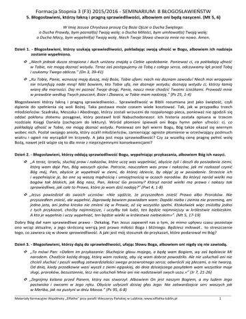 Formacja Stopnia 3 (F3) 2015/2016 - SEMINARIUM: 8 BŁOGOSŁAWIEŃSTW 5. Błogosławieni, którzy łakną i pragną sprawiedliwości, albowiem oni będą nasyceni. (Mt 5, 6) W Imię Jezusa Chrystusa proszę Cię Boże Ojcze o Ducha Świętego: o Ducha Prawdy, bym poznał(a) Twoją wolę; o Ducha Miłości, bym umiłował(a) Twoją wolę; o Ducha Mocy, bym wypełnił(a) Twoją wolę. Niech Twoje Słowo stwarza mnie na nowo. Amen. Dzień 1. - Błogosławieni, którzy szukają sprawiedliwości, pokładając swoją ufność w Bogu, albowiem ich nadzieja zostanie wypełniona. „Niech jednak dusza strapiona i duch uniżony znajdą u Ciebie upodobanie. Ponieważ ci, co pokładają ufność w Tobie, nie mogą doznać wstydu. Teraz zaś postępujemy za Tobą z całego serca, odczuwamy lęk przed Tobą i szukamy Twego oblicza.” (Dn 3, 39-41) „Ku Tobie, Panie, wznoszę moją duszę, mój Boże, Tobie ufam: niech nie doznam zawodu! Niech moi wrogowie nie triumfują nade mną! Nikt bowiem, kto Tobie ufa, nie doznaje wstydu; doznają wstydu ci, którzy łamią wiarę dla marności. Daj mi poznać Twoje drogi, Panie, naucz mnie chodzić Twoimi ścieżkami. Prowadź mnie w prawdzie według Twych pouczeń, Boże i Zbawco, w Tobie mam nadzieję.” (Ps 25, 1-4) Błogosławieni którzy łakną i pragną sprawiedliwości… Sprawiedliwość w Biblii rozumiana jest jako świętość, czyli dążenie do spełnienia się woli Bożej. Taka postawa może czasem wiele kosztować. Tak, jak w przypadku trzech młodzieńców: Szadraka, Meszaka i Abednego, którzy zostali wrzuceni do rozpalonego pieca, ponieważ nie zgodzili się oddać pokłonu złotemu posągowi, który postawił król Nabuchodonozor. Ich historia została opisana w trzecim rozdziale Księgi Daniela (zachęcam do lektury). Wśród płomieni śpiewali oni Bogu hymn pełen ufności: ci, co pokładają ufność w Tobie, nie mogą doznać wstydu. Ponieważ oni byli wierni Bogu, Bóg także okazał się wiernym wobec nich. Posłał swojego anioła, który ocalił młodzieńców, zamieniając ogniste płomienie w orzeźwiający podmuch wiatru i ogień nie wyrządził im krzywdy. A jaka jest moja sprawiedliwość? Czy za wszelką cenę pragnę pełnić wolę Bożą, nawet jeśli wiąże się to dla mnie z nieprzyjemnymi konsekwencjami? Dzień 2. - Błogosławieni, którzy oddają sprawiedliwość Bogu, wypełniając przykazania, albowiem Bóg ich nasyci. „A teraz, Izraelu, słuchaj praw i nakazów, które uczę was wypełniać, abyście żyli i doszli do posiadania ziemi, którą wam daje Pan, Bóg waszych ojców. Patrzcie, nauczałem was praw i nakazów, jak mi rozkazał czynić Bóg mój, Pan, abyście je wypełniali w ziemi, do której idziecie, by objąć ją w posiadanie. Strzeżcie ich i wypełniajcie je, bo one są waszą mądrością i umiejętnością w oczach narodów. Bo któryż naród wielki ma bogów tak bliskich, jak Bóg nasz, Pan, ilekroć Go prosimy? Któryż naród wielki ma prawa i nakazy tak sprawiedliwe, jak całe to Prawo, które ja wam dziś nadaję?” (Pwt 4, 1-8) „Jezus powiedział do swoich uczniów: «Nie sądźcie, że przyszedłem znieść Prawo albo Proroków. Nie przyszedłem znieść, ale wypełnić. Zaprawdę bowiem powiadam wam: Dopóki niebo i ziemia nie przeminą, ani jedna jota, ani jedna kreska nie zmieni się w Prawie, aż się wszystko spełni. Ktokolwiek więc zniósłby jedno z tych przykazań, choćby najmniejsze, i uczyłby tak ludzi, ten będzie najmniejszy w królestwie niebieskim. A kto je wypełnia i uczy wypełniać, ten będzie wielki w królestwie niebieskim»”. (Mt 5, 17-19) Dobry Bóg dał nam sprawiedliwe prawo - Dekalog. Pan Jezus zapewnił nas o tym, że mimo upływu czasu pozostaje ono wciąż aktualne, a jego skróconą wersją jest prawo miłości Boga i bliźniego. Będziesz miłował… to streszczenie tego, co zawiera się w słowie sprawiedliwość. A jaki jest mój stosunek do przykazań, które podarował mi Bóg? Dzień 3. - Błogosławieni, którzy dążą do sprawiedliwości, ufając Słowu Boga, albowiem oni nigdy się nie zawiodą. „To mówi Pan: «Dałem im przykazanie: Słuchajcie głosu mojego, a będę wam Bogiem, wy zaś będziecie Mi narodem. Chodźcie każdą drogą, którą wam rozkażę, aby się wam dobrze powodziło. Ale nie usłuchali ani nie chcieli słuchać i poszli według zatwardziałości swego przewrotnego serca; odwrócili się plecami, a nie twarzą. Od dnia, kiedy przodkowie wasi wyszli z ziemi egipskiej, do dnia dzisiejszego posyłałem wam wszystkie moje sługi, proroków, bezustannie, lecz nie usłuchali Mnie ani nie nadstawiali swych uszu.»” (Jr 7, 21-26) „Zegnijmy kolana przed Panem, który nas stworzył. Albowiem On jest naszym Bogiem, a my ludem Jego pastwiska i owcami w Jego ręku. Obyście usłyszeli dzisiaj głos Jego: Nie zatwardzajcie serc waszych jak w Meriba, jak na pustyni w dniu Massa.” (Ps 95, 6-8) Materiały formacyjne Wspólnoty „Effatha” przy parafii Wieczerzy Pańskiej w Lublinie; www.effatha-lublin.pl 1 Które przykazanie jest pierwsze? Pierwsze jest: Szema Israel (Słuchaj Izraelu). Słuchaj… Słuchaj Mojego głosu, kiedy do ciebie mówię, mój ludu. Usłysz Mój głos i bądź Mi posłuszny. Na tym właśnie polega sprawiedliwość wobec Boga. Jak chcesz wypełnić wolę Bożą, jeśli nie chcesz jej usłyszeć?! Dlaczego twierdzisz, że pragniesz poznać wolę Bożą, skoro nie słuchasz Jego Słowa? Jeżeli uważasz, że słuchasz Słowa Bożego, to dlaczego twoje Pismo Święte jest zamknięte…? Czy na pewno jesteś wierny Bogu i uważnie nasłuchujesz Jego głosu - w Słowie Bożym, w konferencjach i materiałach formacyjnych twojej wspólnoty…? Szema Israel! Dzień 4. - Błogosławieni, którzy pragną sprawiedliwości dla swoich bliźnich, albowiem oni miłują dlatego, że sami zostali umiłowani przez Boga. „Jezus powiedział do swoich uczniów: «Jak Mnie umiłował Ojciec, tak i Ja was umiłowałem