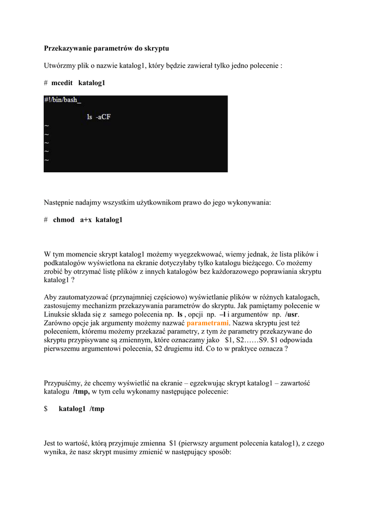 Przekazywanie parametrów do skryptu Utwórzmy plik o nazwie katalog1, który będzie zawierał tylko jedno polecenie : # mcedit katalog1 Następnie nadajmy wszystkim użytkownikom prawo do jego wykonywania: # chmod a+x katalog1 W tym momencie skrypt katalog1 możemy wyegzekwować, wiemy jednak, że lista plików i podkatalogów wyświetlona na ekranie dotyczyłaby tylko katalogu bieżącego. Co możemy zrobić by otrzymać listę plików z innych katalogów bez każdorazowego poprawiania skryptu katalog1 ? Aby zautomatyzować (przynajmniej częściowo) wyświetlanie plików w różnych katalogach, zastosujemy mechanizm przekazywania parametrów do skryptu. Jak pamiętamy polecenie w Linuksie składa się z samego polecenia np. ls , opcji np. –l i argumentów np. /usr. Zarówno opcje jak argumenty możemy nazwać parametrami. Nazwa skryptu jest też poleceniem, któremu możemy przekazać parametry, z tym że parametry przekazywane do skryptu przypisywane są zmiennym, które oznaczamy jako $1, S2……S9. $1 odpowiada pierwszemu argumentowi polecenia, $2 drugiemu itd. Co to w praktyce oznacza ? Przypuśćmy, że chcemy wyświetlić na ekranie – egzekwując skrypt katalog1 – zawartość katalogu /tmp, w tym celu wykonamy następujące polecenie: $ katalog1 /tmp Jest to wartość, którą przyjmuje zmienna $1 (pierwszy argument polecenia katalog1), z czego wynika, że nasz skrypt musimy zmienić w następujący sposób: $1 przybiera zawsze wartość pierwszego argumentu polecenia w tym wypadku /tmp, jeżeli chcielibyśmy obejrzeć zawartość katalogu /usr to musimy wykonać polecenie: # ./katalog /usr $1 przybierze w tym wypadku wartość /usr Dodajmy, że istnieje także zmienna $0 zawiera ona nazwę skryptu (polecenia). Wiemy, że możemy skryptowi przekazać 9 parametrów od $1 do $9. Przećwiczmy problem parametrów praktycznie. W tym celu utworzymy plik o nazwie skrypt2. $ mcedit skrypt2 Następnie – po nadaniu odpowiednich praw skryptowi (jeżeli użytkownik tych praw nie posiada) wyegzekwujmy skrypt1 w następujący sposób: ....$1 $2 $3 $ ./skrypt1 89 34 21 Na ekranie powinny pojawić się napisy: Zmienne oznaczone znakiem $ mogą w linii poleceń egzekucji skryptu przybierać także wartości następujące: $* → reprezentuje wszystkie zmienne, niezależnie od ich liczby $# → pokazuje liczbę podanych zmiennych $@ → argumenty linii poleceń są „cytowane” pojedynczo Bardzo ważna jest różnica między wyrażeniami $* (wszystkie zmienne) i $# (liczba zmiennych). Pierwsza wartość ($*) odnosi się do wszystkiego, co jest w wierszu poleceń, od $1 do nieskończoności (choć tak naprawdę w każdej powłoce jest jakiś limit zmiennych). Druga wartość ($#) nie odnosi się do samych zmiennych, ale zwraca ich liczbę. Aby pokazać tę różnicę, rozważmy poniższe skrypty. Utwórzmy skrypt pod nazwą skrypt3 który zawierał będzie tylko: $ mcedit skrypt3 $ ./skrypt3 x y z q x y z q zmieńmy teraz skrytp 3 i porównajmy wyniki obu wersji: $ ./skrypt3 x y z q 4 Jak więc widzimy zmienna S* odnosi się do wszystkich argumentów z linii poleceń natomiast zmienna $# liczy te argumenty. Jaka jest w takim razie różnica pomiędzy zmienną $* a zmienną $@ ? Obie robią to samo jednak zmienna $@ pozwala na osobne użycie każdego z nich. Różnica pomiędzy tymi zmiennymi nie jest zbyt widoczna, dopóki nie użyjemy ich do argumentów używających strukturę kontrolną pętli for-in. W zarządzaniu zmiennymi $ definiowanymi przez system możemy użyć polecenia shift. Polecenie to bierze wszystkie zmienne począwszy od $1 i zmniejsza ich liczbę o jeden. Zmienna $0 nigdy się nie zmienia, ale kiedy używamy polecenia shift po raz pierwszy to $2 staje się $1, $3 staje się $2 itd. Proces ten powtarza się przy każdorazowym użyciu polecenia shift. Utwórzmy skrypt4: $ mcedit skrypt4 Dokonamy teraz egzekucji skrypt4 z następującymi argumentami: $ skrypt4 raz dwa trzy cztery Polecenie shift nie wie, ani czy zmienne istnieją, ani ile ich jest. W przypadku dużej liczby zmiennych nie stanowi to problemu, ale w przypadku małej liczby zmiennych można nieświadomie przesuwać nieistniejące zmienne, co może powodować wyświetlanie pustych wierszy, a czasami nawet komunikatów o błędach. Jeśli w powyższym przykładzie podamy w wierszu poleceń tylko jedna zmienną, wygenerowany zostanie następujący komunikat o błędzie: shift : shift skrtpt4 must be <= $#
