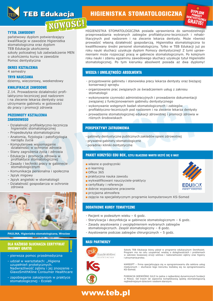 HIGIENISTKA STOMATOLOGICZNA DYPLOM POM DENTYS OCY TYCZNE GRATIS ! TYTUŁ ZAWODOWY państwowy dyplom potwierdzający kwalifikacje w zawodzie Higienistka stomatologiczna oraz dyplom TEB Edukacja ukończenia szkoły policealnej lub zaświadczenie MEN o ukończeniu kursu w zawodzie Pomoc dentystyczna J HIGIENISTKA STOMATOLOGICZNA posiada uprawnienia do samodzielnego przeprowadzania wybranych zabiegów profilaktyczno-leczniczych i rehabilitacyjnych pod nadzorem i na zlecenie lekarza dentysty. Może również prowadzić własną działalność gospodarczą. Higienistka stomatologiczna to kwalifikowany średni personel stomatologiczny. Tylko w TEB Edukacji już po roku nauki słuchacz uzyskuje dyplom Pomocy dentystycznej! Z tymi uprawnieniami może rozpocząć pracę w gabinecie stomatologicznym. Po kolejnym roku nauki i zdaniu egzaminu zawodowego słuchacz uzyskuje tytuł Higienistki stomatologicznej. Po tym kierunku absolwent posiada aż dwa dyplomy! OKRES KSZTAŁCENIA 4 semestry WIEDZA I UMIEJĘTNOŚCI ABSOLWENTA TRYB NAUCZANIA dzienny, wieczorowy, weekendowy KWALIFIKACJE ZAWODOWE Z.14. Prowadzenie działalności profilaktyczno-leczniczej pod nadzorem i na zlecenie lekarza dentysty oraz utrzymanie gabinetu w gotowości do pracy i promocji zdrowia PRZEDMIOTY KSZTAŁCENIA ZAWODOWEGO - Działalność profilaktyczno-lecznicza higienistki stomatologicznej - Propedeutyka stomatologiczna - Anatomia, fizjologia i patofizjologia narządu żucia - Komputerowe wspomaganie działalności w ochronie zdrowia - Stany zagrożenia życia i zdrowia - Edukacja i promocja zdrowia w profilaktyce stomatologicznej - Zasady i techniki pracy w gabinecie stomatologicznym - Komunikacja personalna i społeczna - Język migowy - Język angielski w stomatologii - Działalność gospodarcza w ochronie zdrowia - przygotowanie gabinetu i stanowiska pracy lekarza dentysty oraz bieżącej konserwacji sprzętu - organizowanie prac związanych ze świadczeniem usług z zakresu stomatologii - wykonywanie czynności administracyjnych i prowadzenie dokumentacji związanej z funkcjonowaniem gabinetu dentystycznego - wykonywanie wstępnych badań stomatologicznych i zabiegów profilaktyczno-leczniczych pod nadzorem i na zlecenie lekarza dentysty - prowadzenie stomatologicznej edukacji zdrowotnej i promocji zdrowia w różnych środowiskach PERSPEKTYWY ZATRUDNIENIA - gabinety dentystyczne publicznych zakładów opieki zdrowotnej - prywatne gabinety stomatologiczne - poradnie i kliniki dentystyczne PAKIET KORZYŚCI EDU BOX, CZYLI DLACZEGO WARTO UCZYĆ SIĘ U NAS! - własne e-podręczniki e-learning Office 365 praktyczna nauka zawodu wykwalifikowani nauczyciele-praktycy certyfikaty i referencje EDU dobrze wyposażone pracownie PA K I E T K O R Z Y Ś C I przyjazna atmosfera zajęcia na specjalistycznym programie komputerowym KS-Somed BOX DODATKOWE KURSY TEMATYCZNE PAULINA, Higienistka stomatologiczna, Wrocław DLA KAŻDEGO SŁUCHACZA CERTYFIKAT IMIENNY GRATIS - pierwsza pomoc przedmedyczna - Pacjent w podeszłym wieku – 6 godz. - Sterylizacja i dezynfekcja w gabinecie stomatologicznym – 6 godz. - Zasady asystowania z uwzględnieniem wybranych zabiegów stomatologicznych. Zespół stomatologiczny – 8 godz. - Asystowanie podczas zabiegów chirurgicznych – 5 godz. NASI PARTNERZY Szkoły TEB Edukacja biorą udział w programie edukacyjnym DentAssist. Program ma na celu uzupełniać wiedzę o dolegliwościach i problemach w zakresie kwasowej erozji szkliwa i nadwrażliwości zębiny oraz higieny i utrzymania protez. - udział w warsztatach: „Higiena uzupełnień protetycznych. Nadwrażliwość zębiny i jej znoszenie – GlaxoSmithKline Consumer Healthcare KAMSOFT – firma specjalizująca się w oprogramowaniu dla sektora usług medycznych – słuchacze tego kierunku kształcą się na oprogramowaniu KS-Somed. - zapobieganie zakażeniom w praktyce stomatologicznej - Ecolab FUNDACJA WIEWIÓRKI JULII to jedna z najbardziej dynamicznych fundacji w Polsce. Od trzech lat zapewnia kompleksową opiekę stomatologiczną najbiedniejszym dzieciom i osobom starszym. www.teb.pl